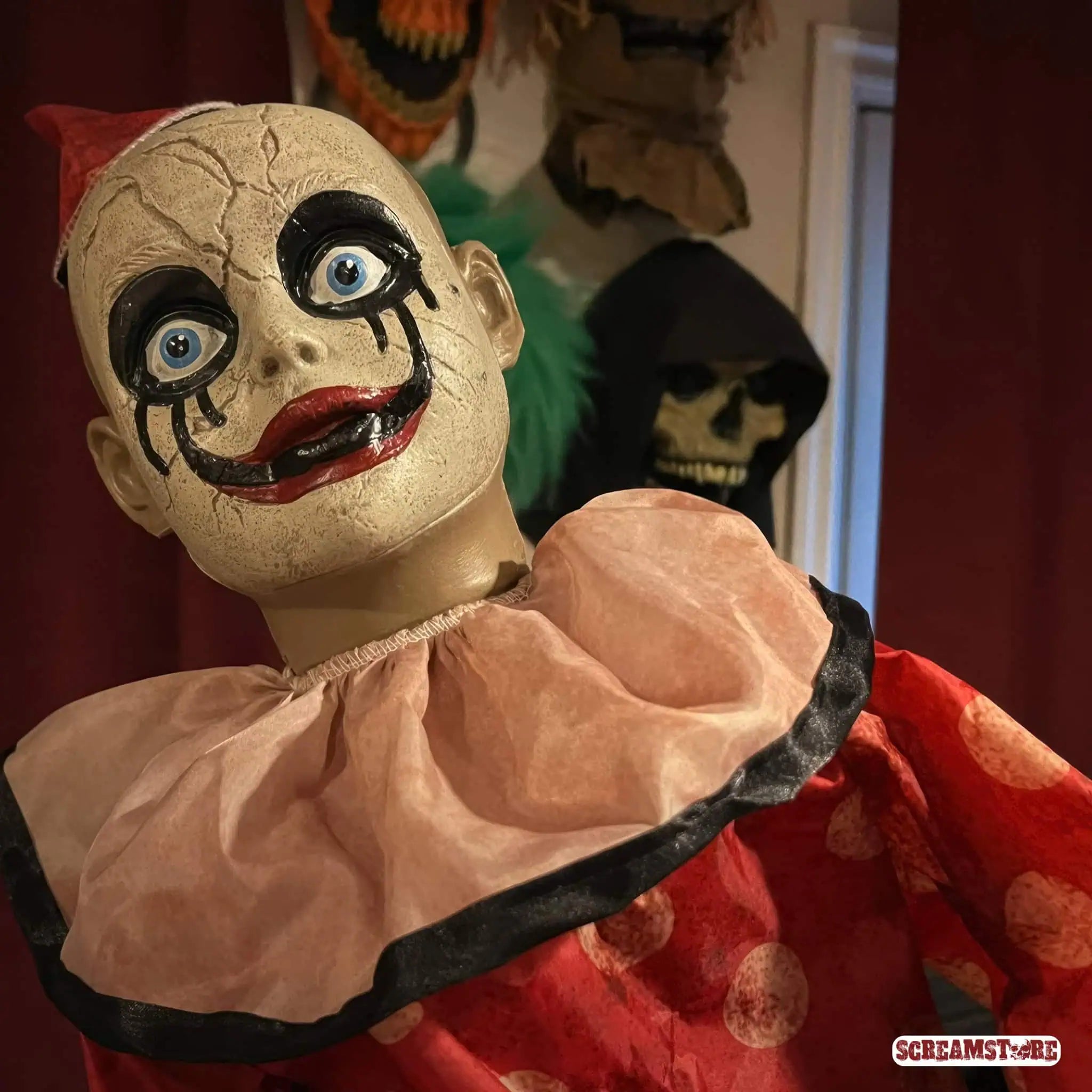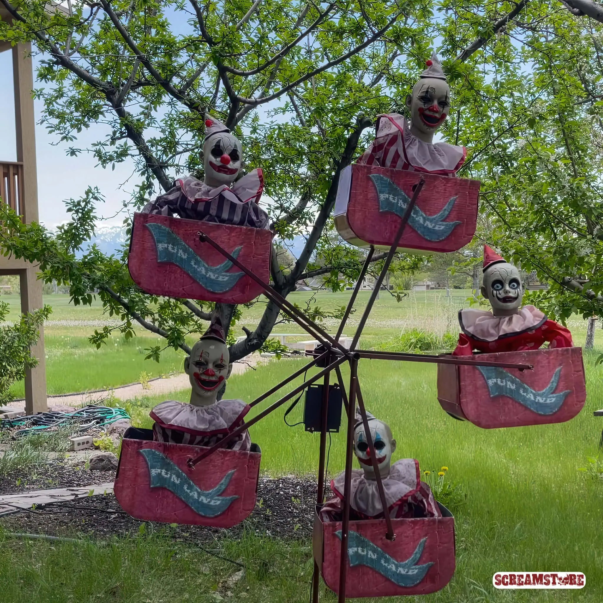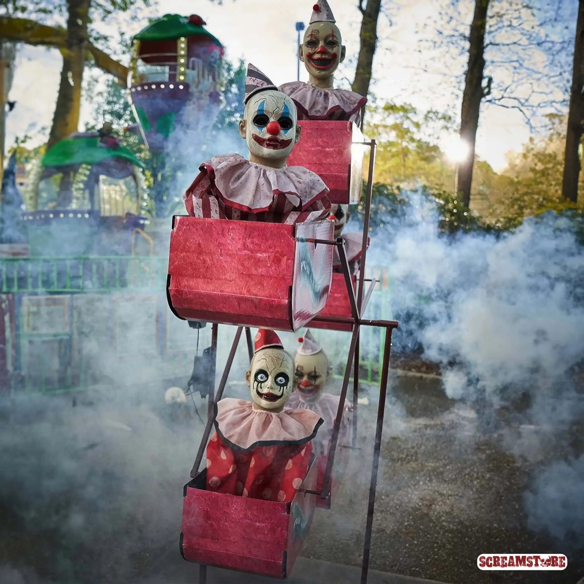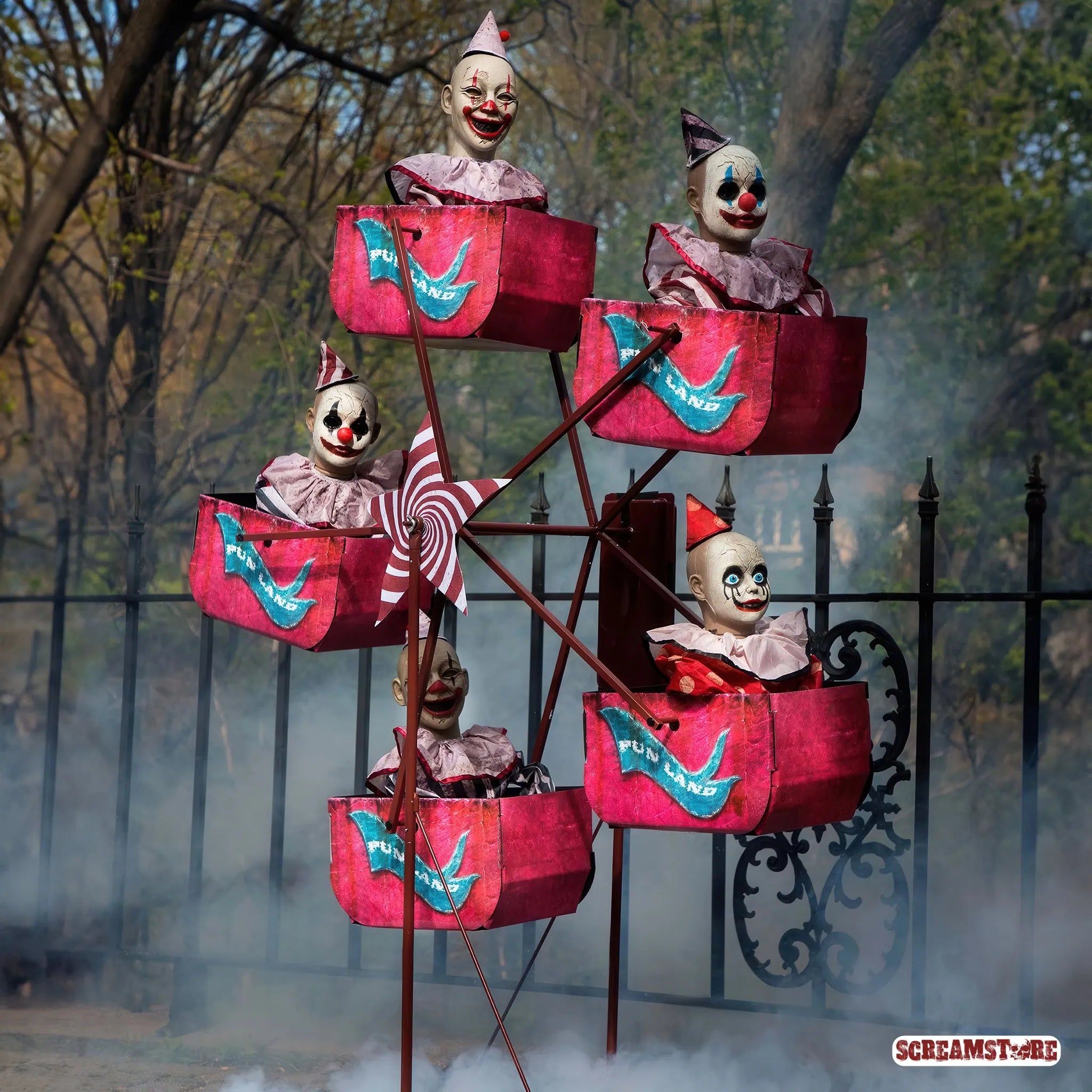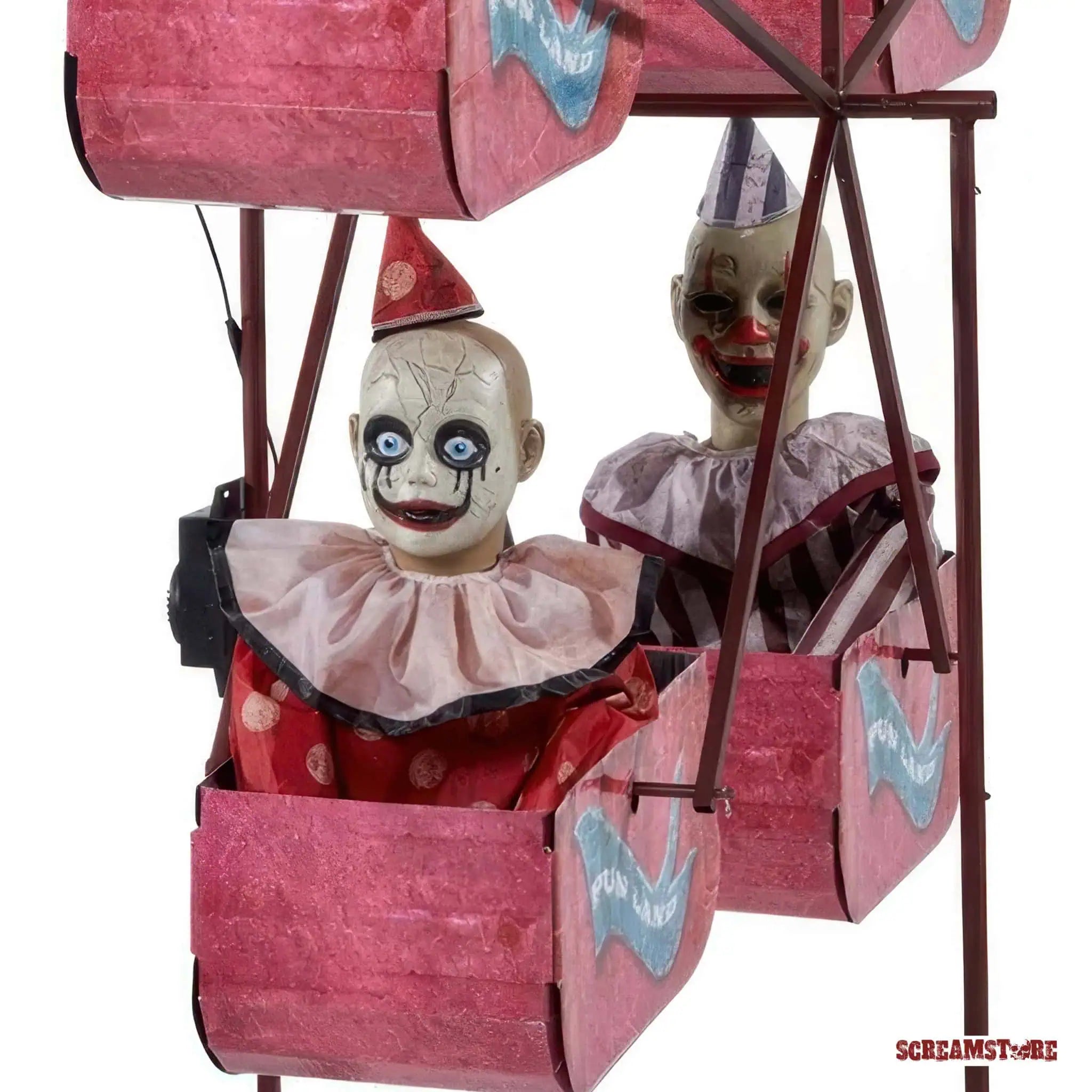 Einsteigen und ab ins Verderben. Dieses Riesenrad dreht keine Runden – es zieht Kreise im Kopf. Sechs starrende Clowns, bleich wie Leichentücher, sitzen reglos in ihren Gondeln und lassen sich langsam ins Nichts rotieren. Keine Bewegung, kein Blinzeln – nur das kalte Grauen auf Dauerschleife. Dazu eine kranke Melodie wie aus der Spieluhr Satans, die dich mit jeder Umdrehung ein Stück weiter ins Delirium schaukelt. Jahrmarkt war gestern – das hier ist ein Totentanz mit Clownslizenz. Profi-Animatronic der Spitzenklasse, direkt aus den USA importiert. Großartig. Furchteinflößend. Limitiert. Und absolut nichts für schwache Nerven.