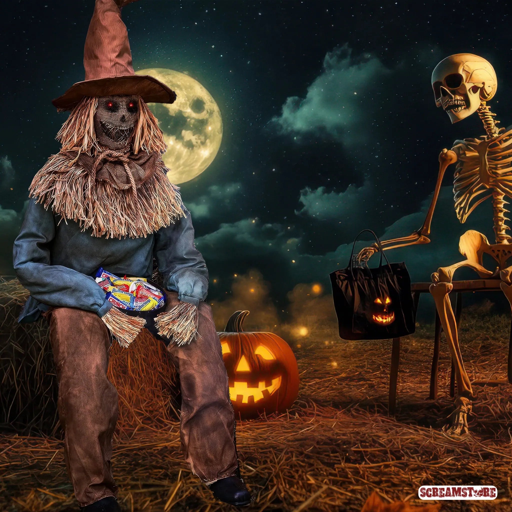 Diese Vogelscheuche hat genug: von Krähen, von Kindern, von Karneval. Jahrzehntelang war sie das Ziel von Spott, Obst und schlechtem Wetter – jetzt ist sie dran mit Austeilen. Und sie wartet. Geduldig. Mitten in deiner Deko. Direkt an der Tür. Ein Griff zur Schale – und der Albtraum beginnt. Geräusche, die nicht von dieser Welt sind. Ein Gesicht, das mehr Qual als Kürbis kennt. Und ein Effekt, der jede brave Seele zurück in den Kinderwagen treibt. Perfekt für Eingänge, Flure oder Ecken, in denen die Leute sich sicher fühlen – bis sie näherkommen. Stroh im Kopf? Mag sein in ihren Adern fliesst purer Jumpscare Halloween Horror vom Feinsten. Jetzt ist Erntezeit!