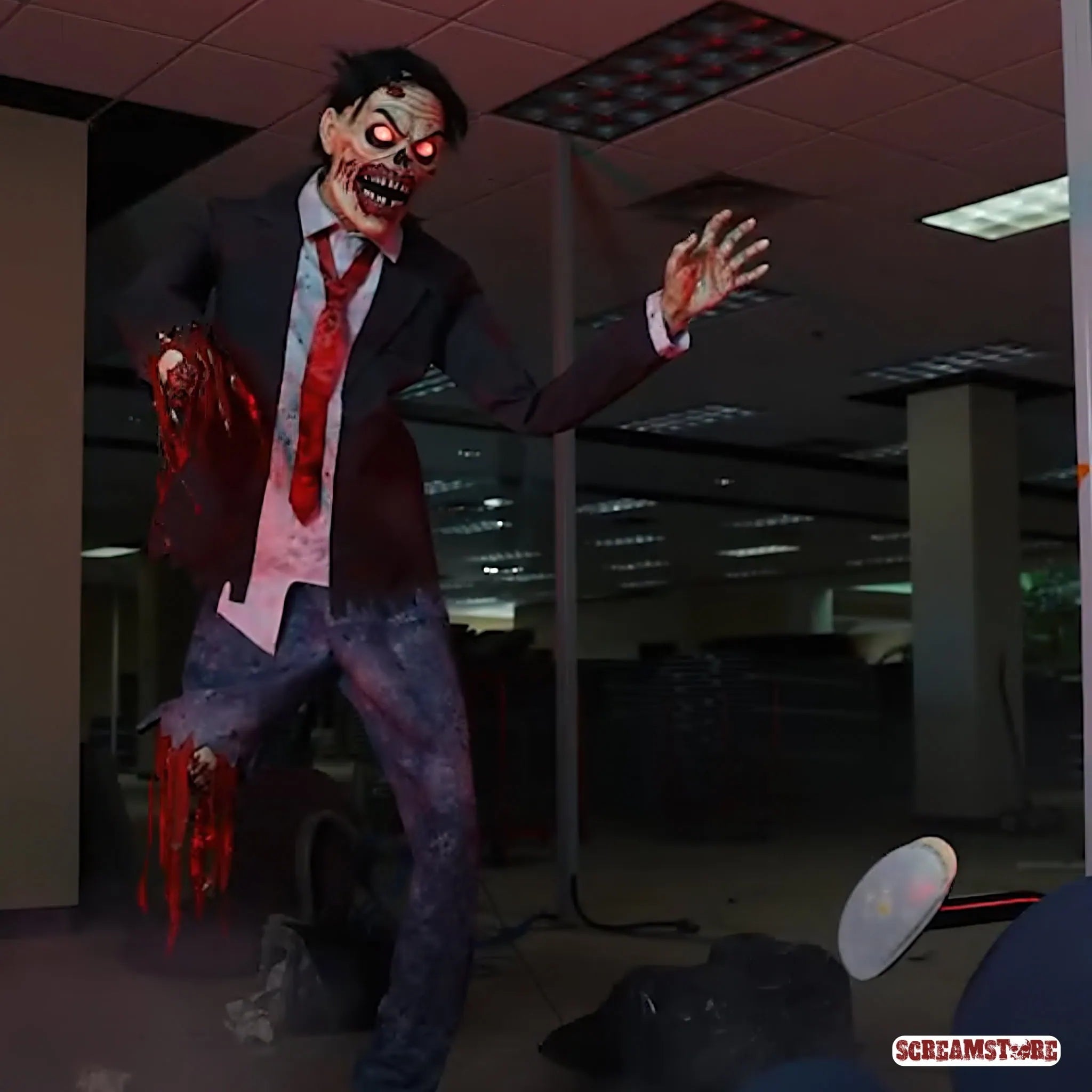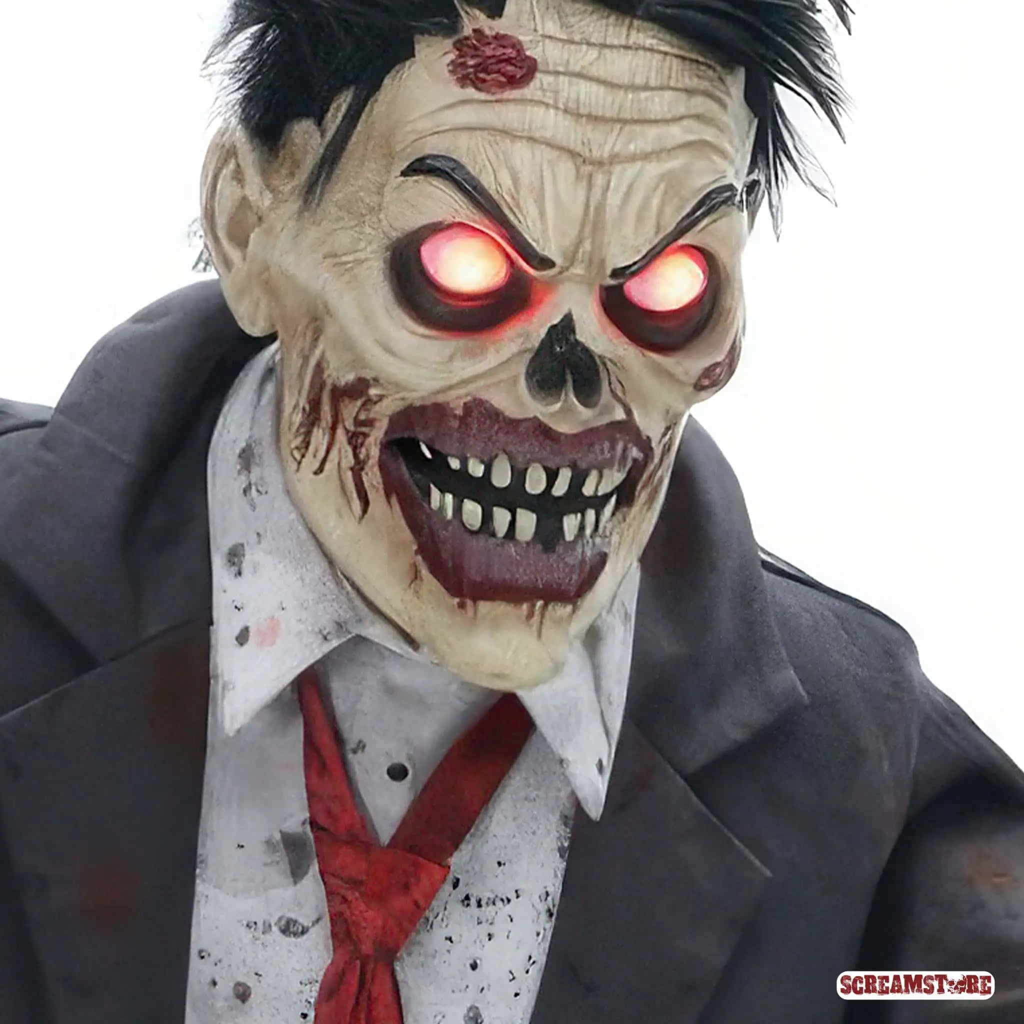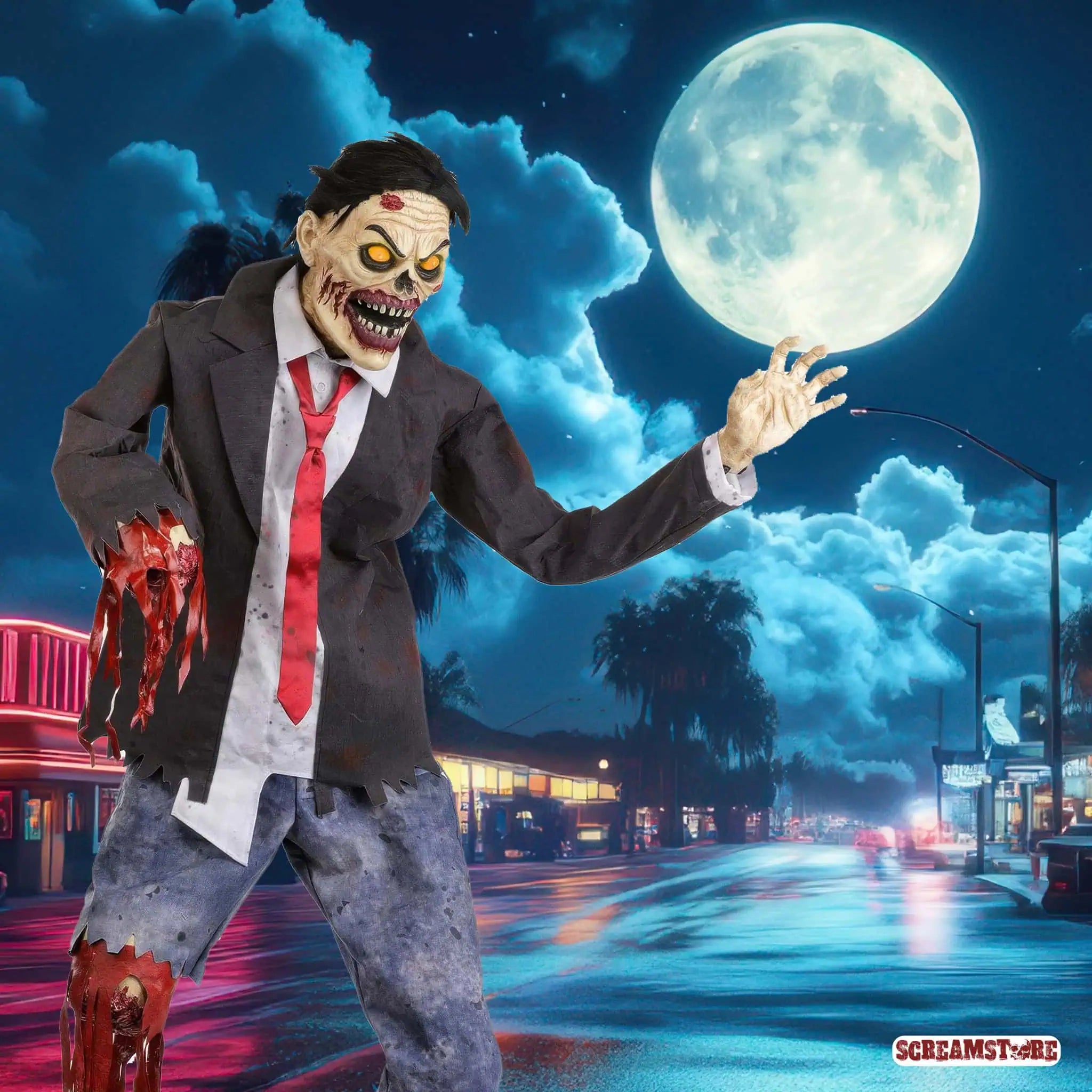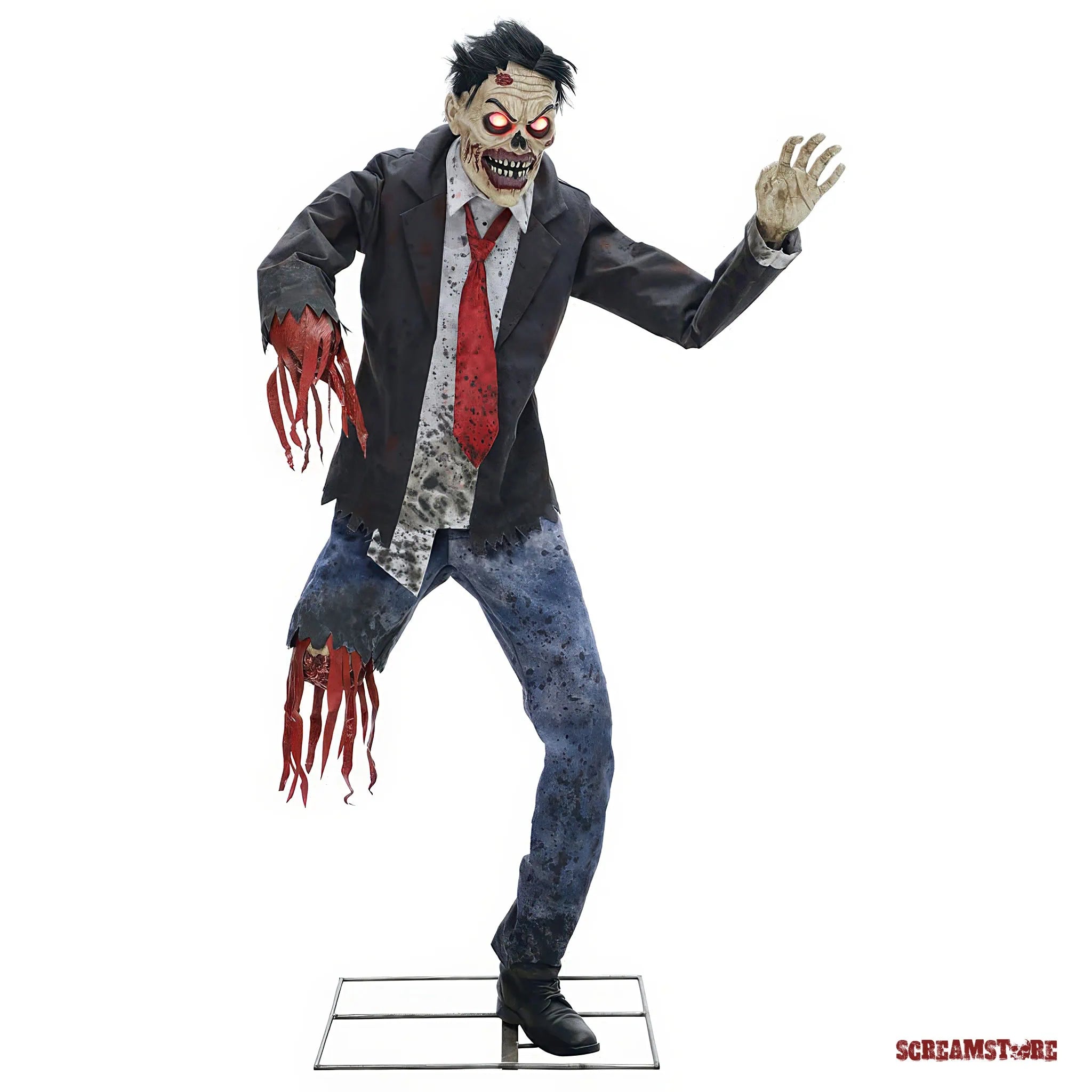 Totes Bürofleisch XL! Dieser Kollege hat seinen letzten Pitch wohl nicht überlebt – oder sich mit einem sehr hungrigen Rasenmäher angelegt. Ein Arm fehlt, das Bein sieht aus wie Gulasch, aber die Augen glühen noch vor Hunger. Und das Grinsen? Eine Mischung aus Kündigung und Kannibalismus. Diese lebensgroße Profi-Animatronic schlurft mit leuchtenden Augen, irre zuckenden Bewegungen und Soundeffekten direkt in deine schlimmsten Überstunden. Der perfekte Horror für Chefetage, Kellerverlies – oder die perfekte Geisterbahn. Afterwork meets Afterlife. Buche Franky – den krassesten Stechuhrstecher aller Zeiten. Wie frisch vom Leichenschauhaus Laufsteg gecastet. Hält garantiert jede Deadline ein. Auch Deine!