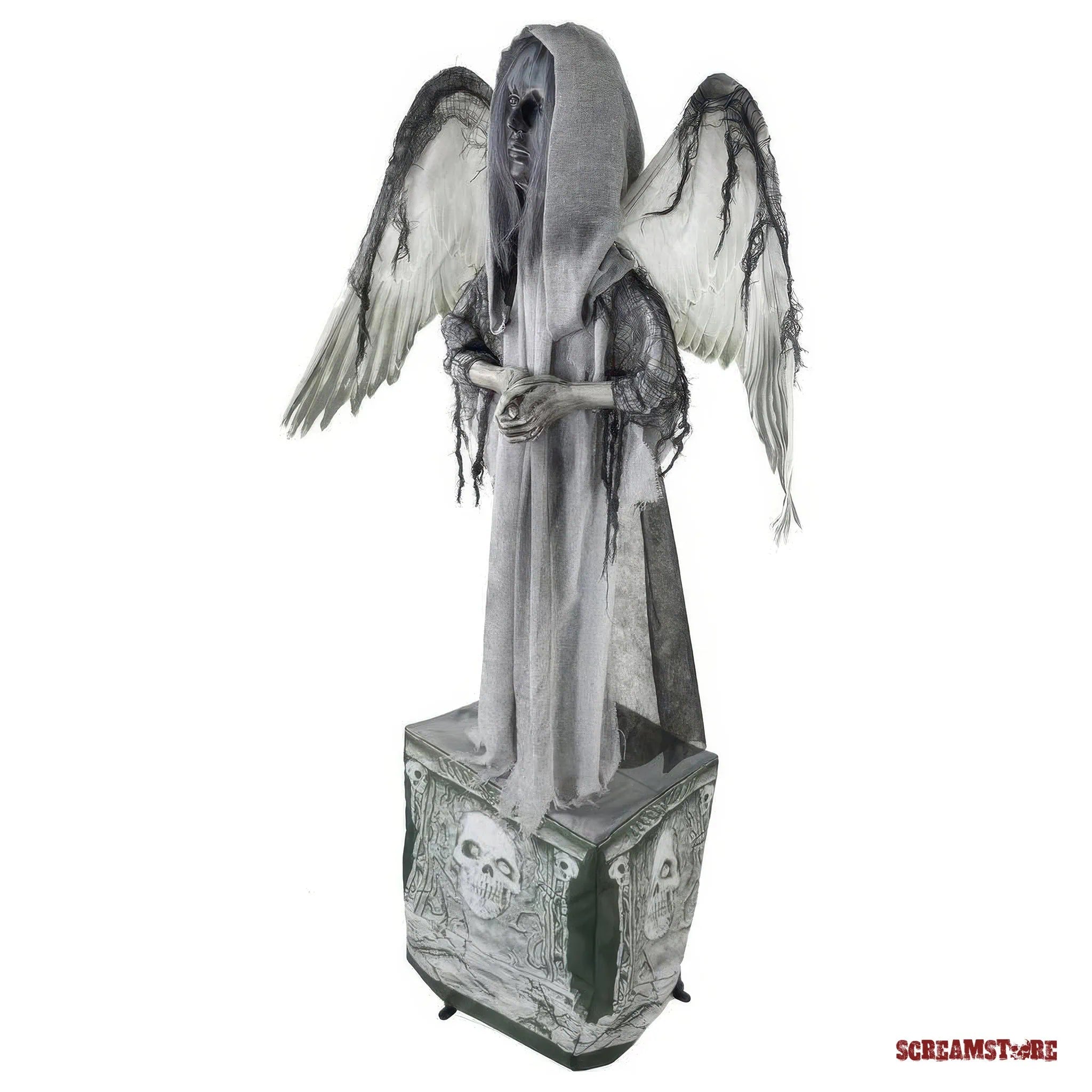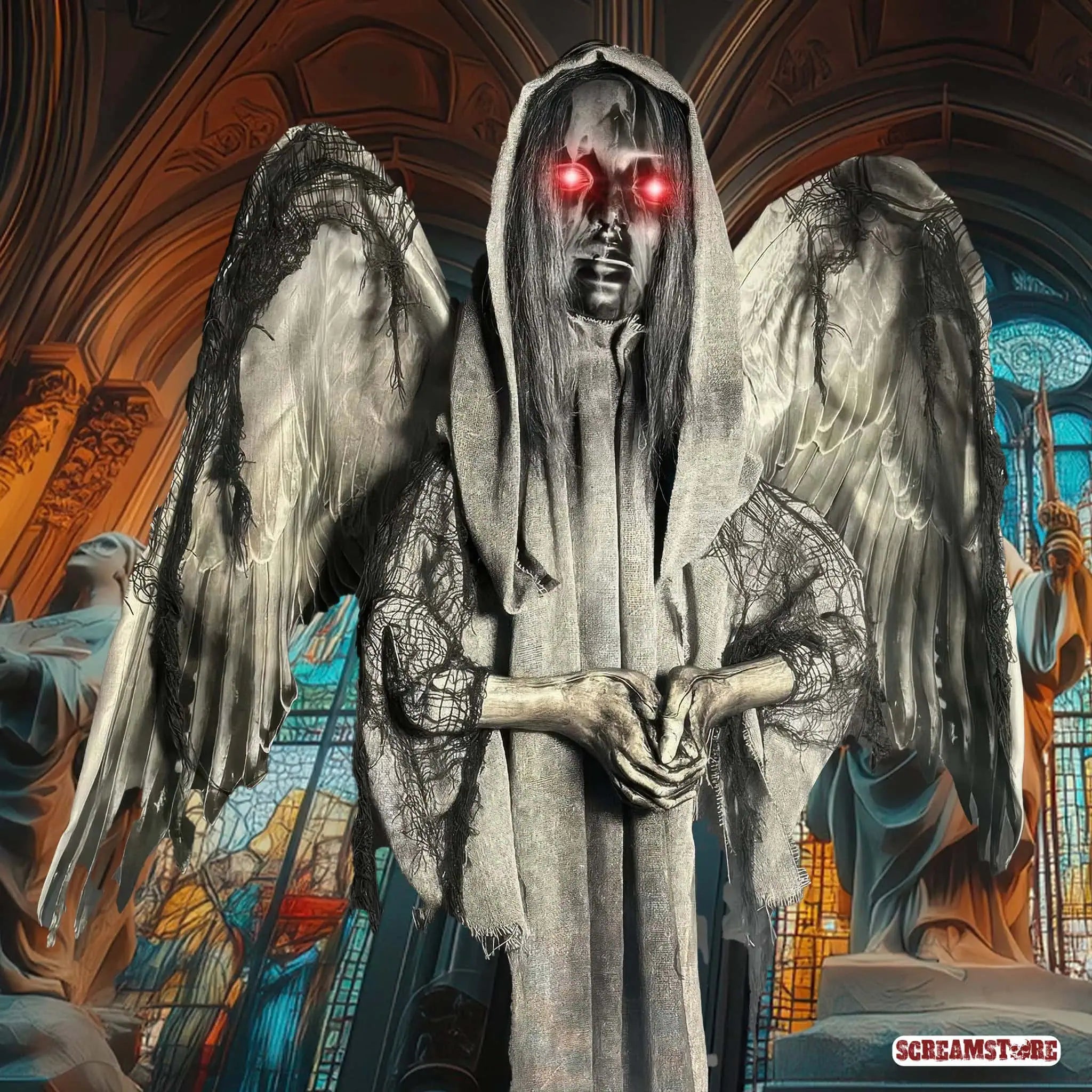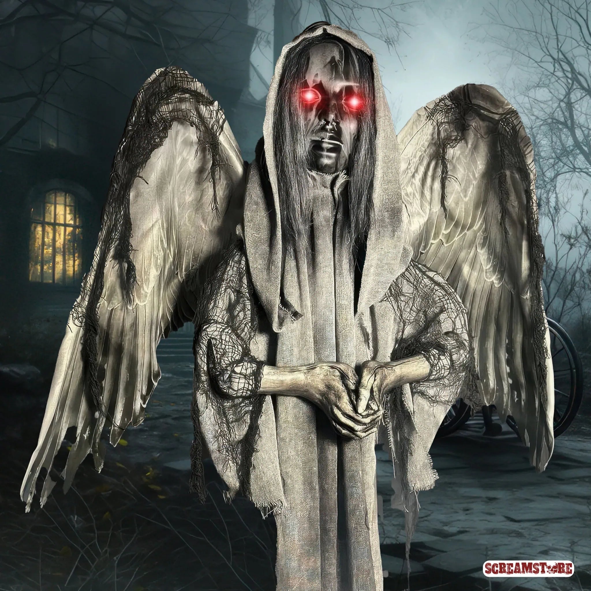 Diesem Engel ist nichts heilig – vor allem keine Menschen. Auf Lebendige reagiert er allergisch… und trachtet danach, sie unter seine tödlichen Fittiche zu nehmen. Kommt jemand zu nah, beginnt das Grauen: panisches Schütteln, irrsinniges Gezappel, gequältes Heulen und wimmernde Schreie, wie geflüsterte Flüche aus dem Jenseits. Seine Augen brennen wie Höllenglut, während die zerfetzten Flügel zu flattern beginnen. Das ganze Wesen bebt vor innerem Zorn. Diese Profi-Animatronic bringt Bewegung, Licht und Sound in apokalyptischer Perfektion – und macht aus deinem Vorgarten ein verlorenes Kapitel der Offenbarung. Halte dich fern… und erspare deinem Schutzengel eine epische Auseinandersetzung mit dem Bösen.