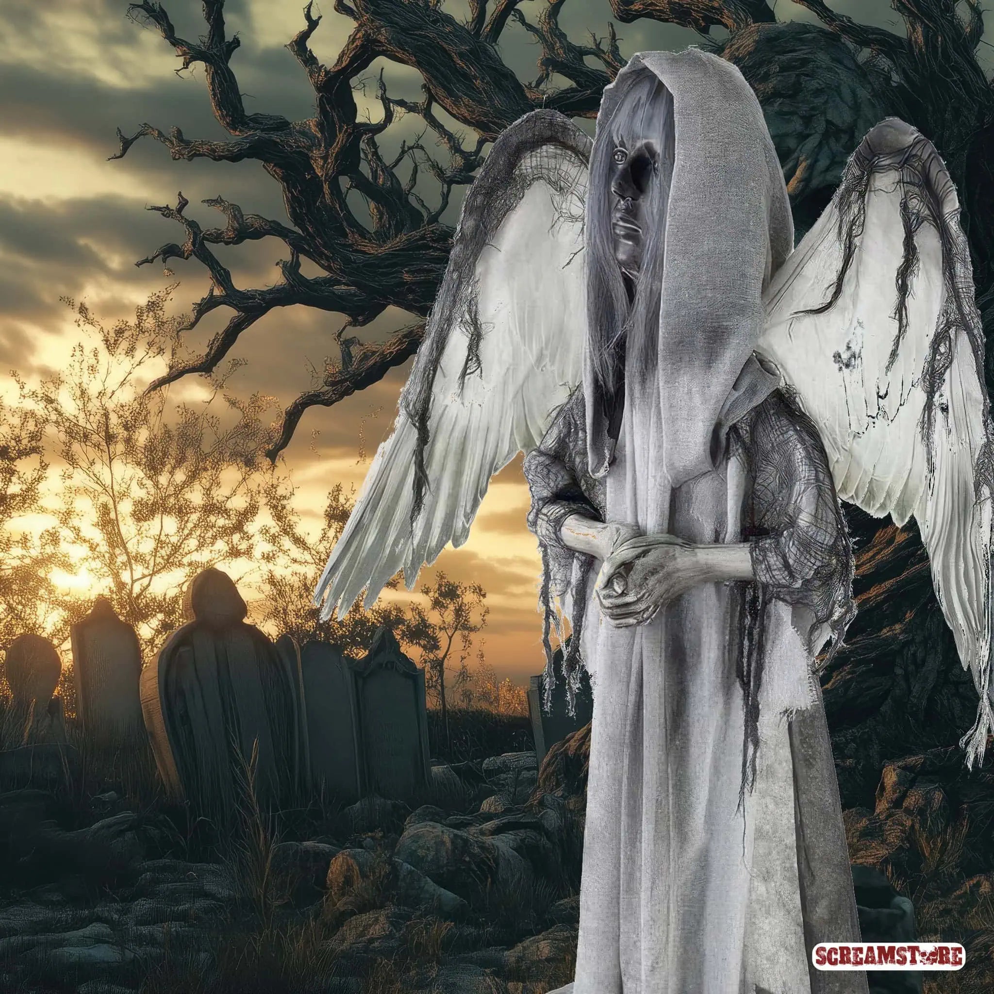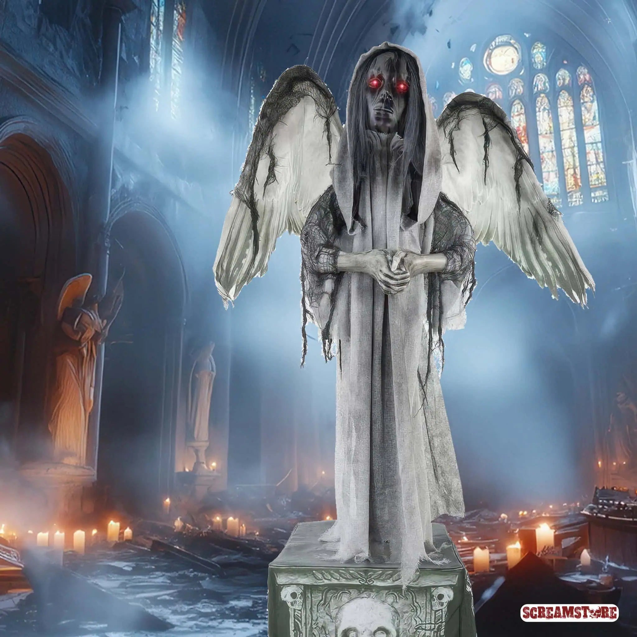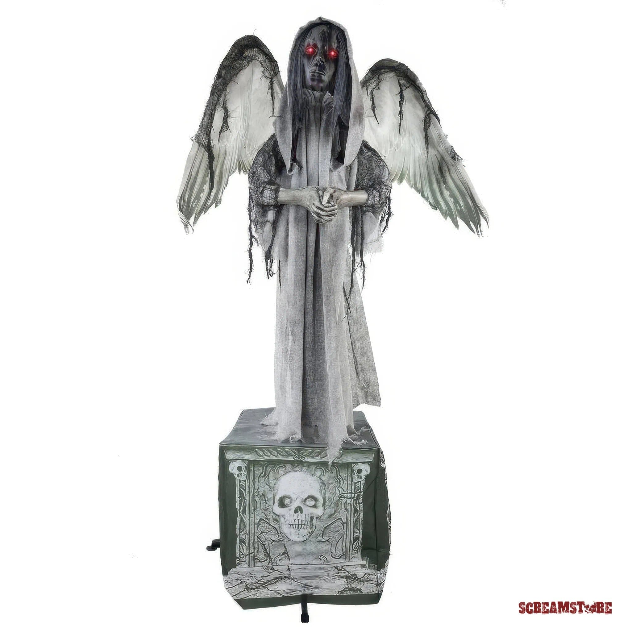 Diesem Engel ist nichts heilig – vor allem keine Menschen. Auf Lebendige reagiert er allergisch… und trachtet danach, sie unter seine tödlichen Fittiche zu nehmen. Kommt jemand zu nah, beginnt das Grauen: panisches Schütteln, irrsinniges Gezappel, gequältes Heulen und wimmernde Schreie, wie geflüsterte Flüche aus dem Jenseits. Seine Augen brennen wie Höllenglut, während die zerfetzten Flügel zu flattern beginnen. Das ganze Wesen bebt vor innerem Zorn. Diese Profi-Animatronic bringt Bewegung, Licht und Sound in apokalyptischer Perfektion – und macht aus deinem Vorgarten ein verlorenes Kapitel der Offenbarung. Halte dich fern… und erspare deinem Schutzengel eine epische Auseinandersetzung mit dem Bösen.