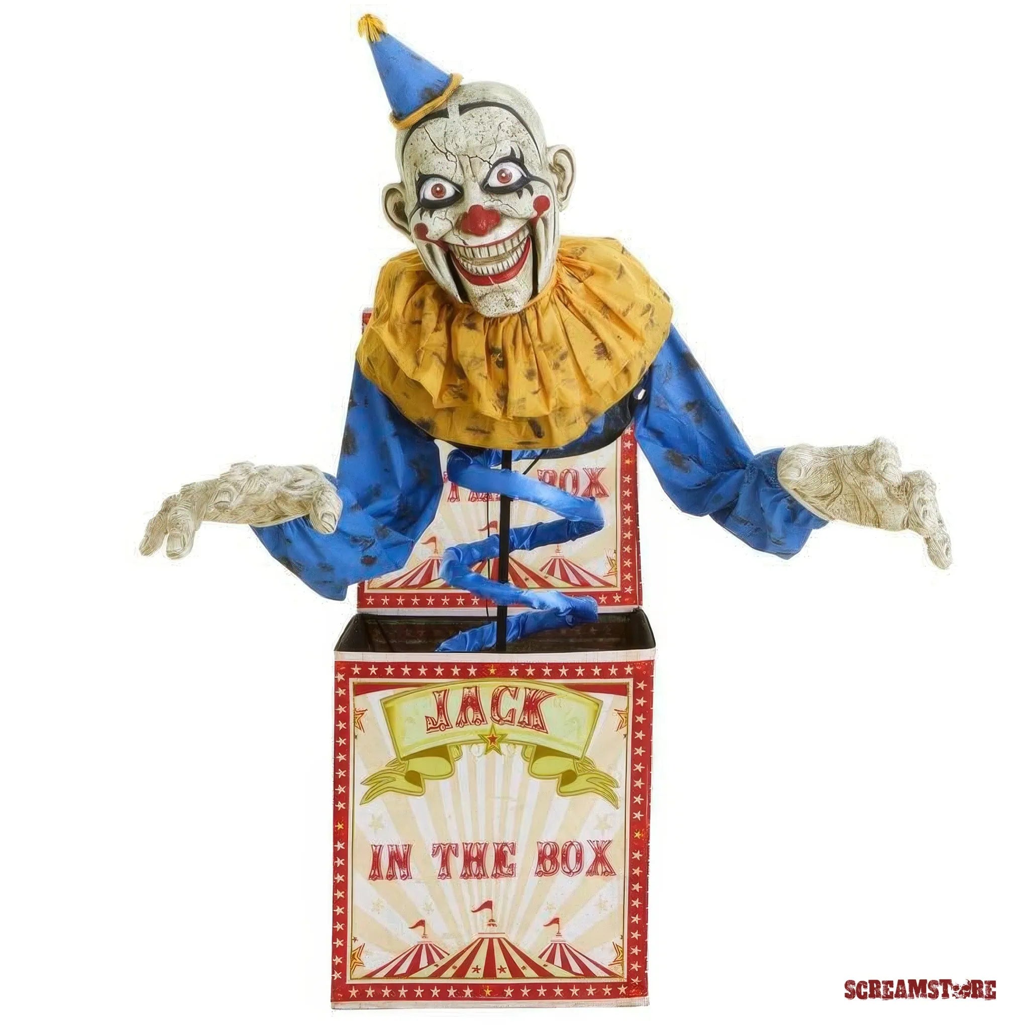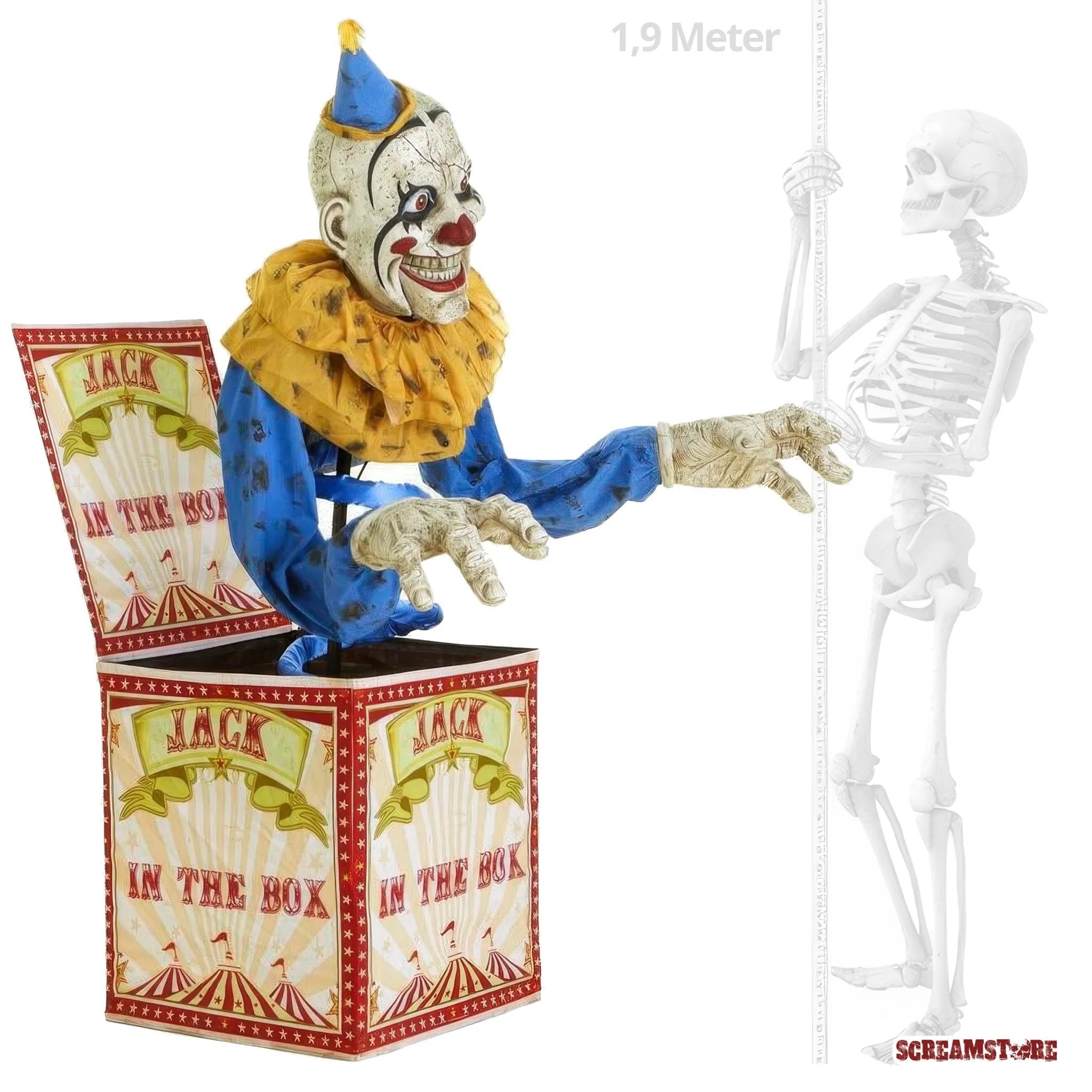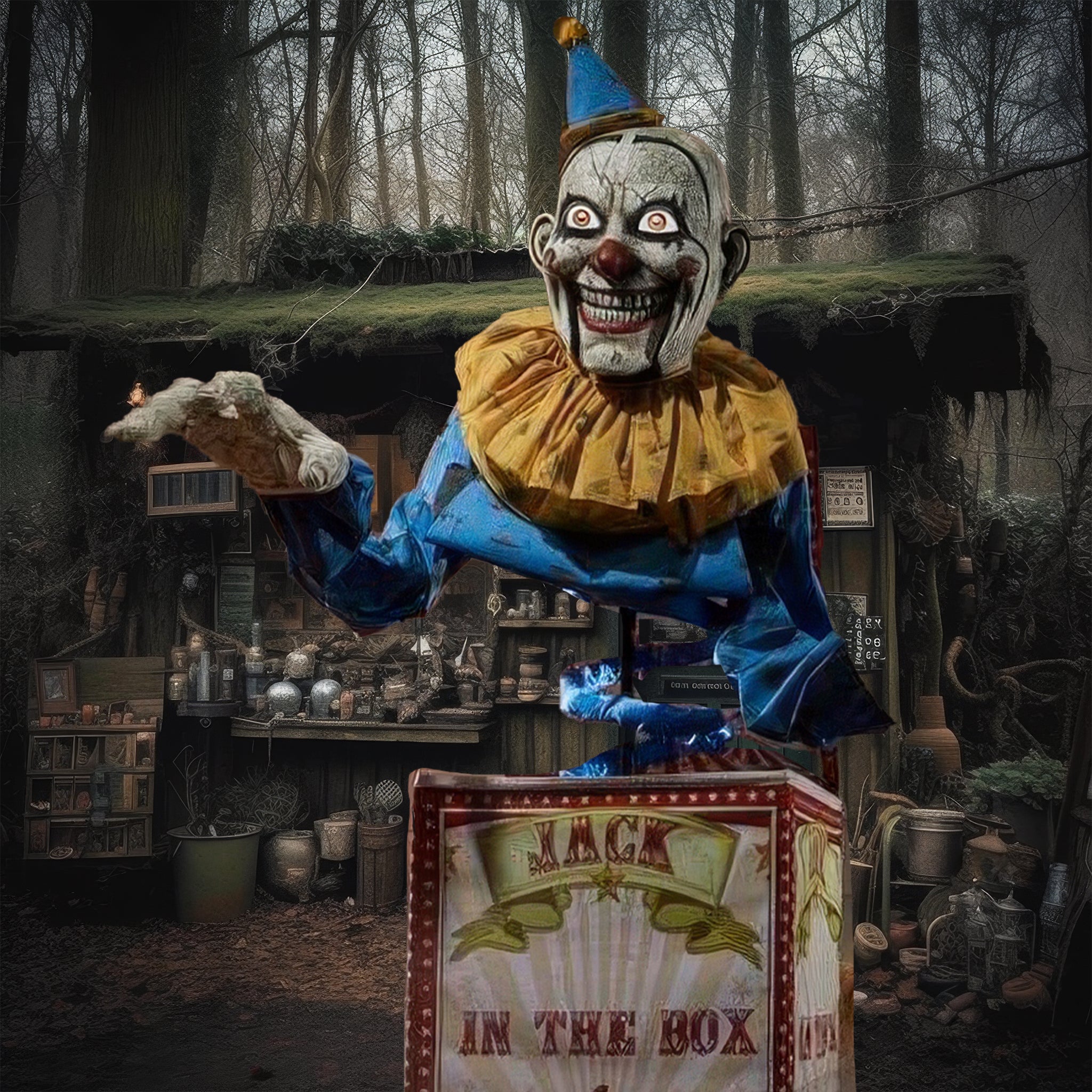 Clowns lieben Kinder? Also Jack nicht. Der hasst generell jeden, egal wie alt oder jung. Zu gerne lockt er dumme Menschlein mit seiner lustigen Box an, die aussieht wie ein großes buntes Geschenk. Unboxing-geil gesteuert treibt er die ahnungslosen Wesen in seine perfide Falle, Denn hinter der grinsenden Fassade verbirgt sich Angst, Folter und Tod. Klingt verlockend? Na dann hol Dir dieses schöne bunte Box nach Hause. Wir versprechen: Dieses Schachtelfest bleibt für alle in Albtraumhafter Erinnerung. Sagenhafte XXL-Animatronic direkt aus den USA, meisterhaft gestaltet und voller düsterer Magie. Ergreife sie, bevor sie dich ergreift!
