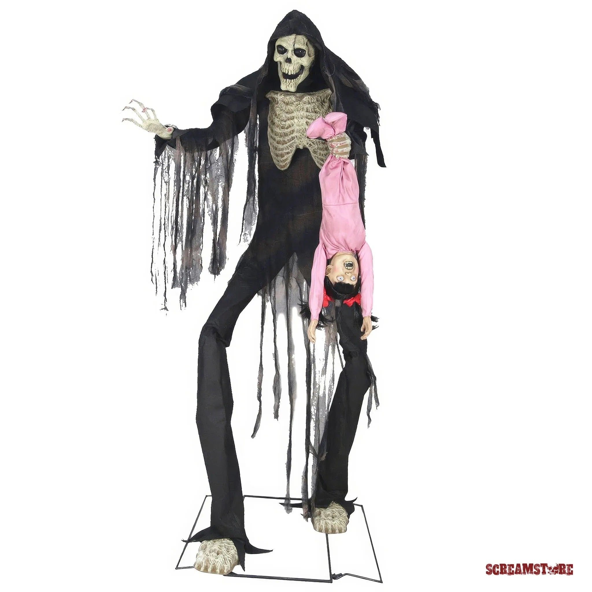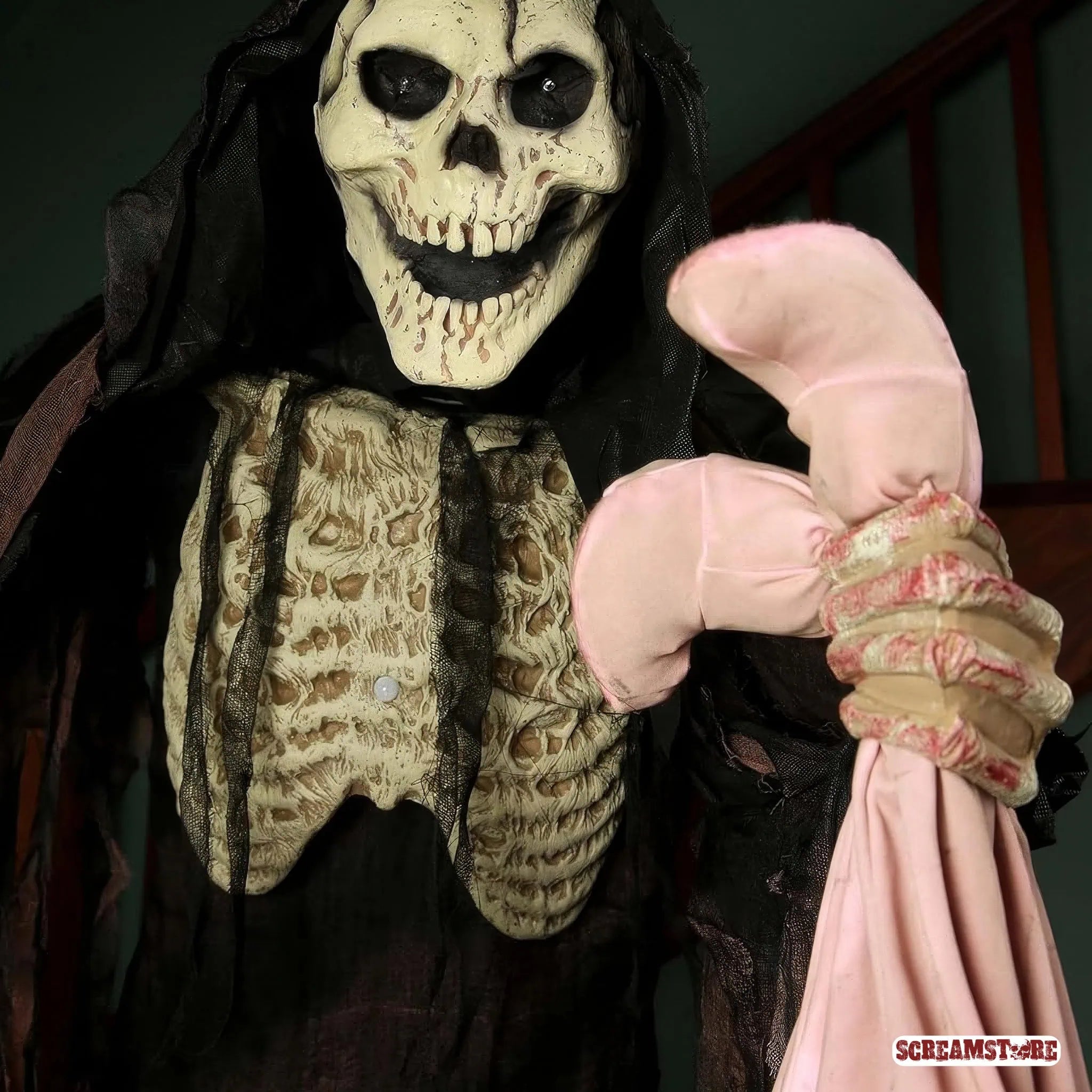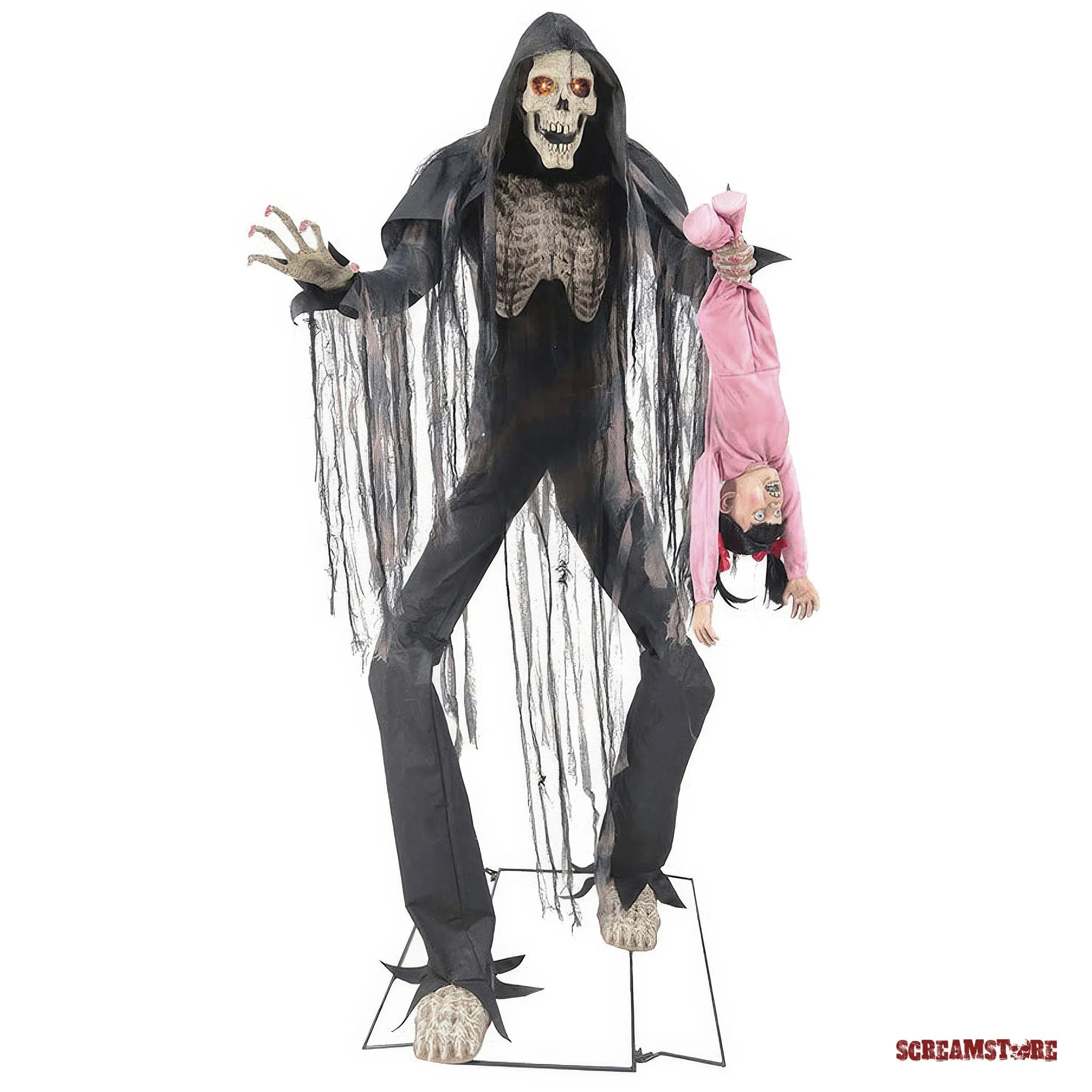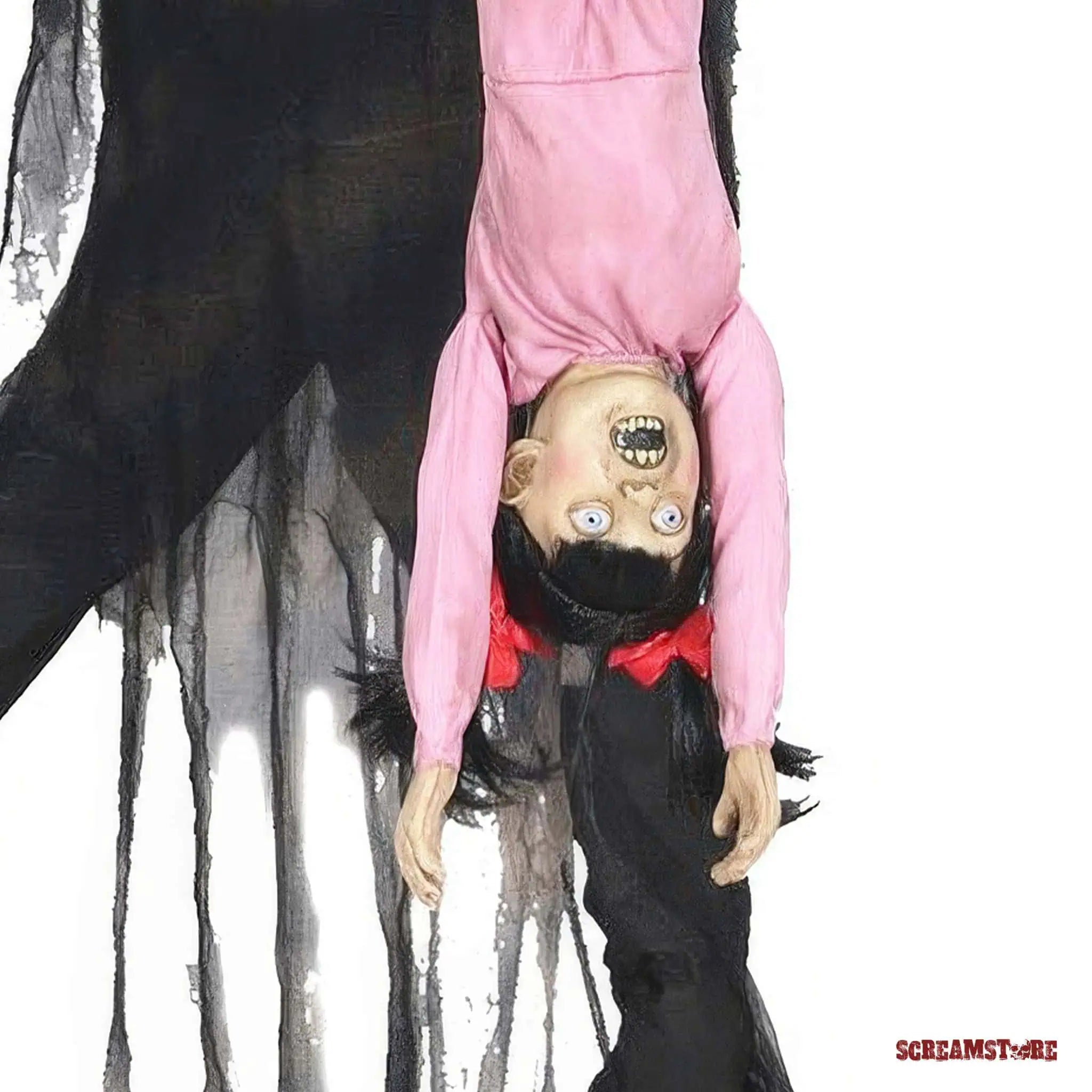 Größer kann Böse nicht sein... der Bogeyman ist definitiv einer der Macker die in der Unterwelt den Ton angeben. Wer würde diesem Hünen in Leichengestalt auch widersprechen wollen? Über 2 Meter groß, die kreischende Beute griffbereit. Der Mix aus schurkischen Lachen und angsterfüllten Schreien wird Sie verfolgen, wie er uns verfolgte. Eine sagenhafte Animatronic und ein absolutes Sammlerstück in der Schatzkammer der Screamstore Raritäten. Kult pur, fragt sich nur wer einem mehr Angst macht. Der Dämon oder das kreischende Balg. Die Kombi jedenfalls ist schaurig par excellence.