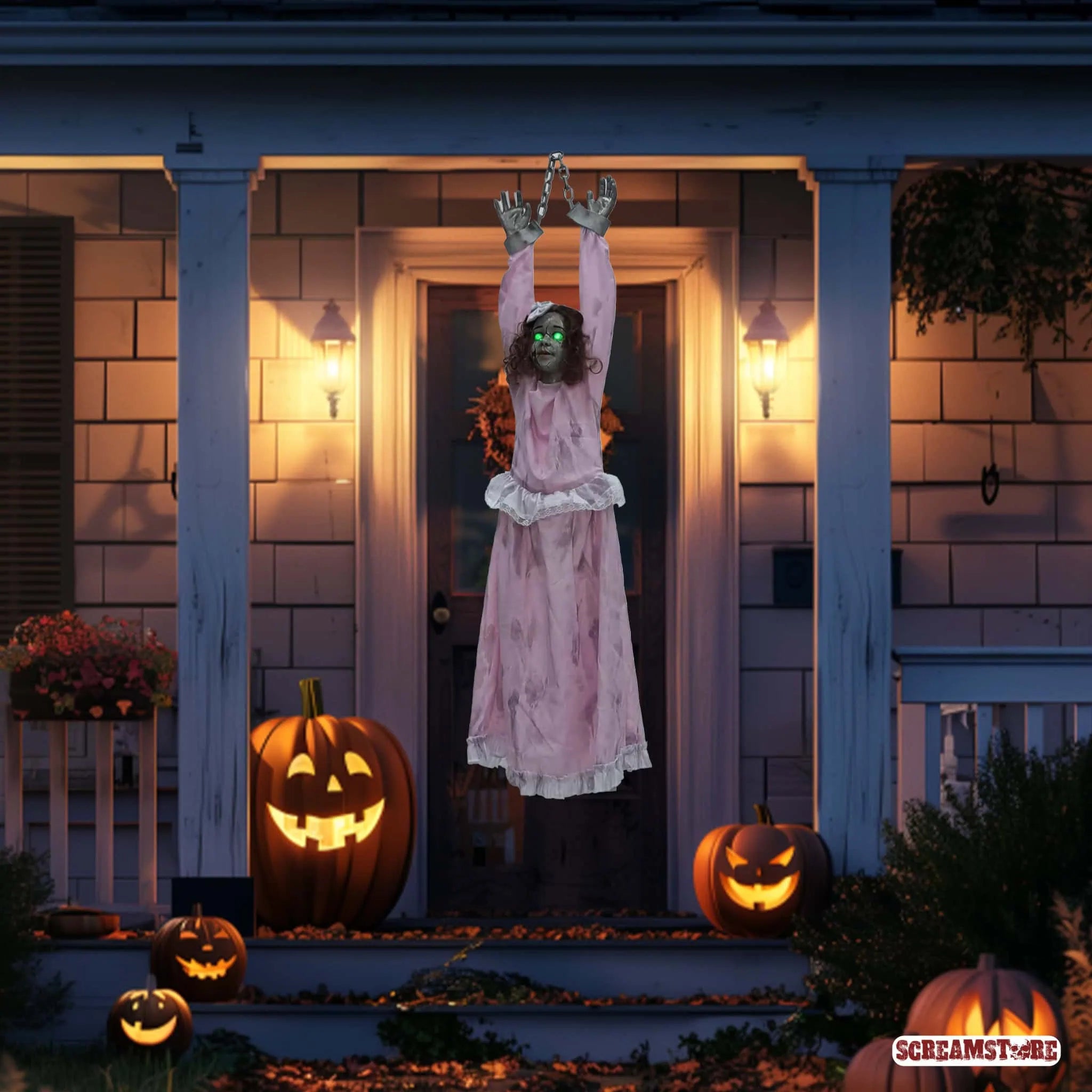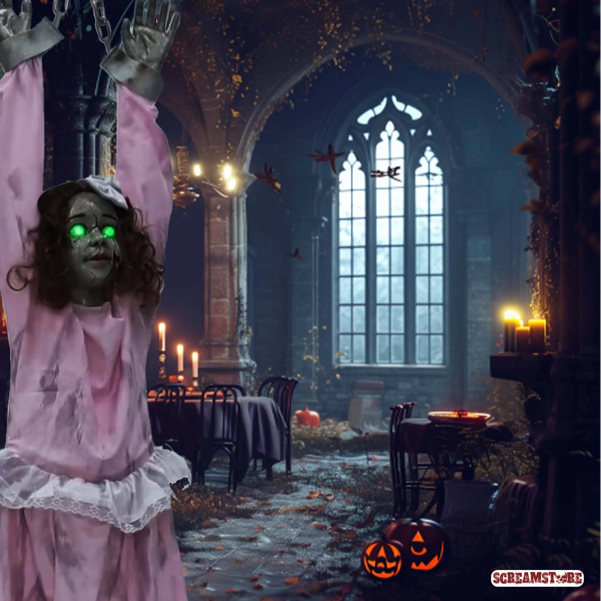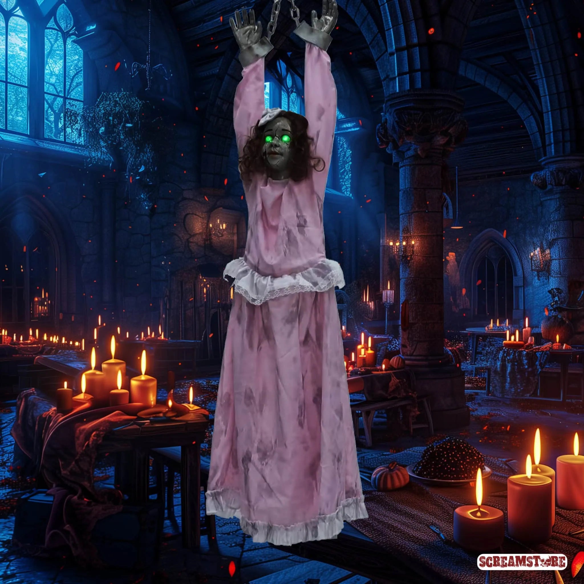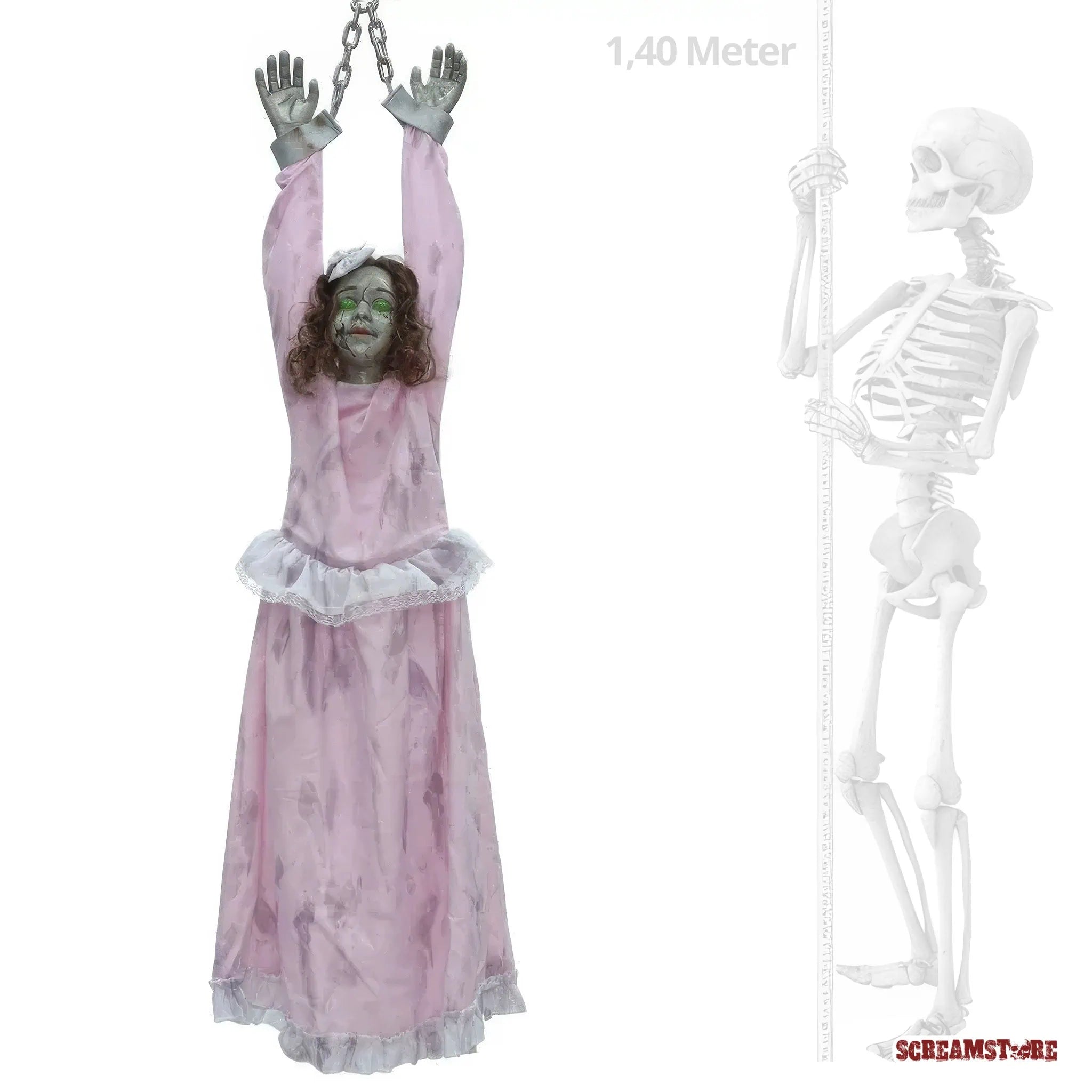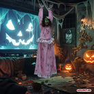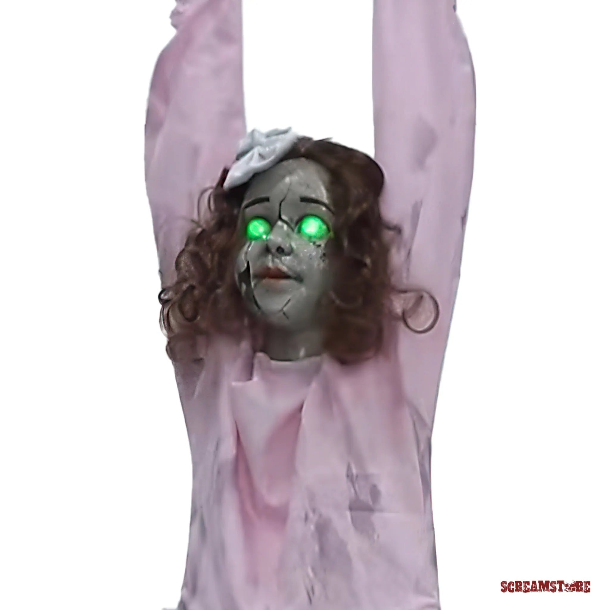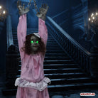 Die Villa war ein Schnäppchen – kein Wunder bei dem Bonus! Im eisigen Gruselhauch hängt der Grund: der ruhelose Geist eines Mädchens, das hier grausam starb. Seitdem spukt die Grusel-Göre Nacht für Nacht durch die Flure, kreischend und klagend. Der Makler hat das wohl "übersehen". Aber hey, irgendwas ist immer: ob morsche Balken, Schimmel oder ein kreischendes Gespenst. Immerhin tröstlich, die Bälger von anno dazumal waren auch nicht besser als heute. Unsere geniale Hänge-Horror-Figur Viktoria schüttelt sich, schreit wild, und ihre Augen glühen. Ein Must-Have, echte Girlpower-Horror-Deko!