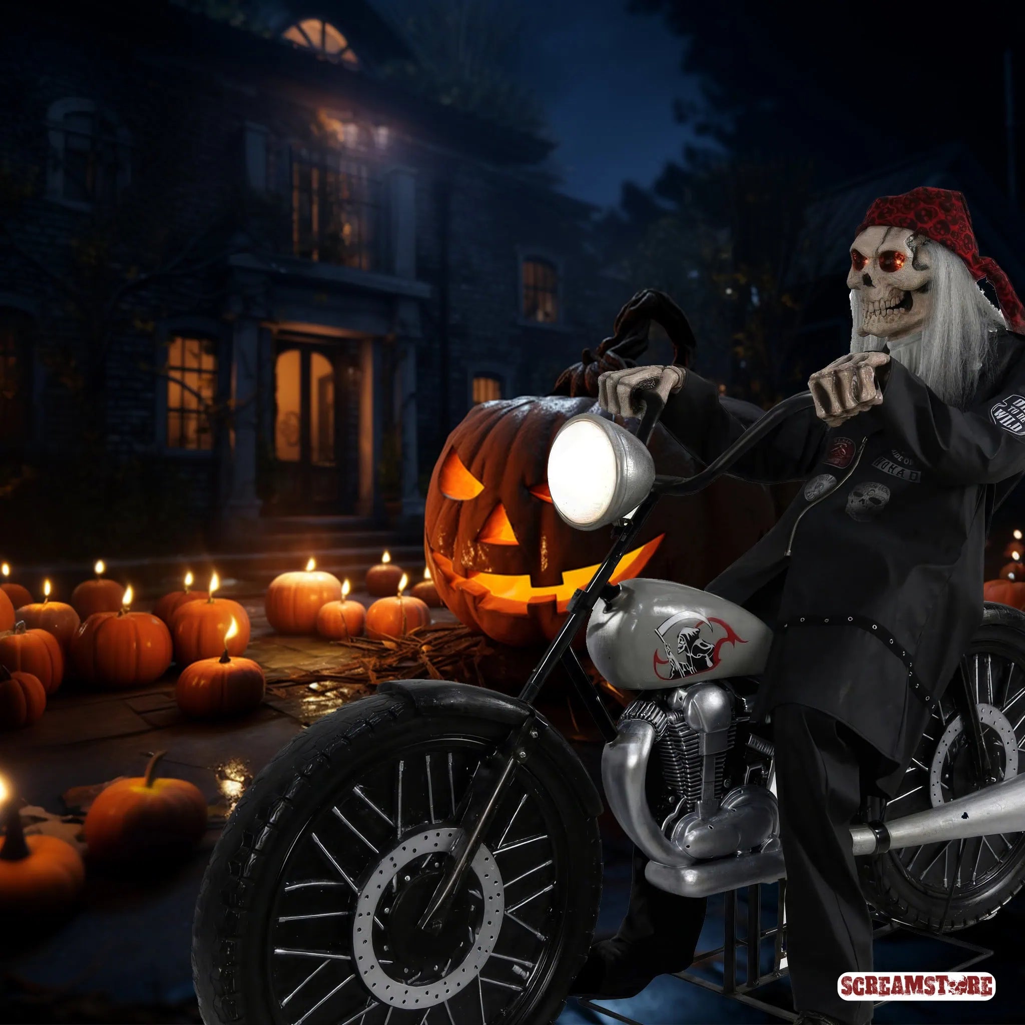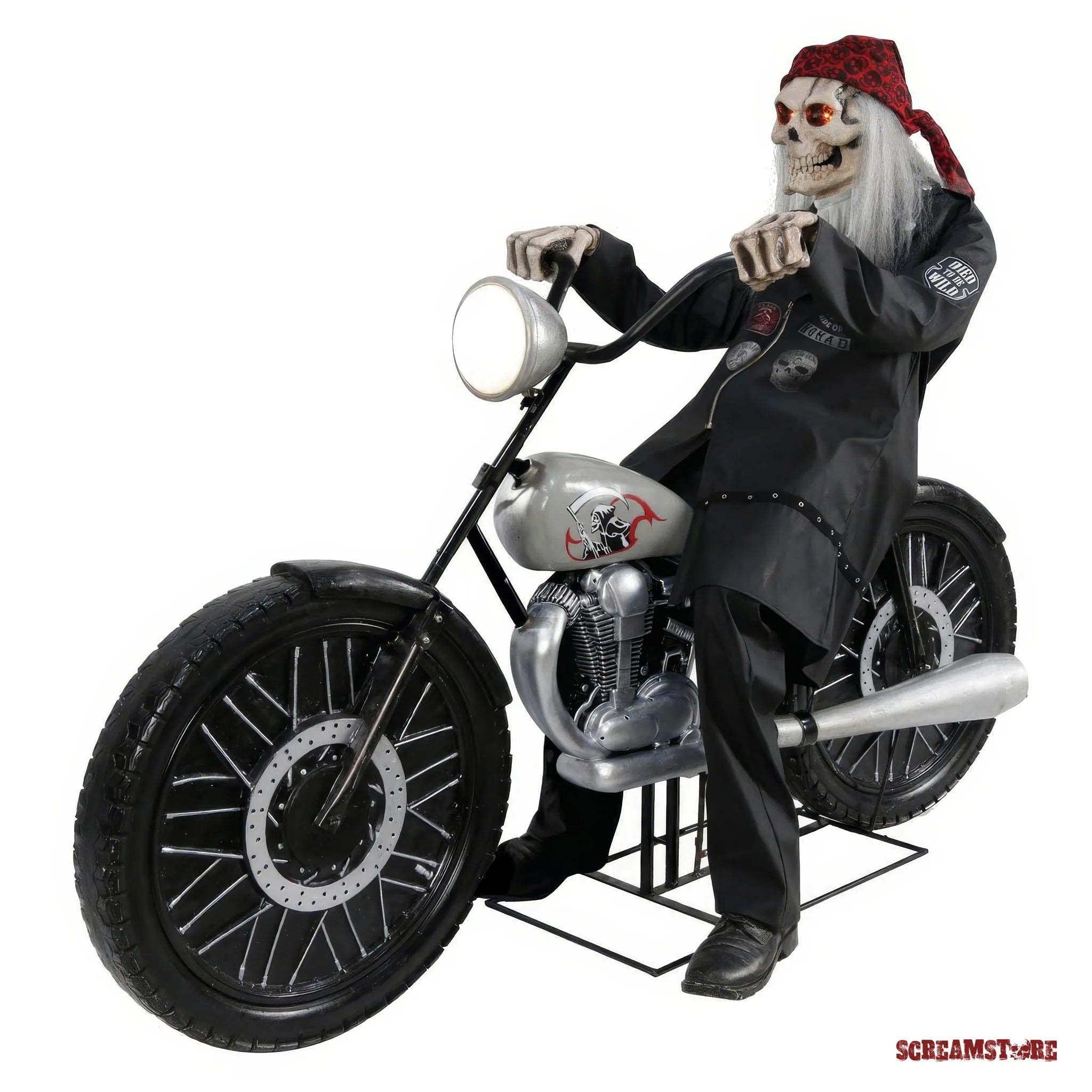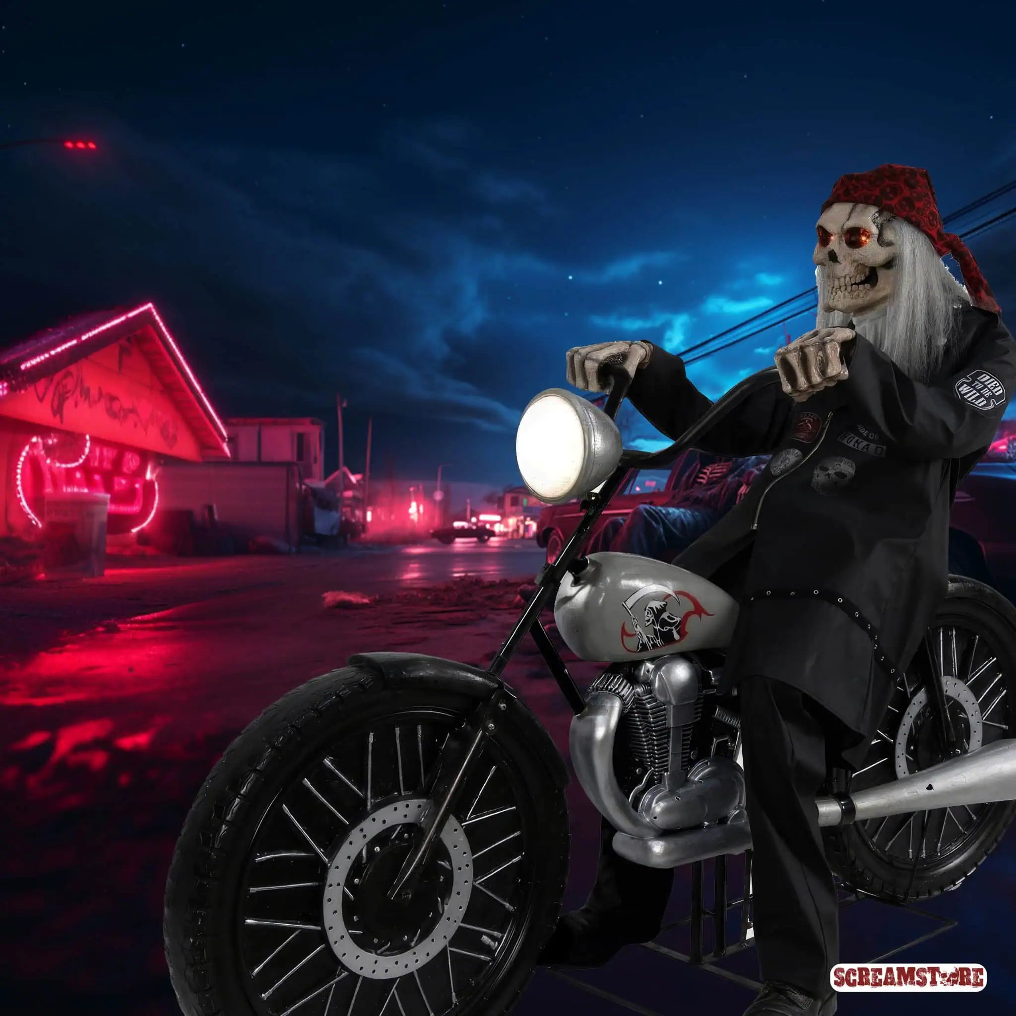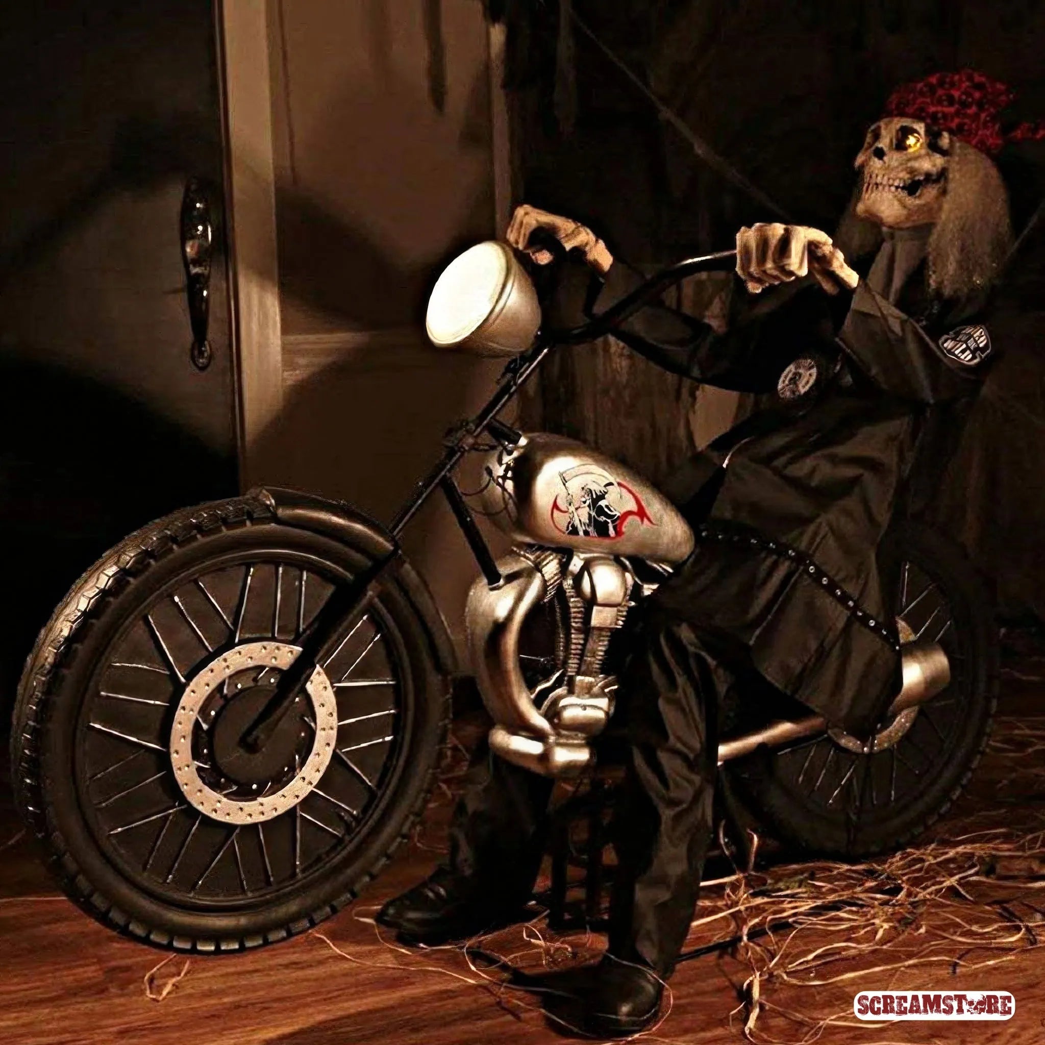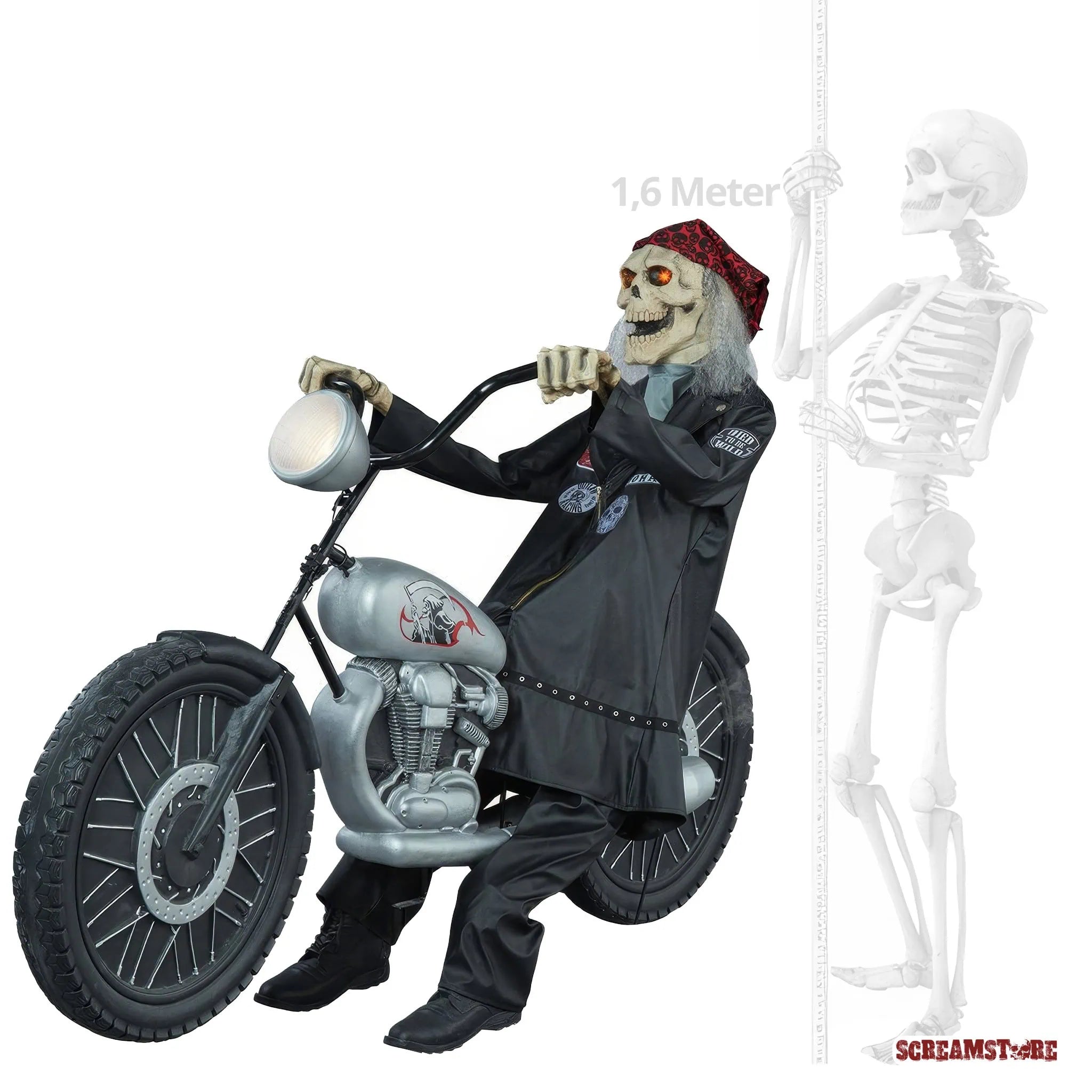 Get your kicks on 666... ja, der Sensenmann ist ein leichenschaftlicher Biker. Wann immer die Freizeit es zulässt, schwingt sich Gevatter Tod auf seine stählerne Braut und dreht ein paar Runden. Das macht den Schädel frei, sagt er. Wir als Sterbliche begrüßen das natürlich. Schön, wenn sich der Mann mit dem Knochenjob mal eine Auszeit nimmt. Statt uns eine aufzudrücken. Eine absolute Kult Animatronic die weltweit längst vergriffen ist und als absolutes Sammlerstück seinen Preis hat. Aber auch eine der coolsten die jemals auf den Asphalt geschickt wurde. Vollgas in den Albtraum, Partyhammer und Deko Schocker.