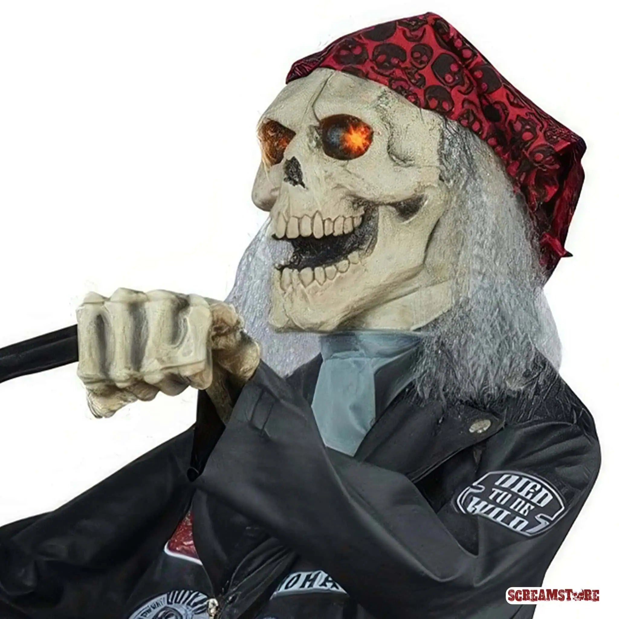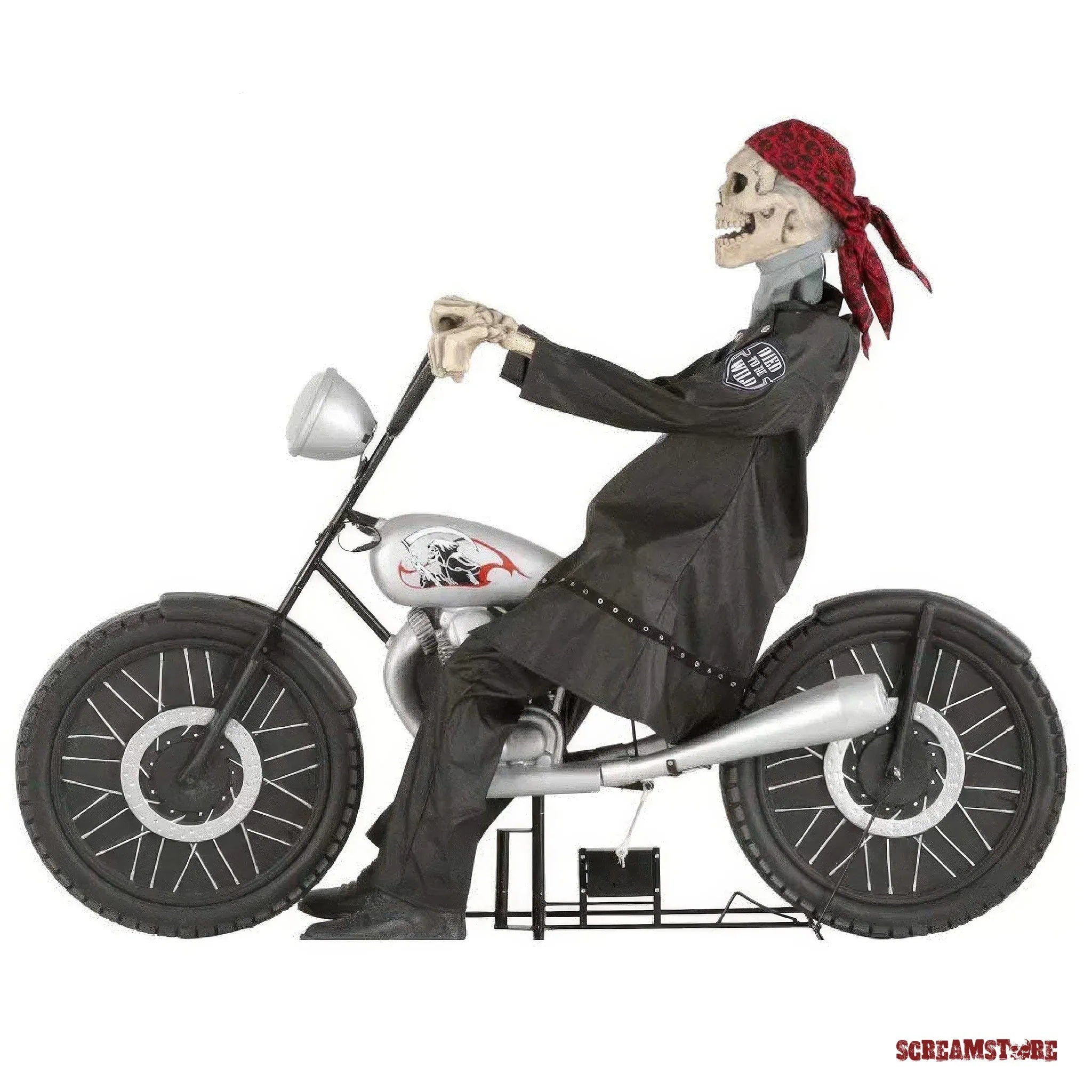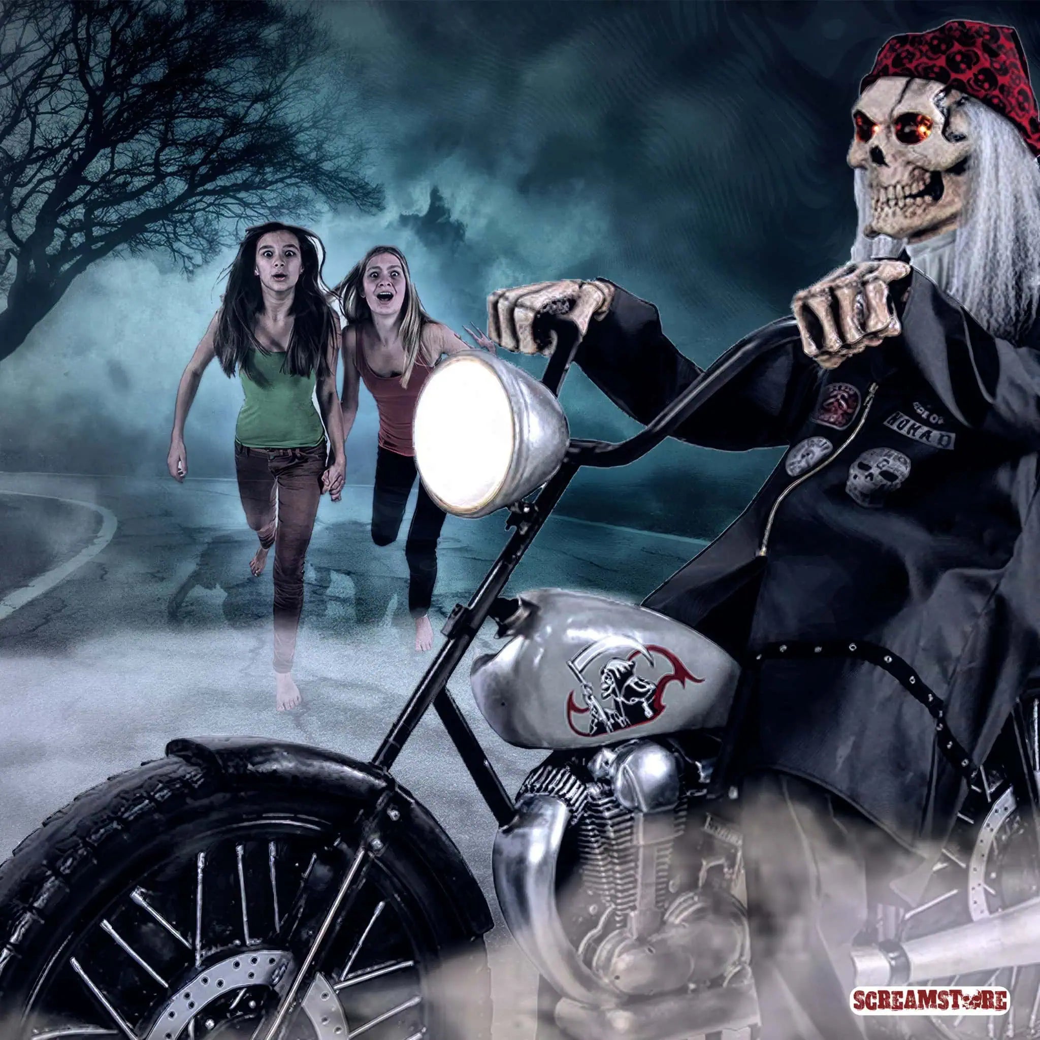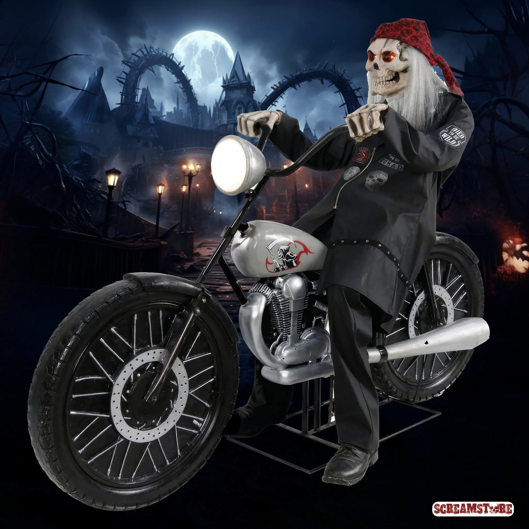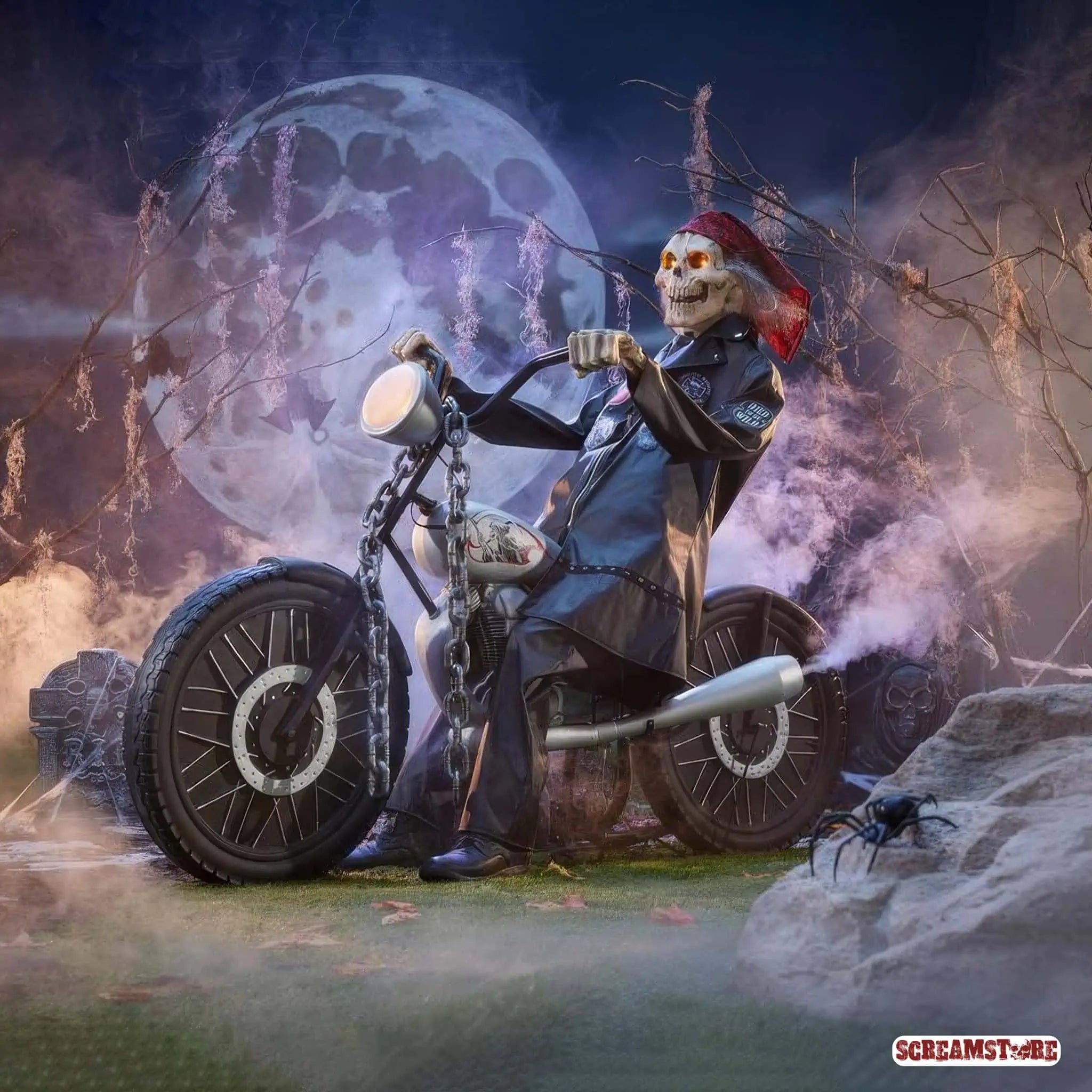 Get your kicks on 666... ja, der Sensenmann ist ein leichenschaftlicher Biker. Wann immer die Freizeit es zulässt, schwingt sich Gevatter Tod auf seine stählerne Braut und dreht ein paar Runden. Das macht den Schädel frei, sagt er. Wir als Sterbliche begrüßen das natürlich. Schön, wenn sich der Mann mit dem Knochenjob mal eine Auszeit nimmt. Statt uns eine aufzudrücken. Eine absolute Kult Animatronic die weltweit längst vergriffen ist und als absolutes Sammlerstück seinen Preis hat. Aber auch eine der coolsten die jemals auf den Asphalt geschickt wurde. Vollgas in den Albtraum, Partyhammer und Deko Schocker.
