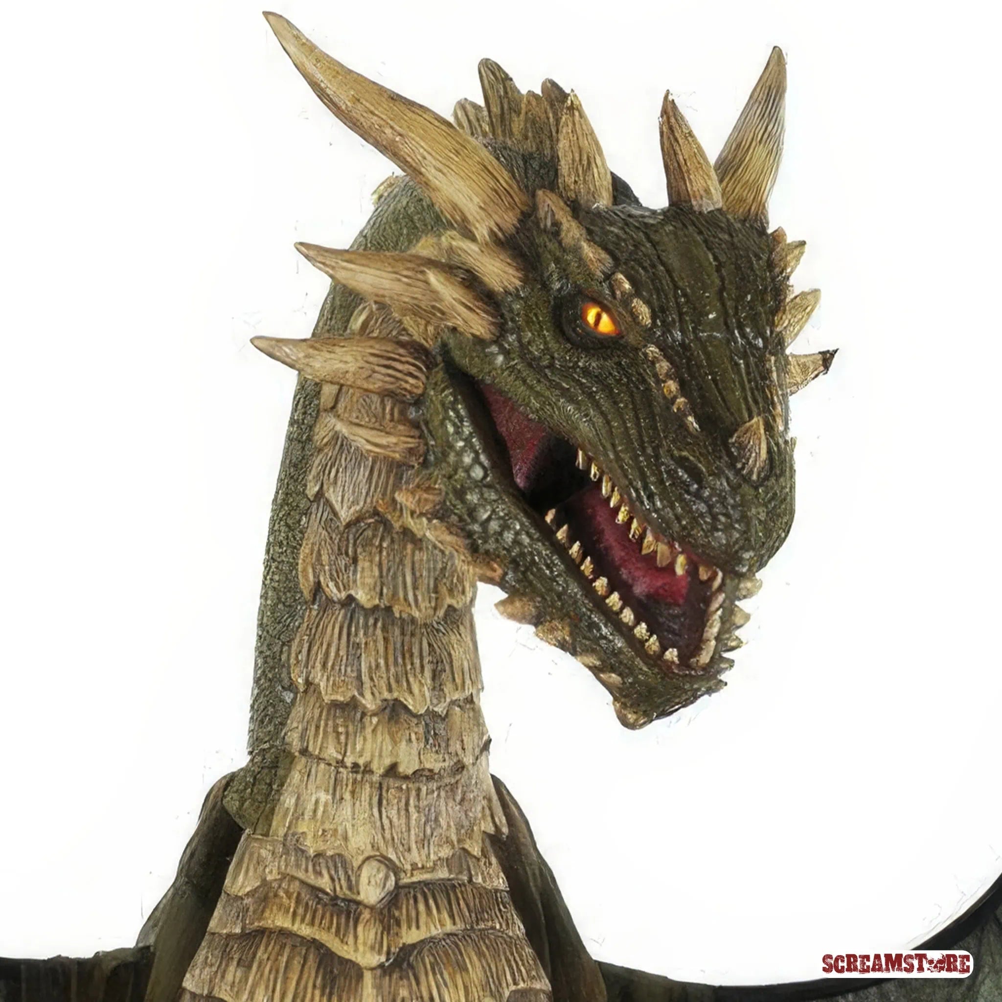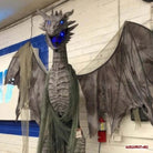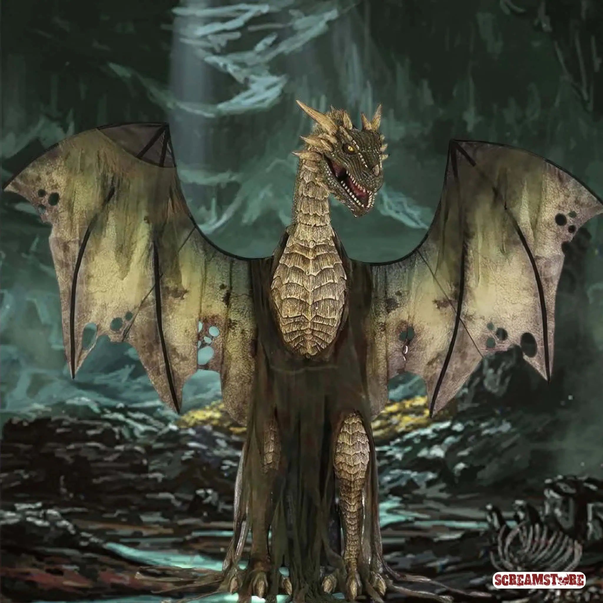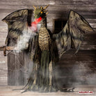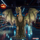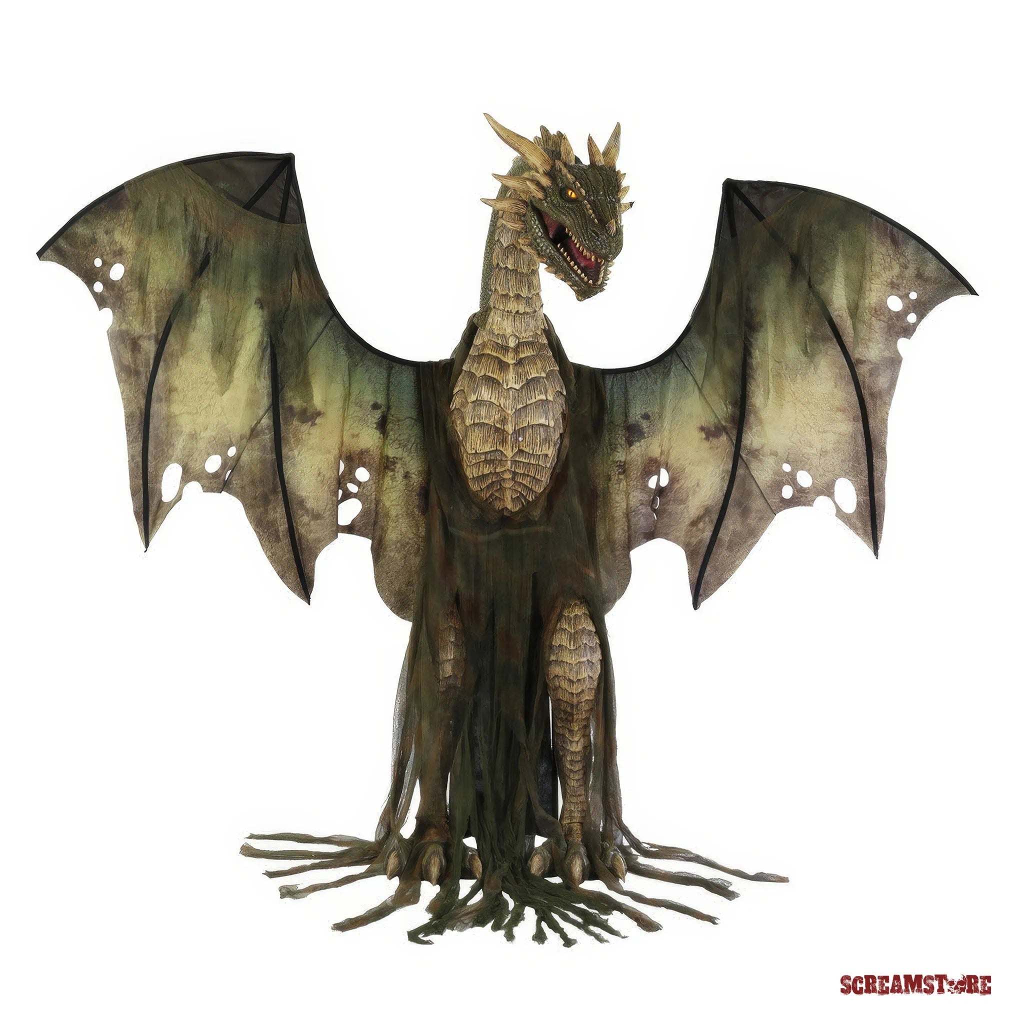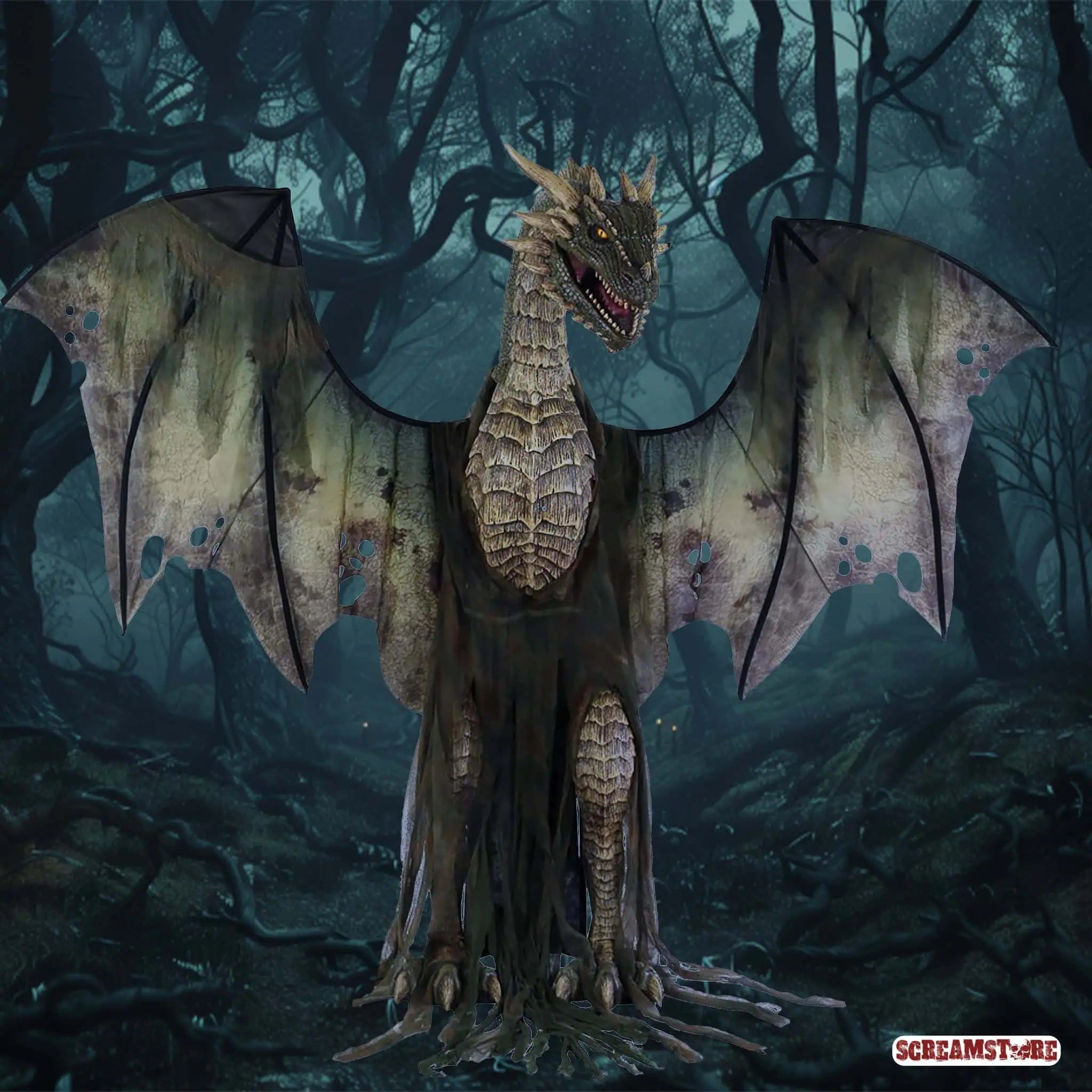 Zwischen knorrigen Ästen, fauligem Nebel und vergessenen Flüchen hat er jahrhundertelang geschlafen – jetzt ist er wach. Und hungrig. Der riesige Wald Drache ist kein Deko-Tierchen für Märchenfans, sondern eine donnernde Naturgewalt in Monstergestalt: über zwei Meter hoch, eine Flügelspannweite wie ein Segelflugzeug und ein Blick, der selbst Dämonen den Appetit verdirbt. Sein Kopf wendet sich langsam zur Seite, als würde er dich taxieren. Die Flügel schlagen, das Grollen wird tiefer, die LED-Augen glühen blutrot durch die Dunkelheit. Wer da noch stehen bleibt, sollte schnell lernen zu rennen. Und wer noch eins draufsetzen will, schließt eine Nebelmaschine an (nicht inbegriffen) – für dampfenden Todesatem direkt ins Gesicht. Besser geht nicht.