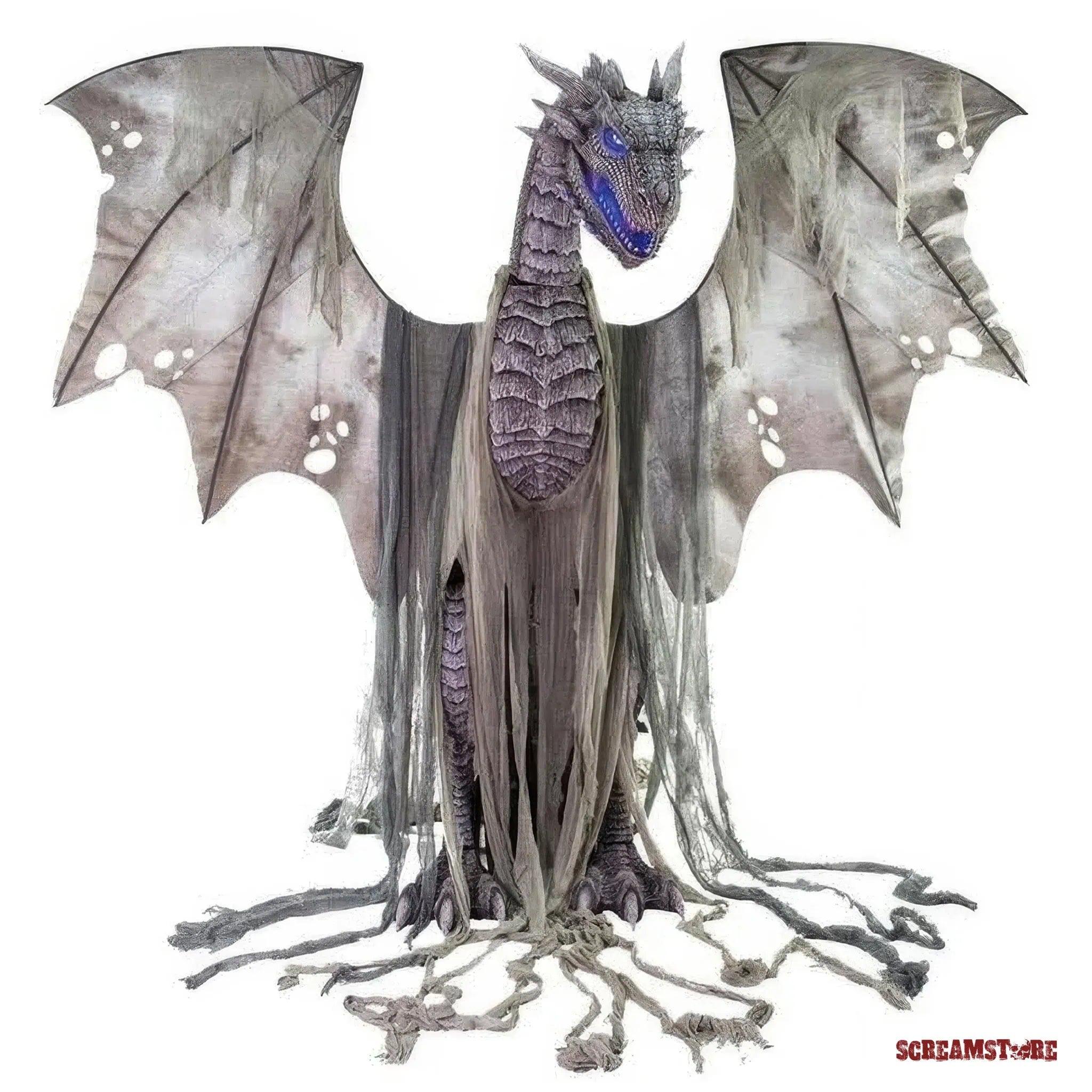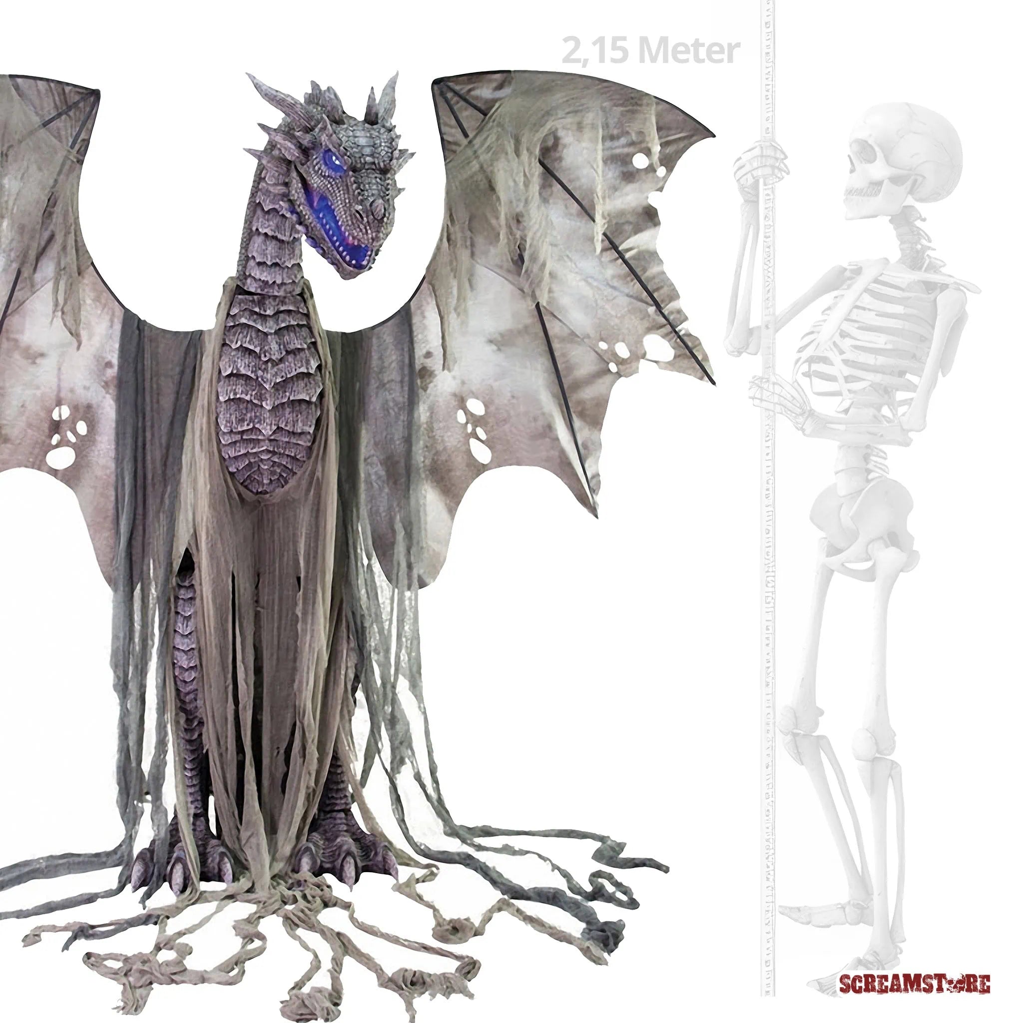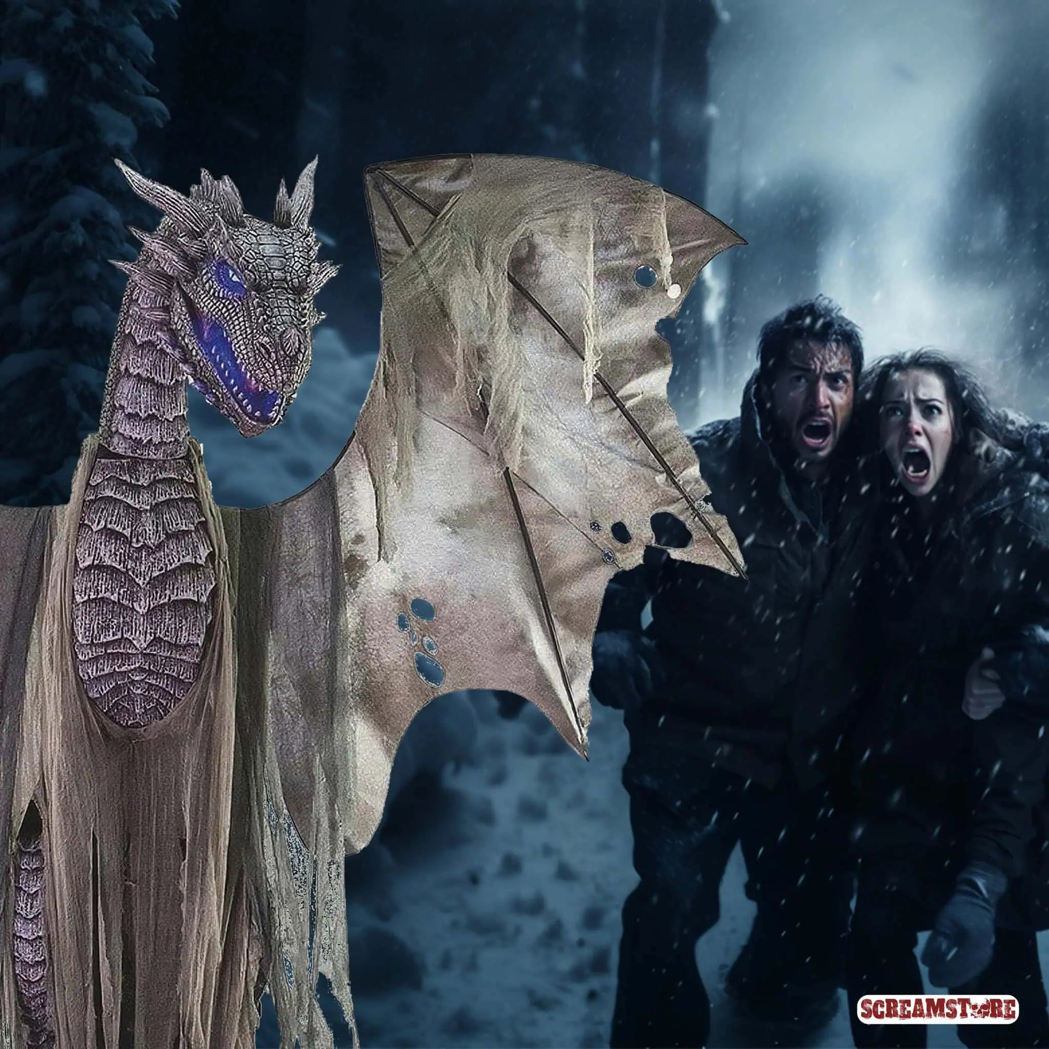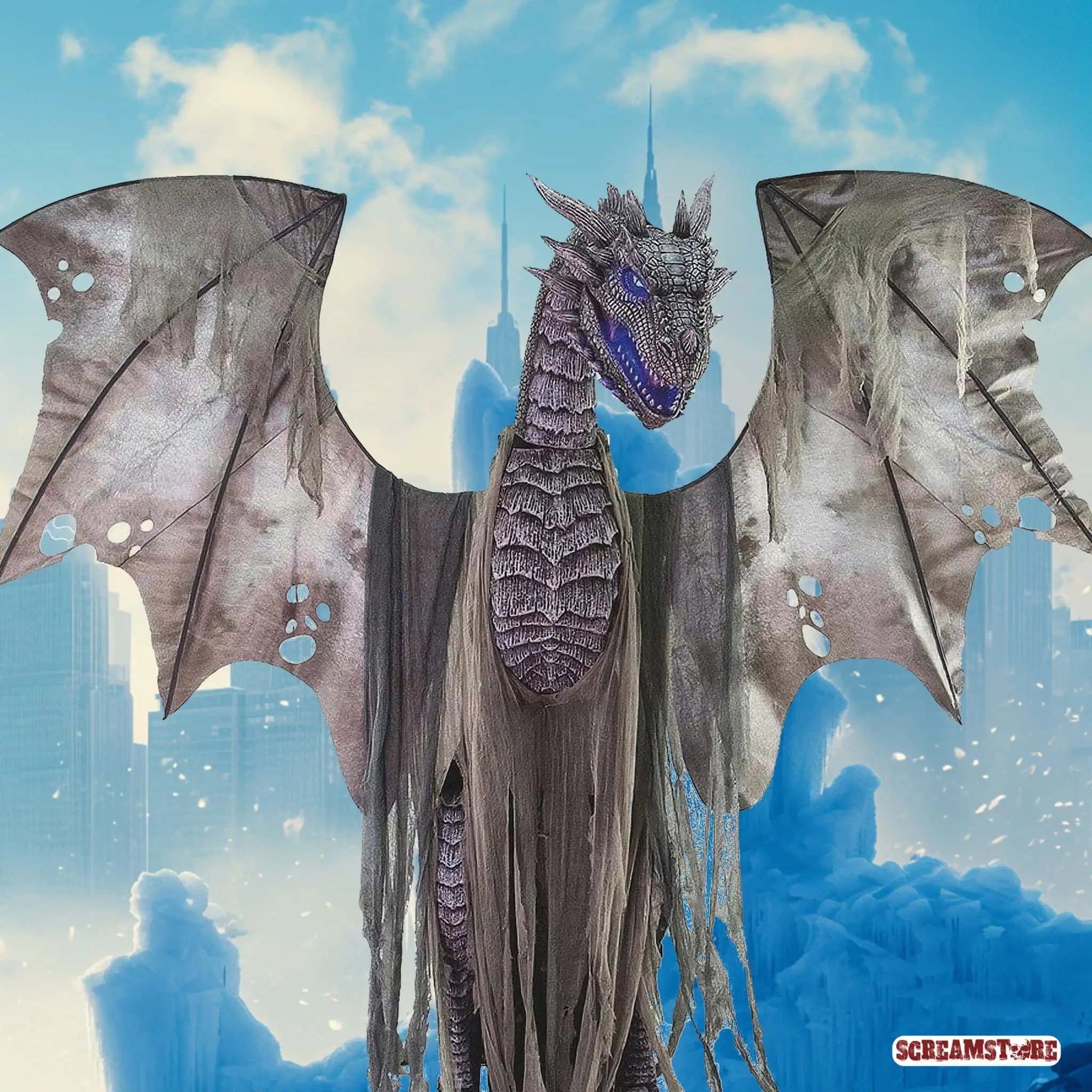 Der Winterdrache ist die Krönung jeder Halloween-Deko! Mit einer majestätischen Höhe von 2,1 Metern bringt diese animierte Figur die perfekte Mischung aus Fantasy und Horror in dein Zuhause. Seine Flügel schlagen bedrohlich, der Kopf dreht sich von Seite zu Seite, und seine eisblauen Augen leuchten unheilvoll auf. Aber das Beste kommt noch: Verbinde ihn mit deiner Nebelmaschine (nicht inklusive), und er spuckt Nebel, während er brüllt – ein Anblick, der deine Gäste in Angst und Schrecken versetzen wird! Hol dir den Winterdrachen und lass den Frost des Schreckens über deine Party hinwegfegen!