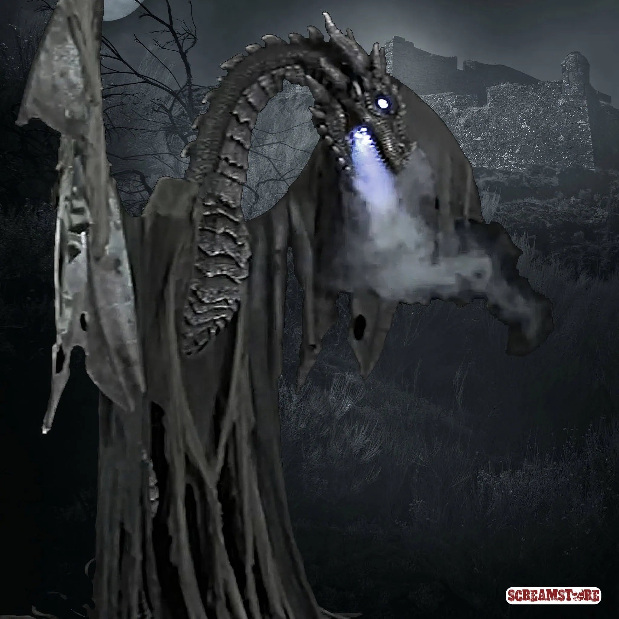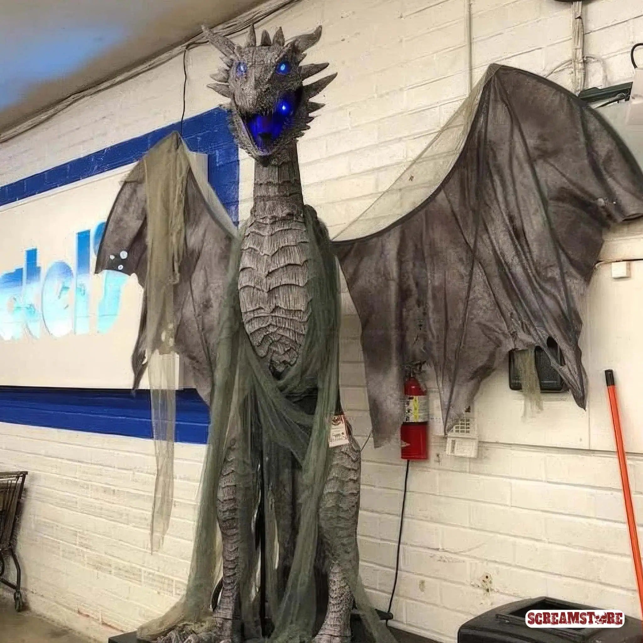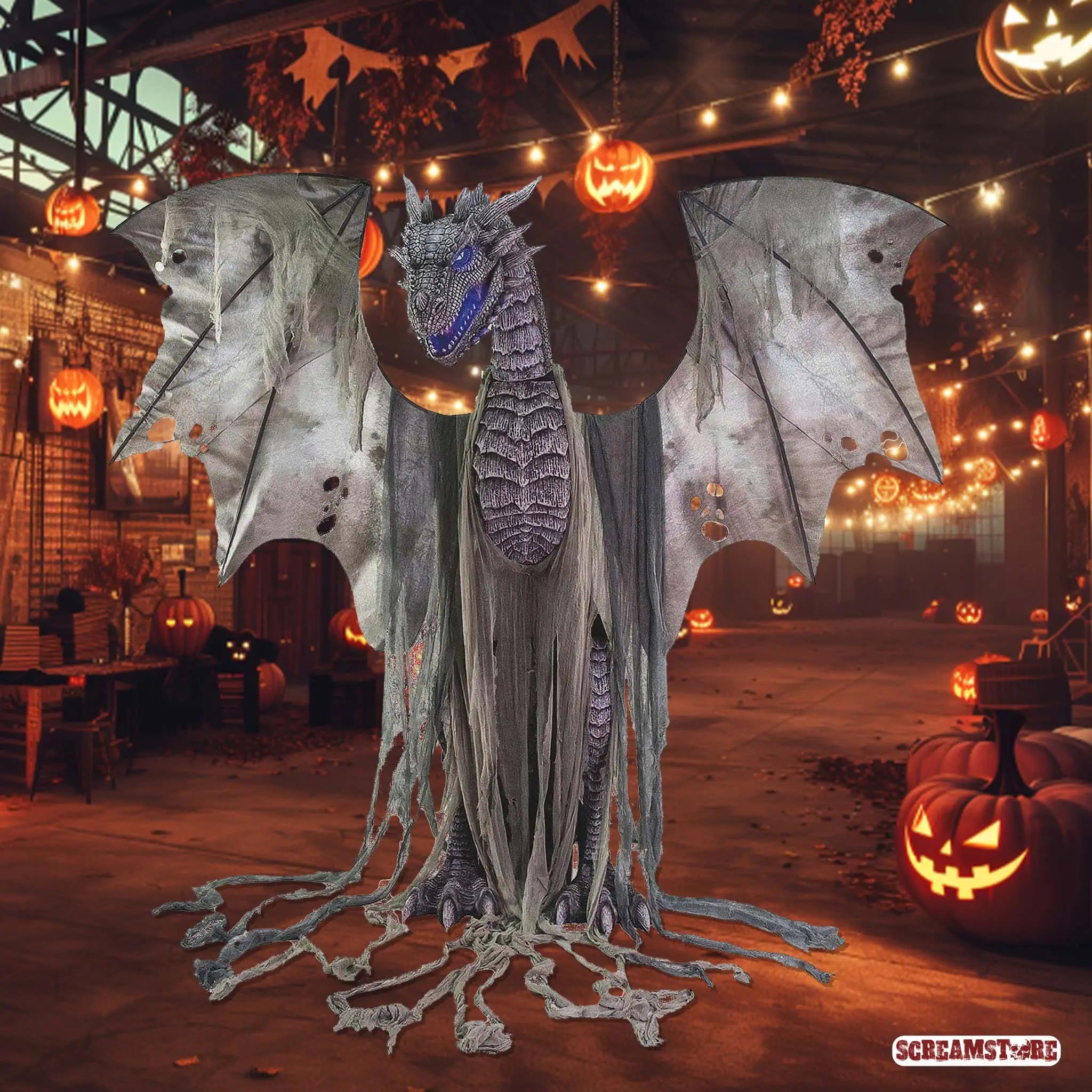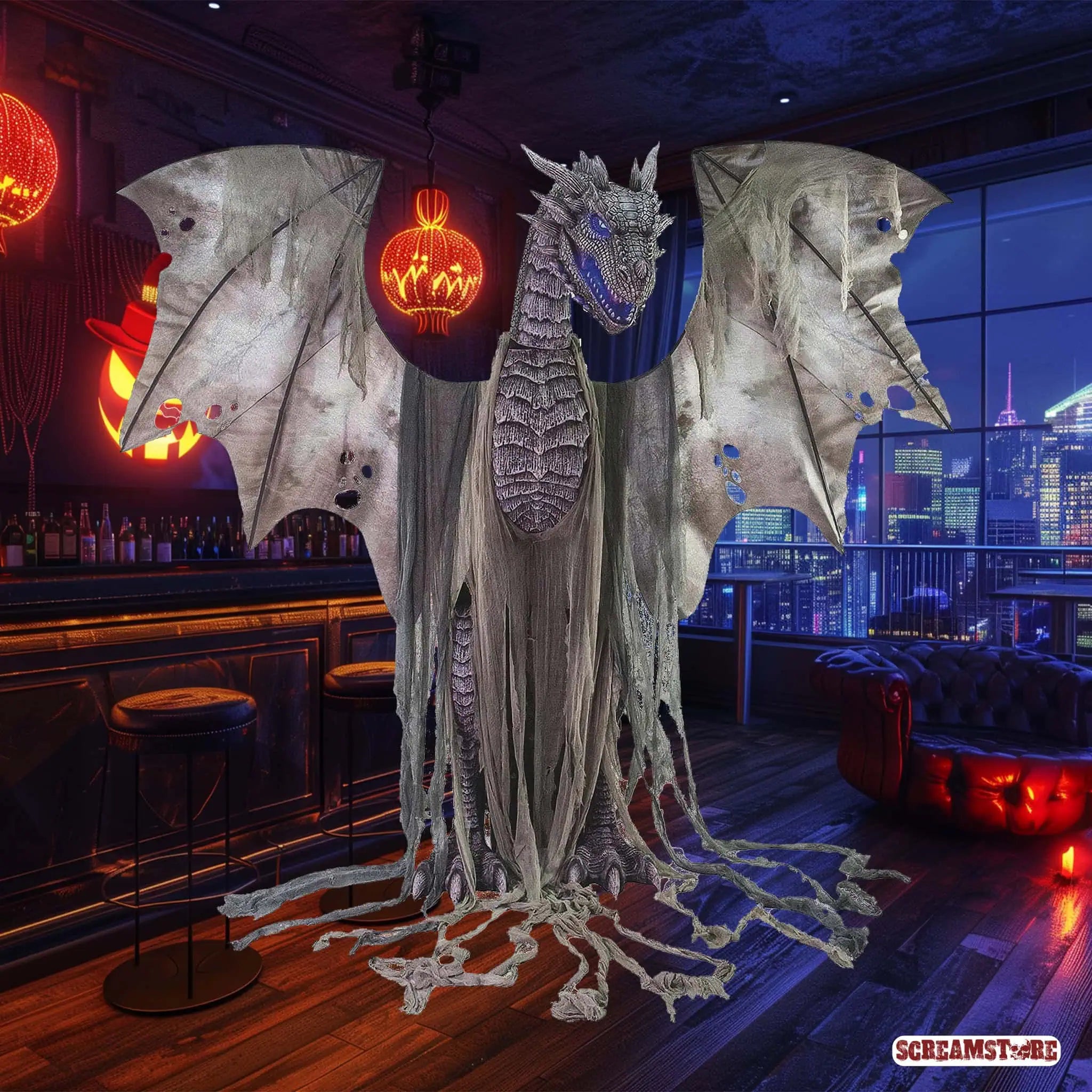 Der Winterdrache ist die Krönung jeder Halloween-Deko! Mit einer majestätischen Höhe von 2,1 Metern bringt diese animierte Figur die perfekte Mischung aus Fantasy und Horror in dein Zuhause. Seine Flügel schlagen bedrohlich, der Kopf dreht sich von Seite zu Seite, und seine eisblauen Augen leuchten unheilvoll auf. Aber das Beste kommt noch: Verbinde ihn mit deiner Nebelmaschine (nicht inklusive), und er spuckt Nebel, während er brüllt – ein Anblick, der deine Gäste in Angst und Schrecken versetzen wird! Hol dir den Winterdrachen und lass den Frost des Schreckens über deine Party hinwegfegen!