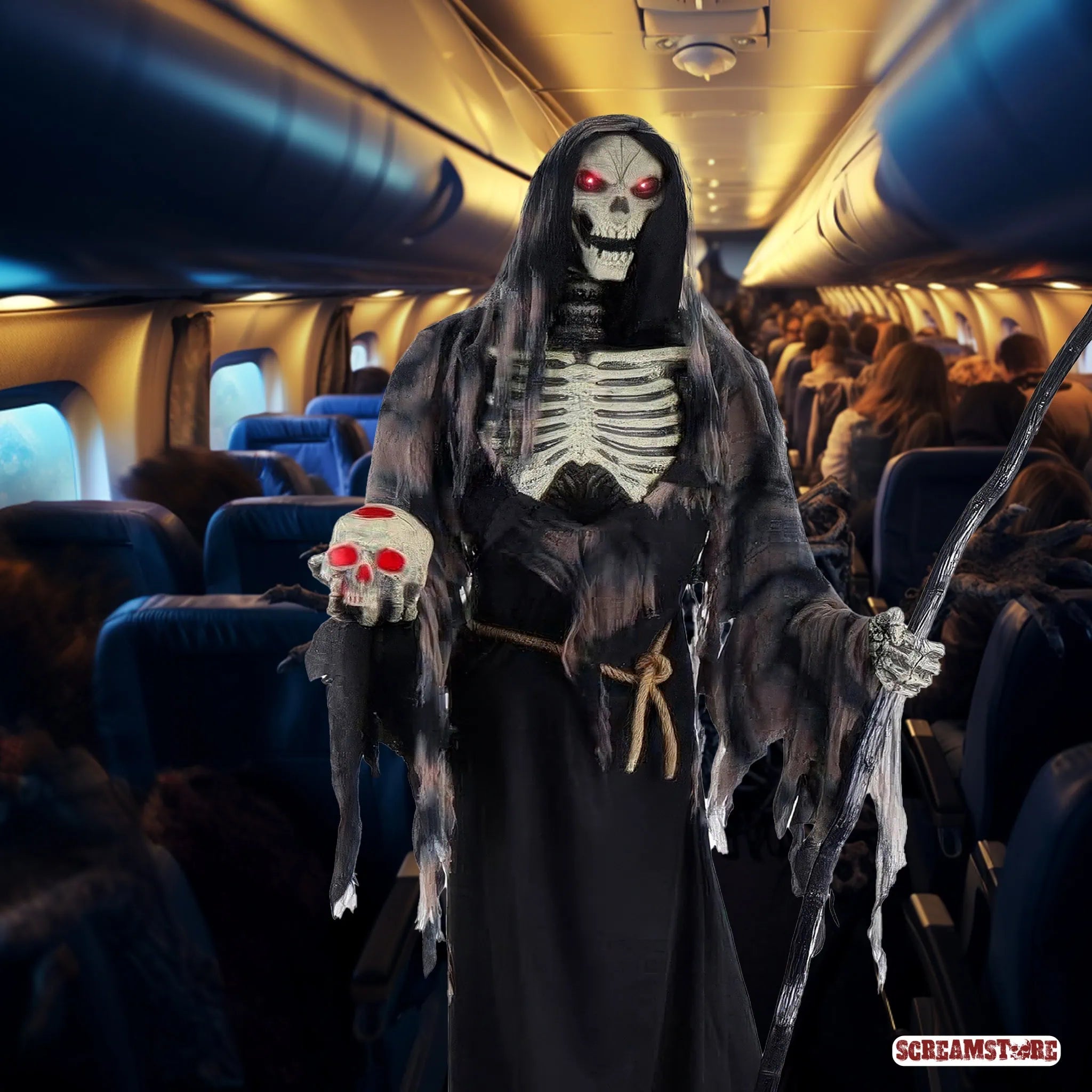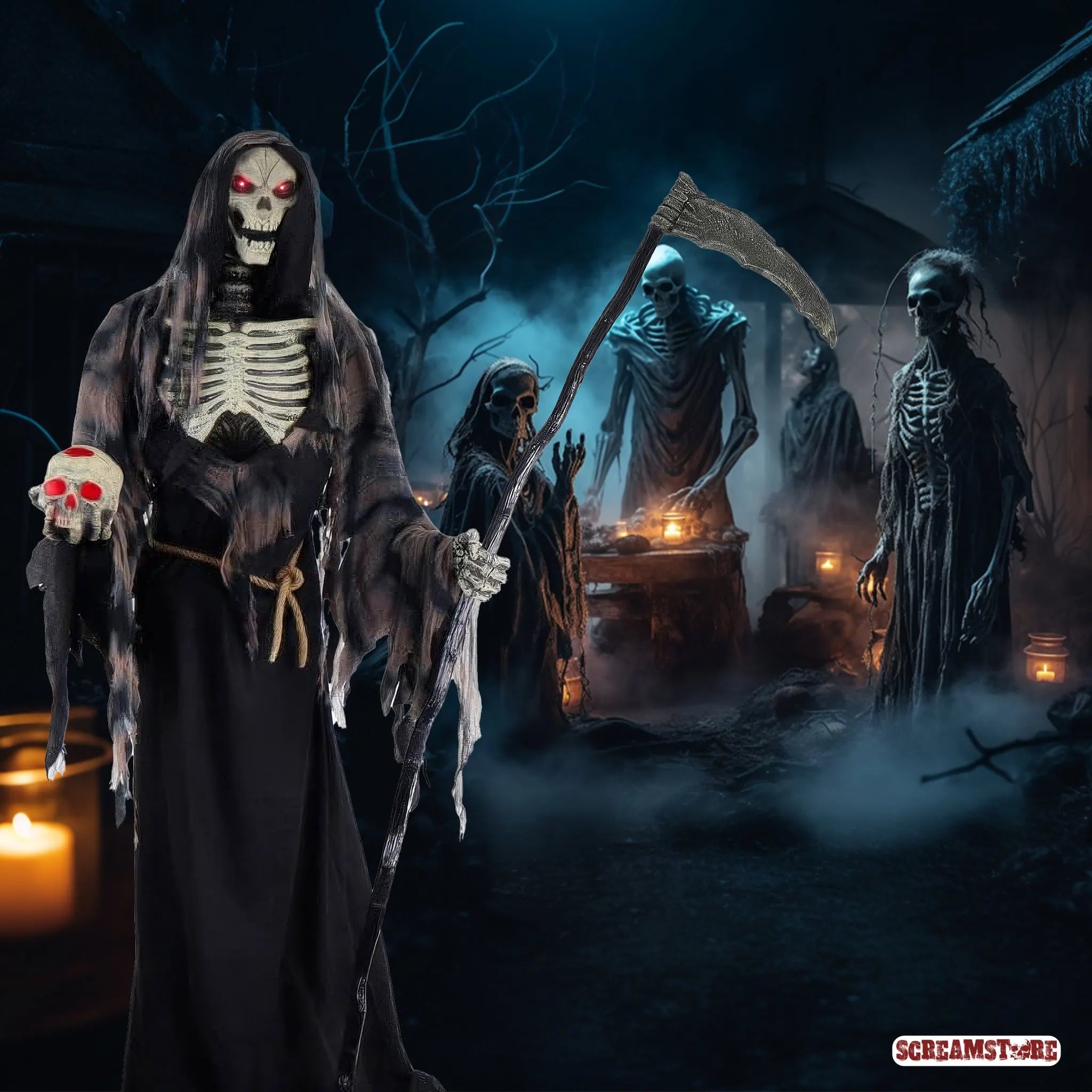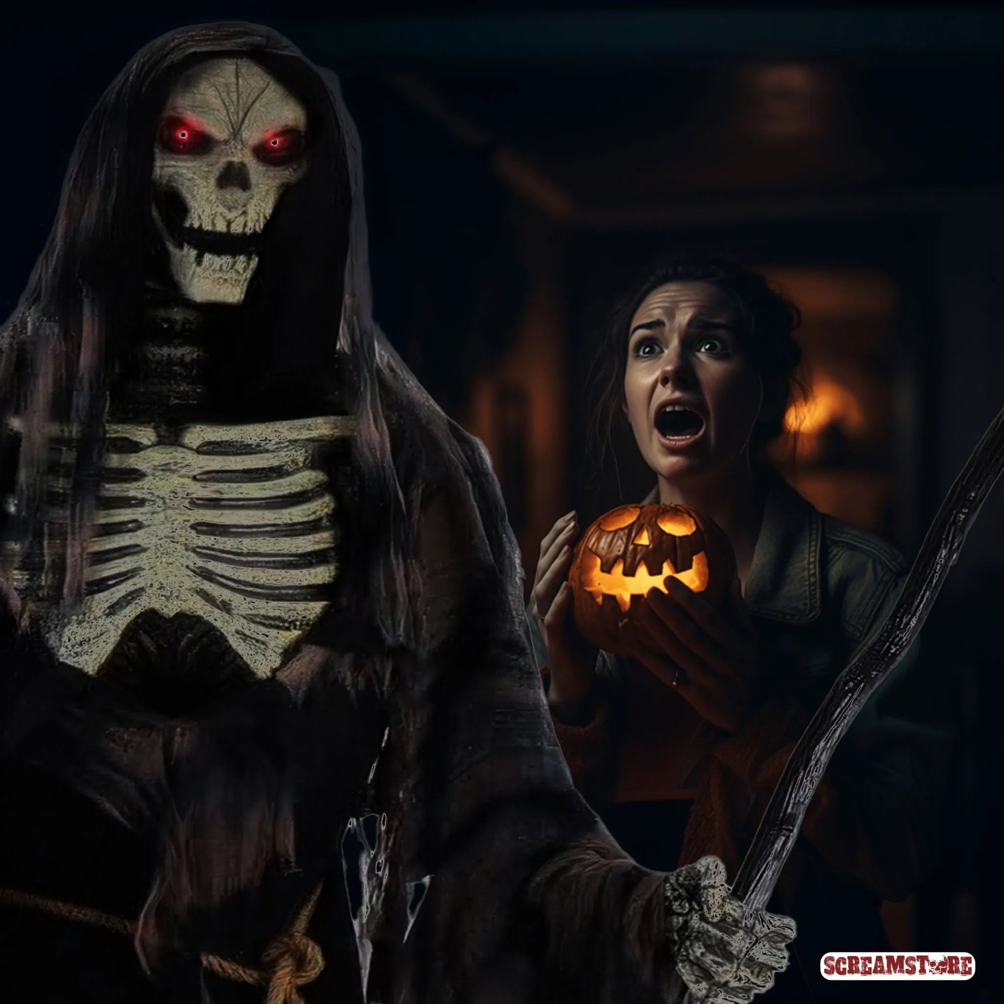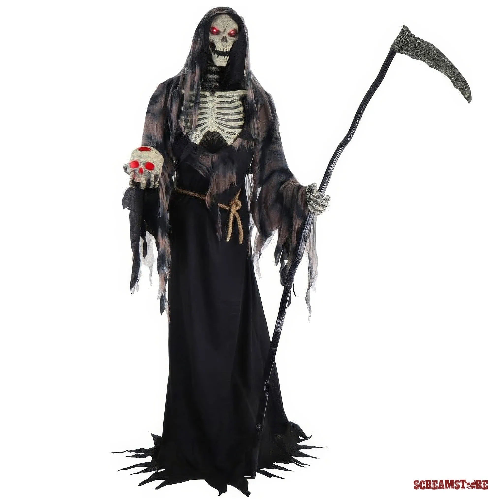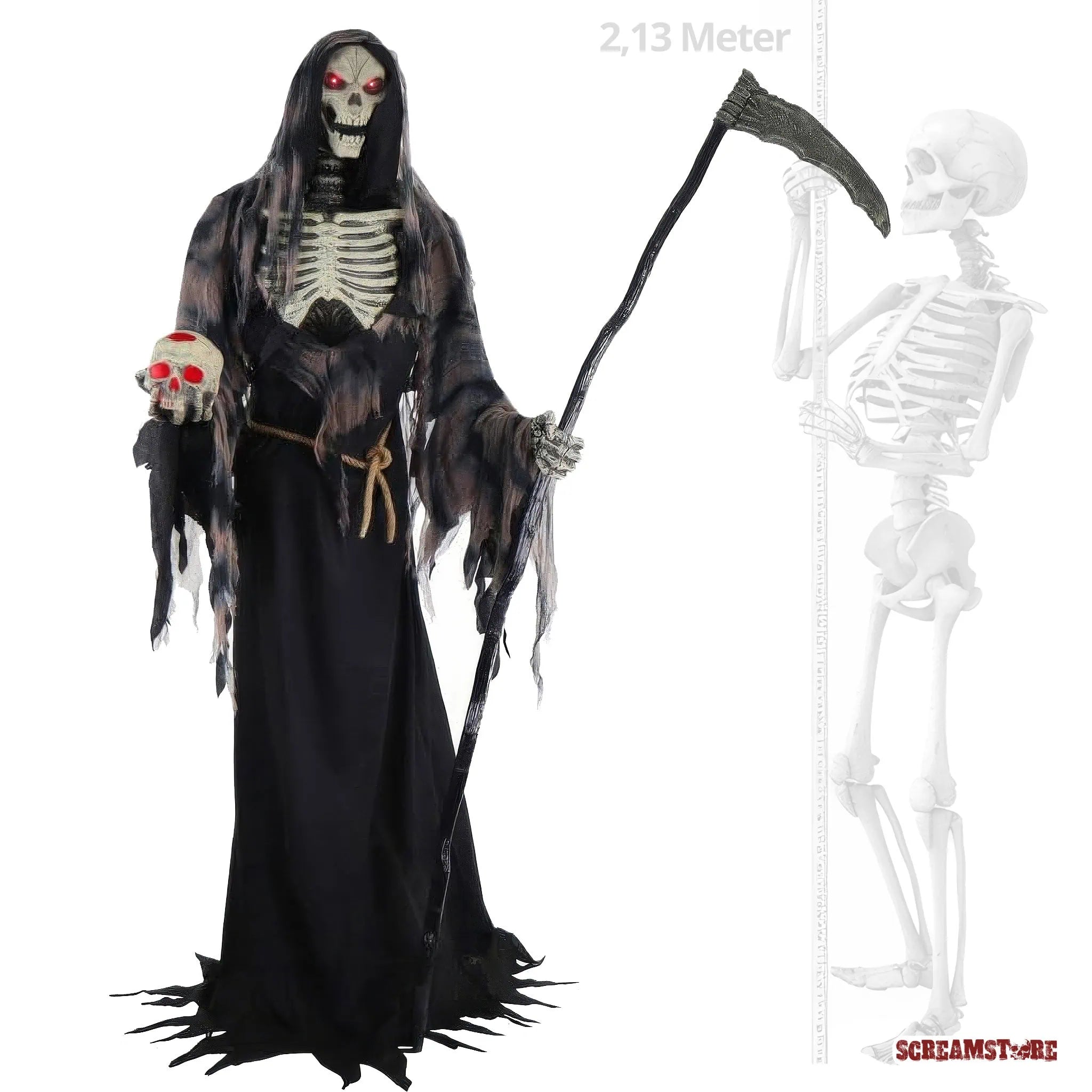 Der Tod scherzt nicht, auch wenn es ihm einen Riesen Spaß macht Dir seine letzte Aufwartung zu machen. Und damit Du nicht ganz allein dahin siechst hat er noch sein letztes Opfer als Zaungast mitgebracht. Zumindest seinen Schädel. Denn die Dinger die kommen in seine Sammlung. Auch Deiner. Ob das nun tröstlich ist, da sind die Meinungen so gespalten wie die Köpfe. . Eine atemberaubende Gestalt, selten wurde die Idee des Sensenmann so toll umgesetzt. Grandiose Licht und Soundeffekte und ein schauriger Bewegungsablauf, da mutiert selbst Herkules zum Angsthasen. Todsicher der Hit auf jeder Party.