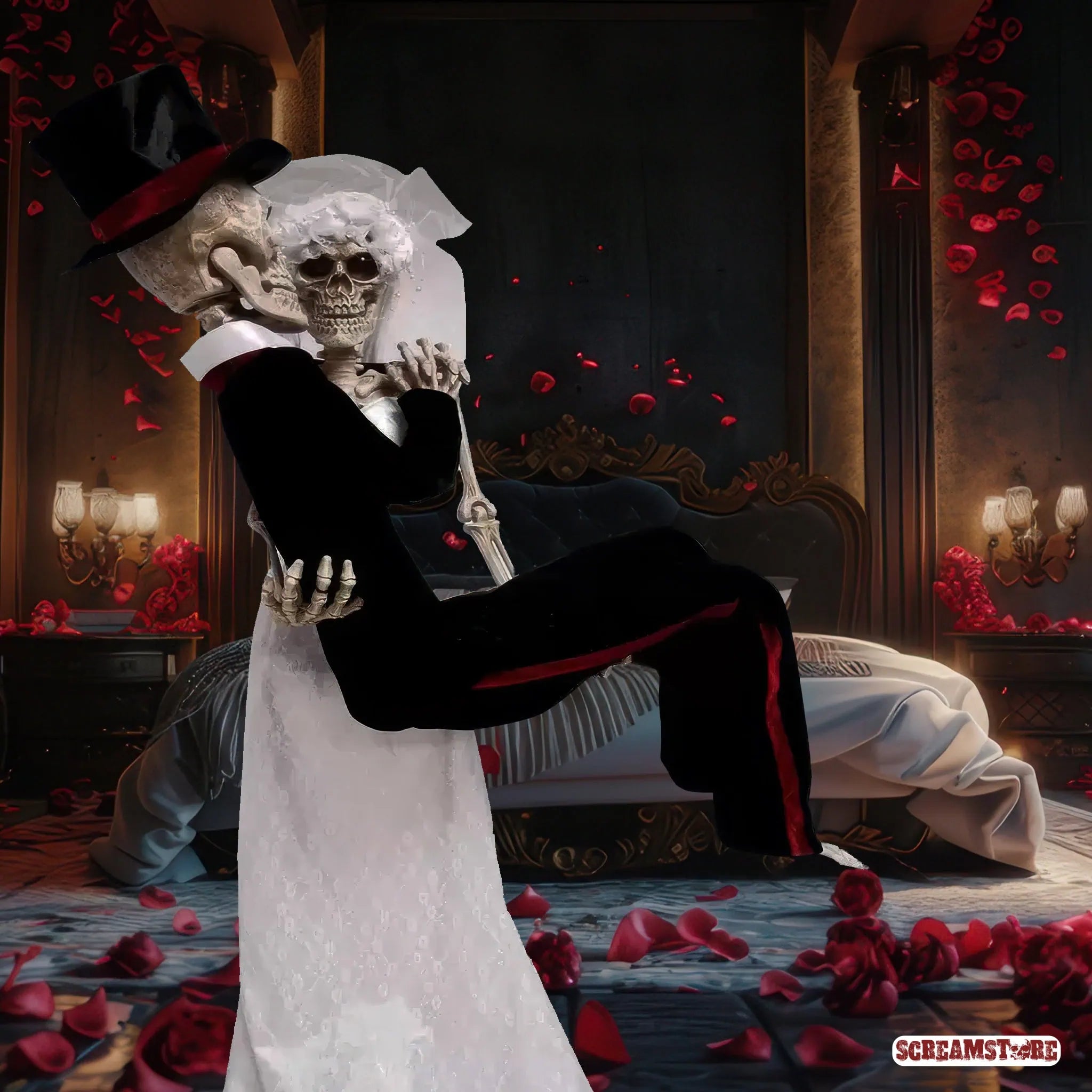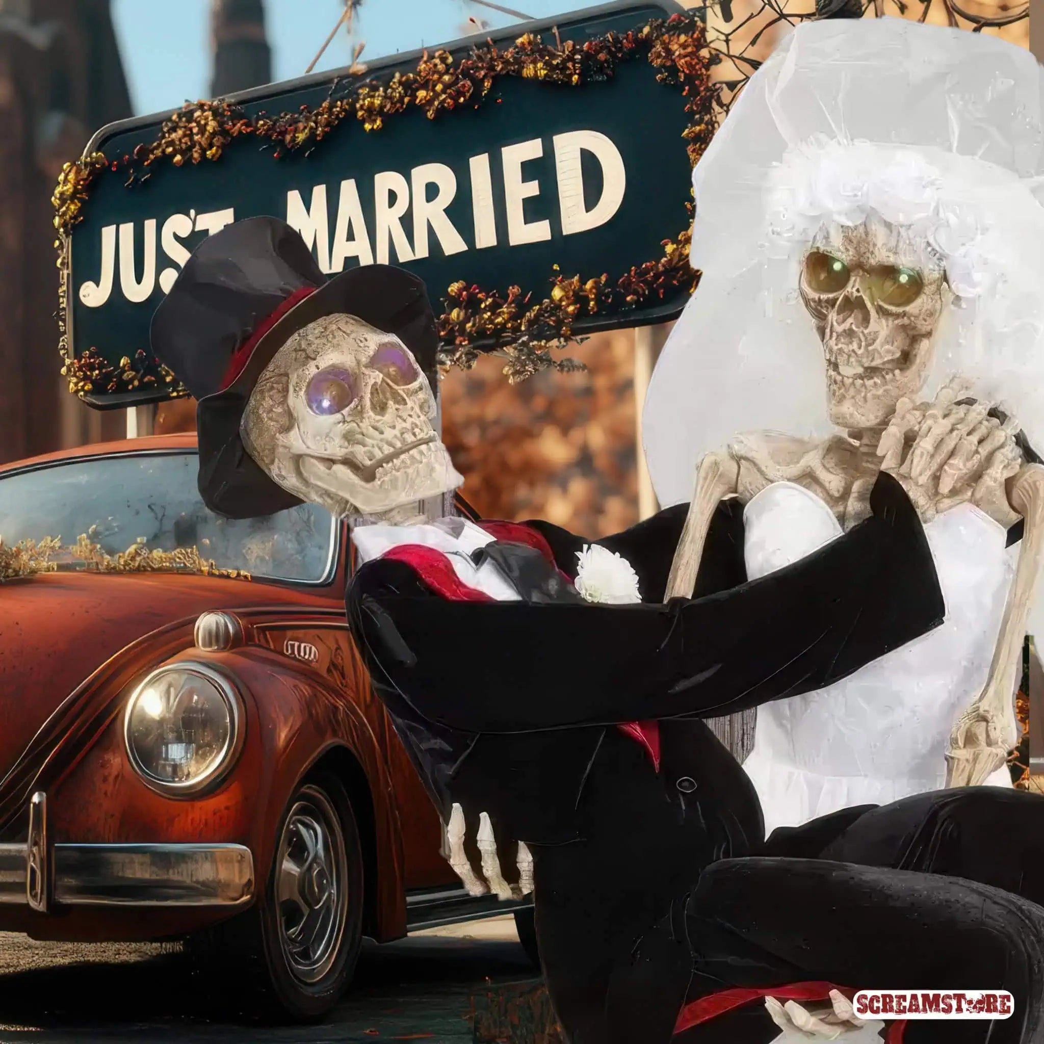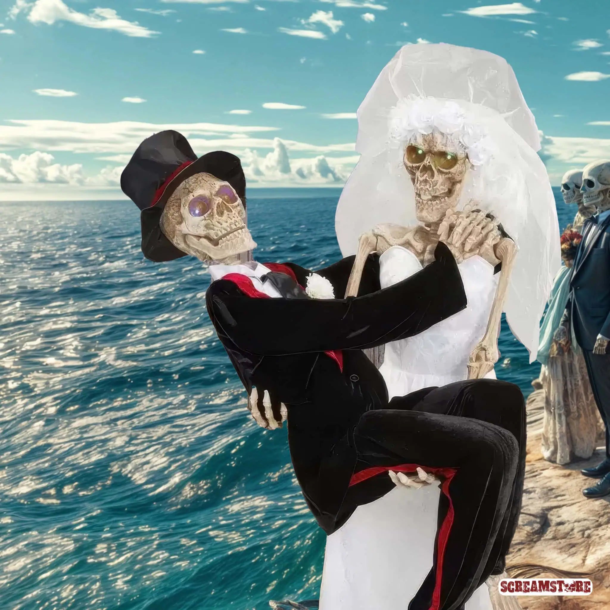 Die Hochzeitsglocken läuten... auch wenn das Brautpaar ein bisschen knochig ist! Aber hey, wahre Liebe überdauert alles – sogar den Tod! Unsere Skelett-Honeymooners haben sich eindeutig für die Ewigkeit entschieden. Keine Scheidung möglich, nur ewige Zweisamkeit! Diese grandiose Doppel-Animatronic ist der ultimative Blickfang – und nicht nur an Halloween! Ob Junggesellenabschied, Hochzeit, dieses originelle, gruselige und lustige Duo schreit förmlich: "Nimm uns mit!" Und mal ehrlich, was wäre eine Hochzeit ohne ein paar gut gelaunte Skelette, die die Show stehlen? Exklusiv bei Screamstore! Schockverliebt? Wir auch!
