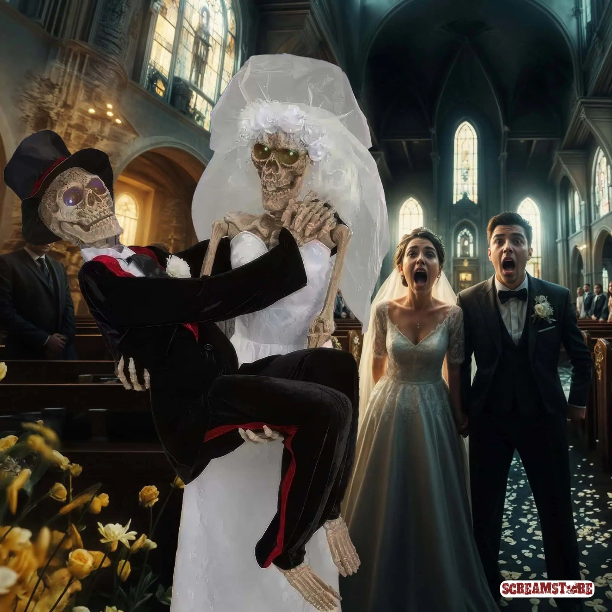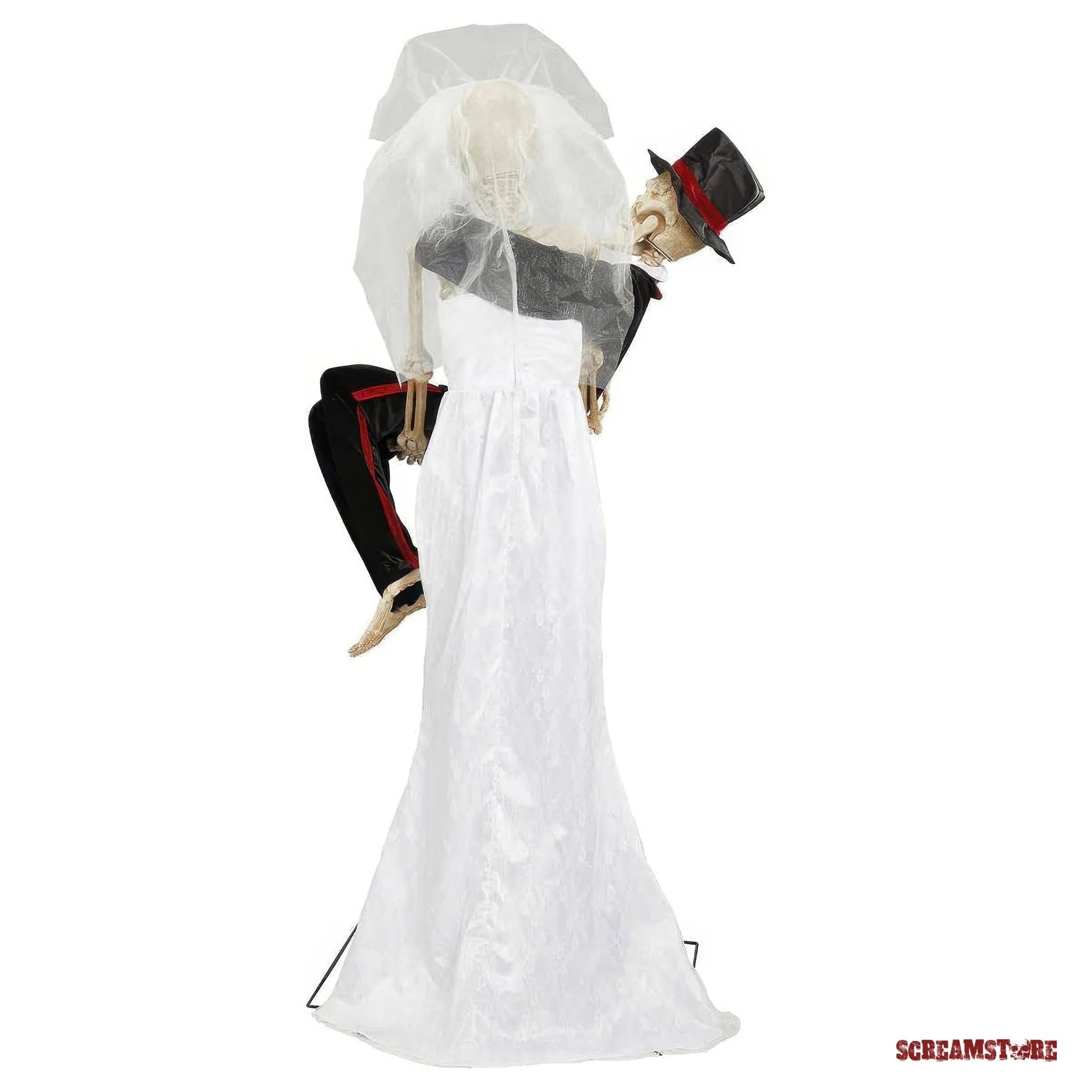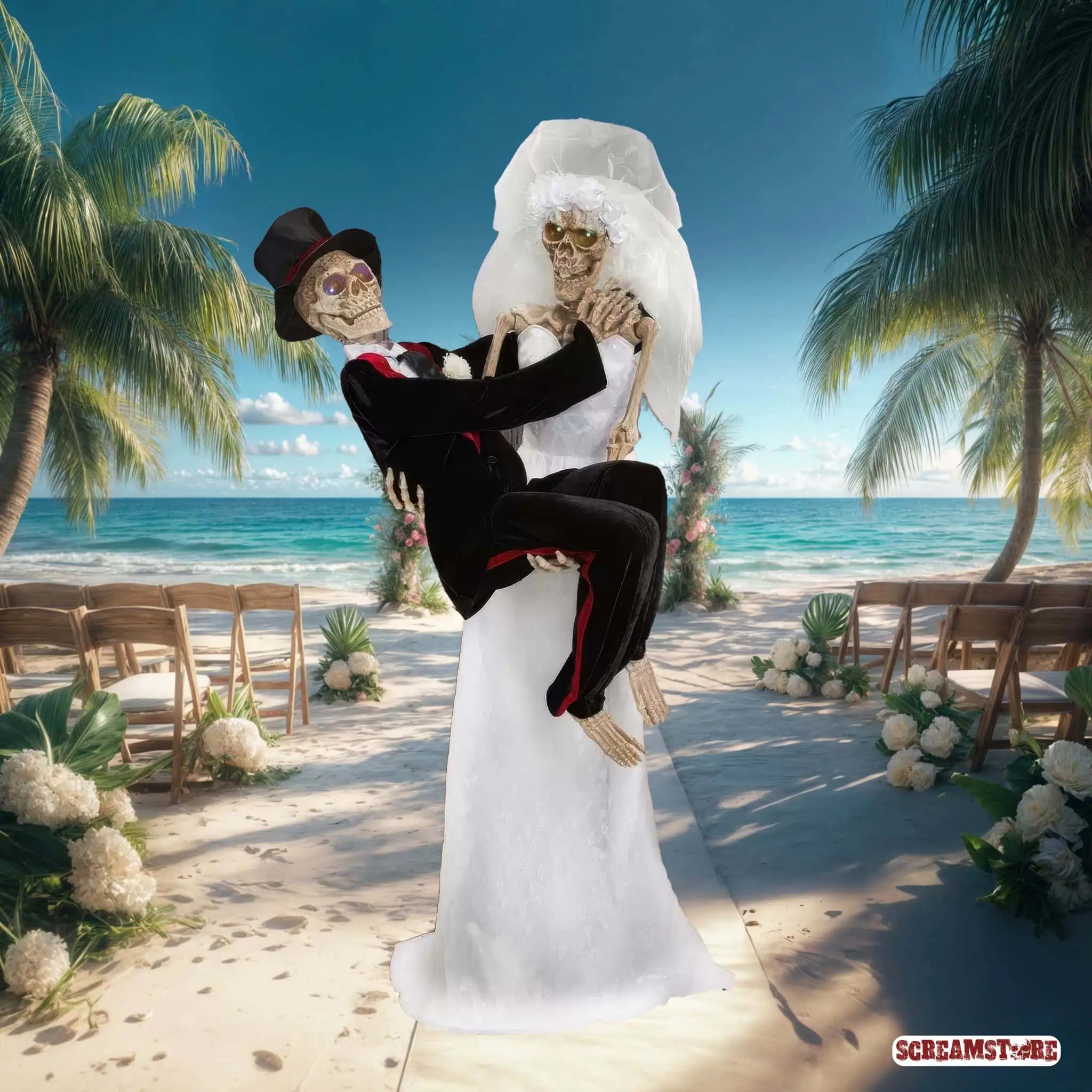 Die Hochzeitsglocken läuten... auch wenn das Brautpaar ein bisschen knochig ist! Aber hey, wahre Liebe überdauert alles – sogar den Tod! Unsere Skelett-Honeymooners haben sich eindeutig für die Ewigkeit entschieden. Keine Scheidung möglich, nur ewige Zweisamkeit! Diese grandiose Doppel-Animatronic ist der ultimative Blickfang – und nicht nur an Halloween! Ob Junggesellenabschied, Hochzeit, dieses originelle, gruselige und lustige Duo schreit förmlich: "Nimm uns mit!" Und mal ehrlich, was wäre eine Hochzeit ohne ein paar gut gelaunte Skelette, die die Show stehlen? Exklusiv bei Screamstore! Schockverliebt? Wir auch!
