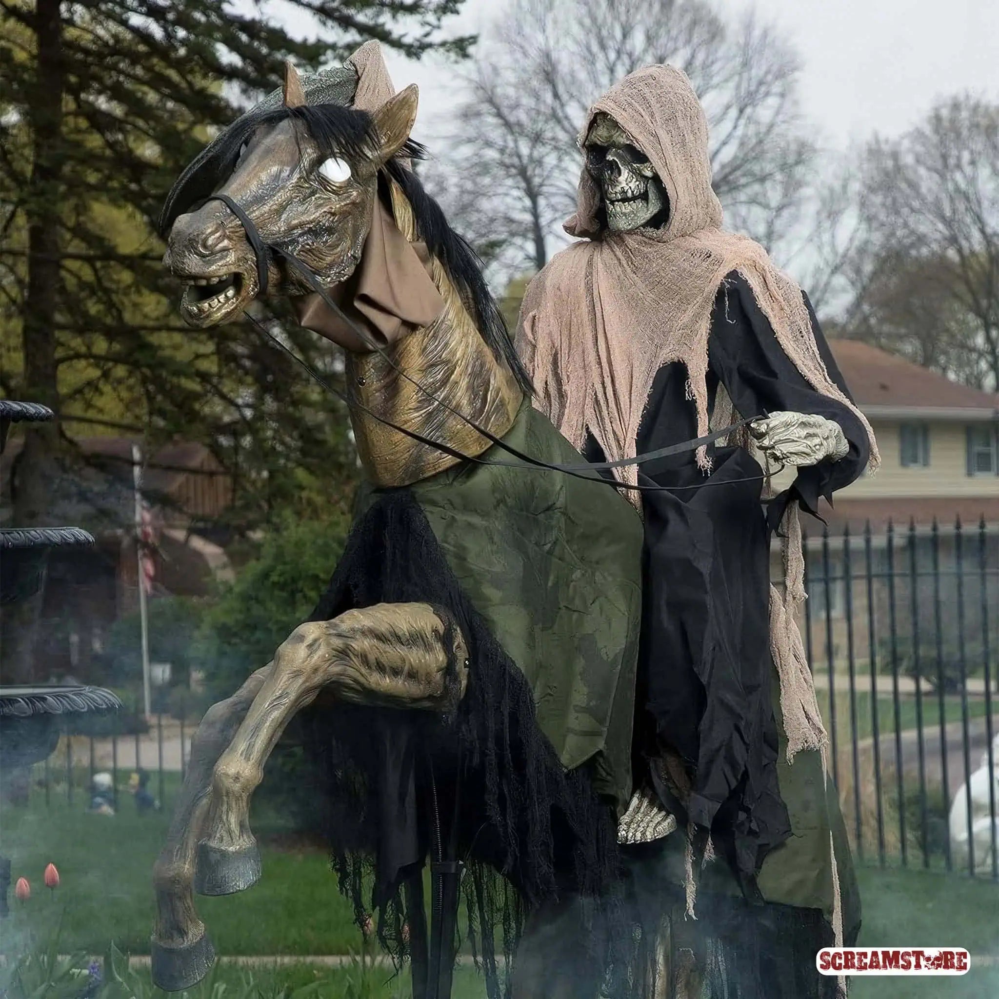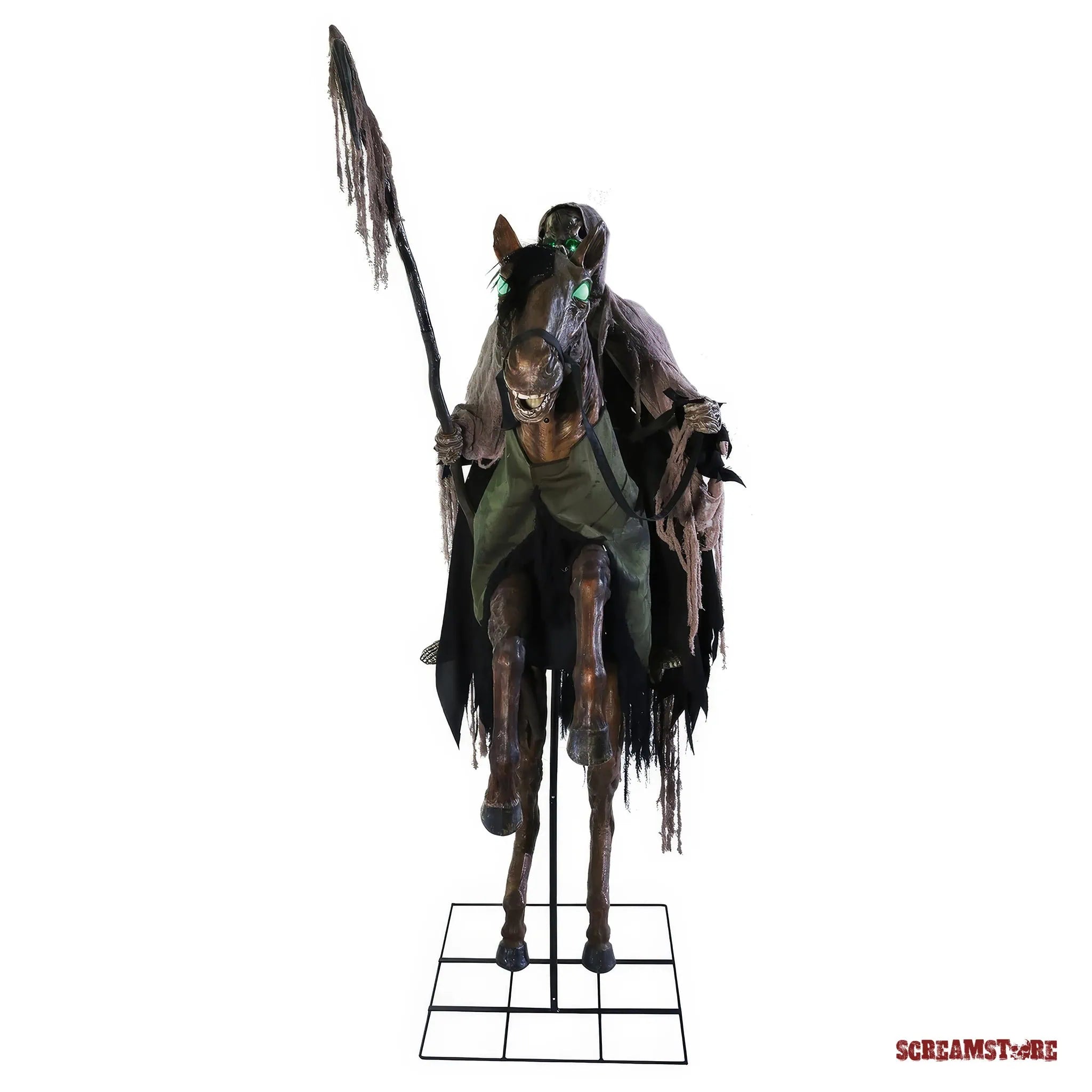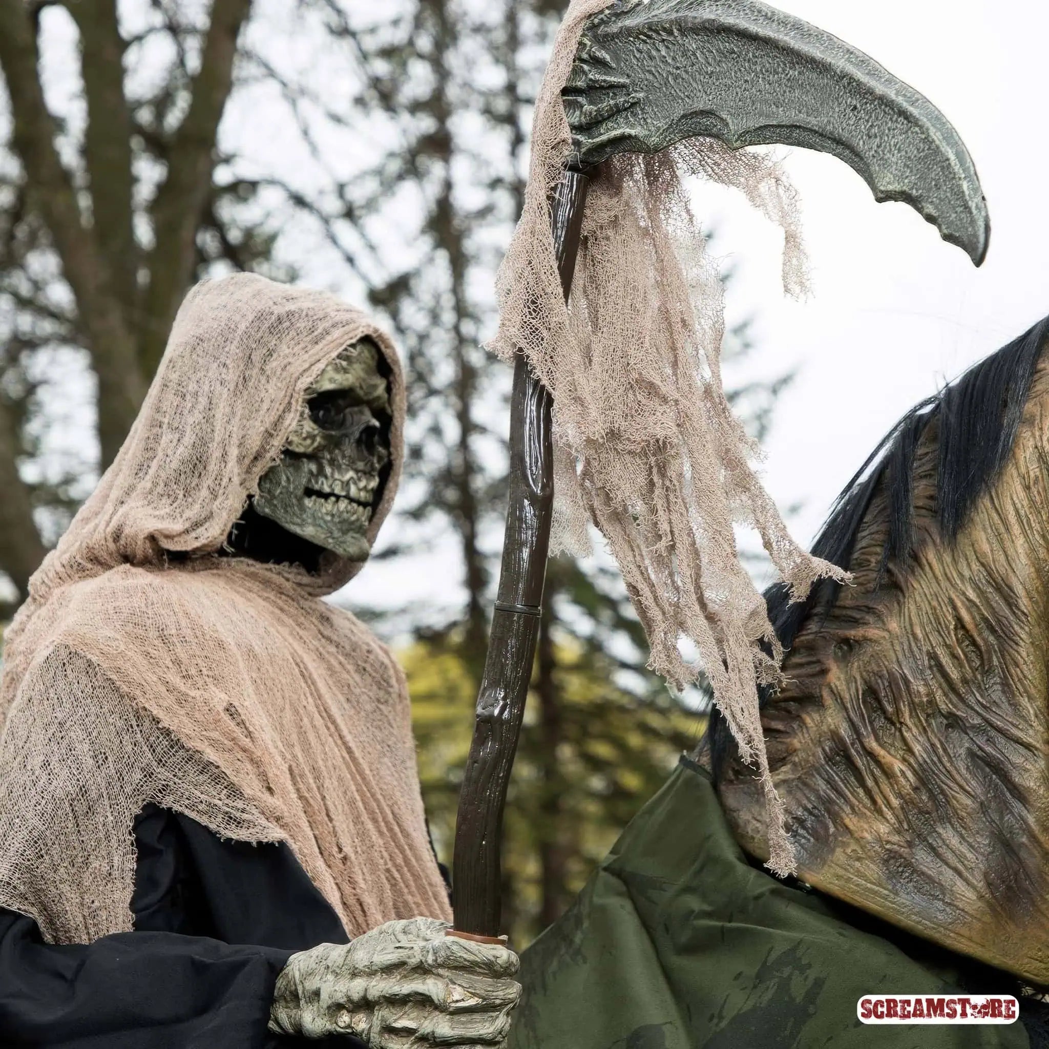 Unglaublich cool dieser Schocker der direkt den wildesten Träumen eines jeden Halloween Fans entspringt. Der Sensenmann hoch zu Roß auf dämonischer Mission. Wo er wohl gerade hinreitet um Angst und Schrecken zu verbreiten. Zu Dir vielleicht? Sicher dass Du ein Stelldichein mit einer der krassesten Animatronics ever überstehst. Denn spätestens wenn der schwarze Reiter dort oben seine Sense wetzt wird klar, das Leben ist kein Ponyhof. Und der Typ da oben, der meint es ernst, Tod-ernst! Hollywood Horror in einer Perfektion, dass selbst Geisterbahnen daneben blass aussehen.