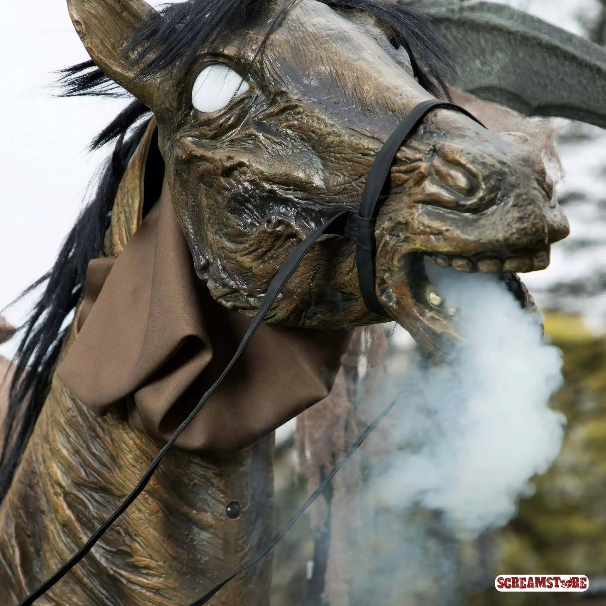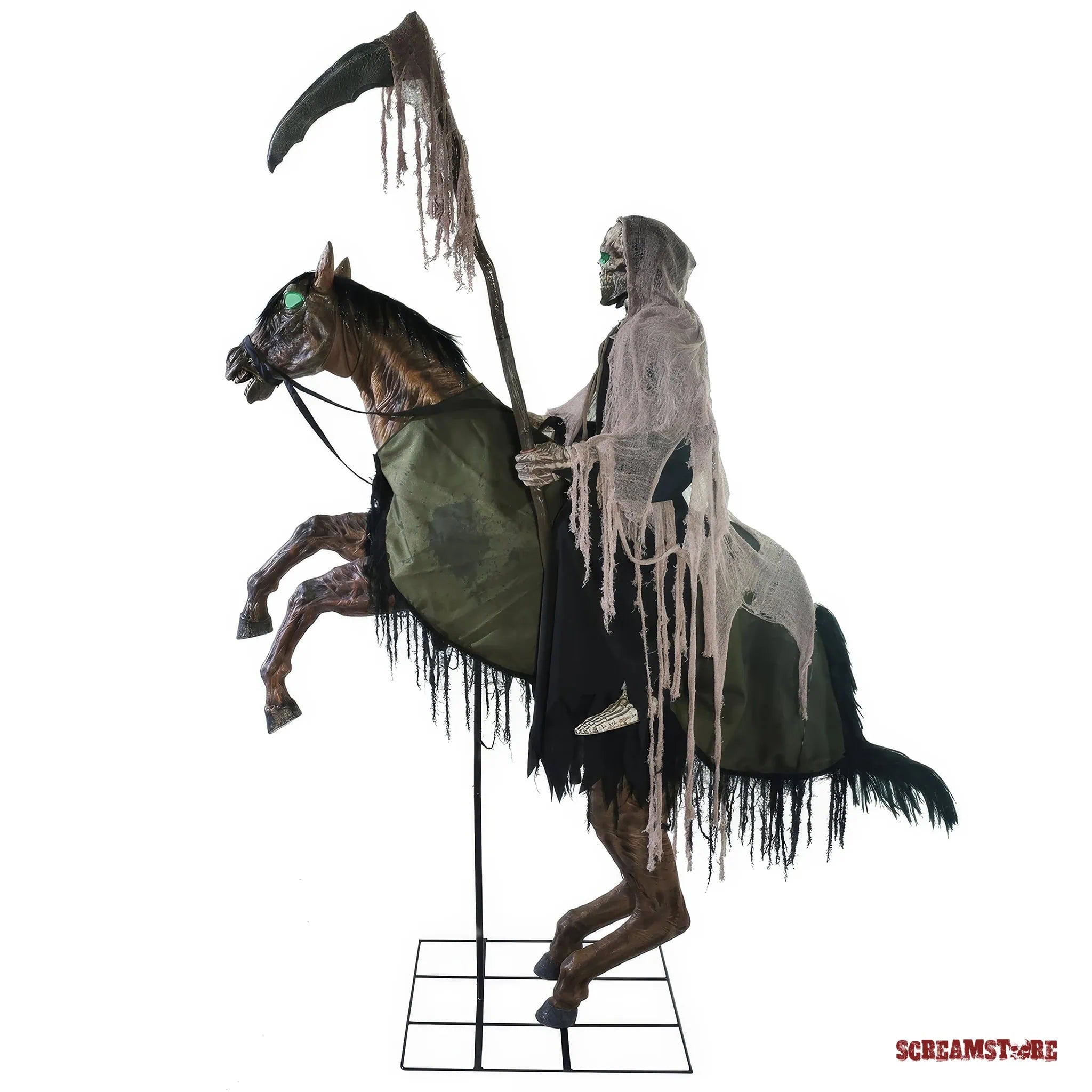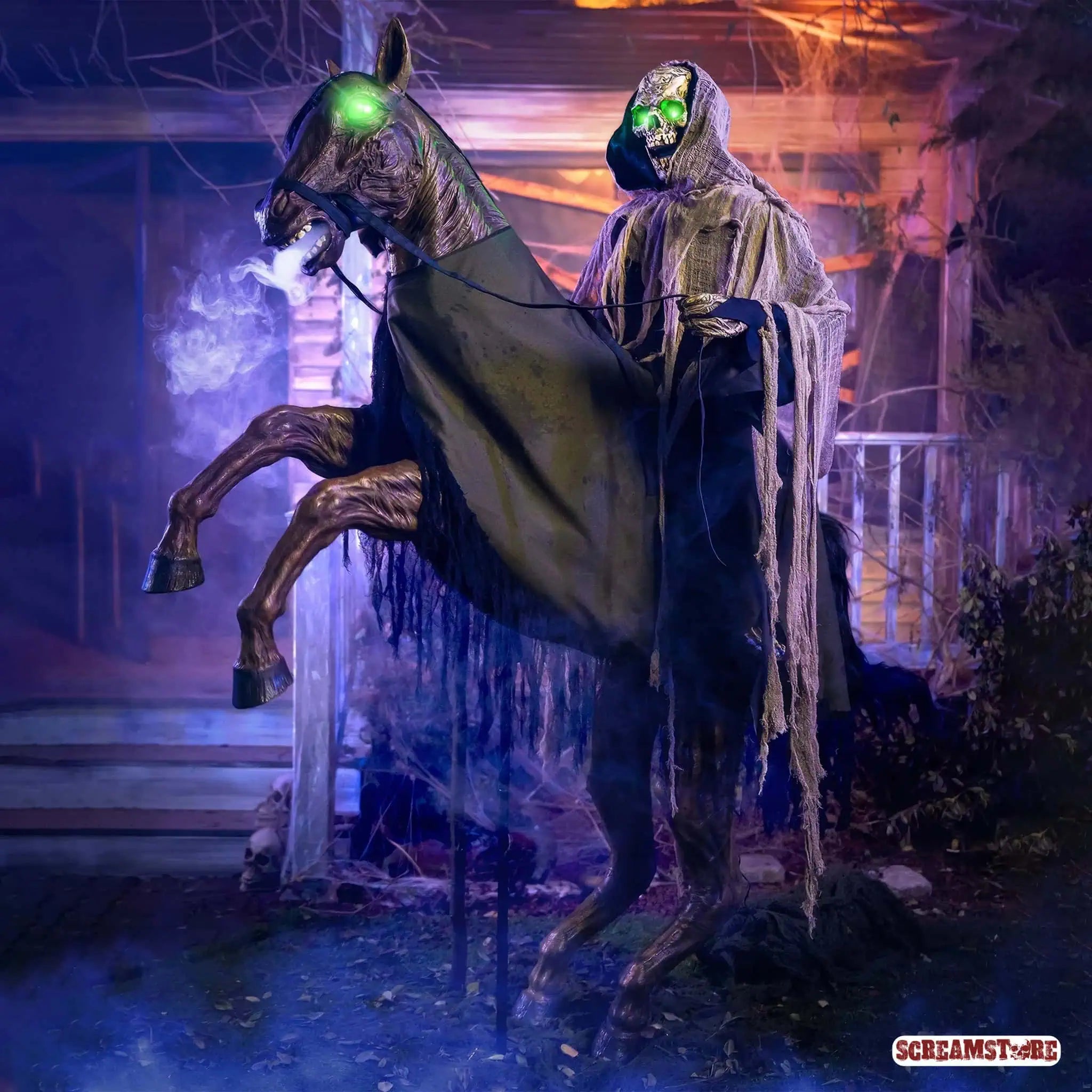 Unglaublich cool dieser Schocker der direkt den wildesten Träumen eines jeden Halloween Fans entspringt. Der Sensenmann hoch zu Roß auf dämonischer Mission. Wo er wohl gerade hinreitet um Angst und Schrecken zu verbreiten. Zu Dir vielleicht? Sicher dass Du ein Stelldichein mit einer der krassesten Animatronics ever überstehst. Denn spätestens wenn der schwarze Reiter dort oben seine Sense wetzt wird klar, das Leben ist kein Ponyhof. Und der Typ da oben, der meint es ernst, Tod-ernst! Hollywood Horror in einer Perfektion, dass selbst Geisterbahnen daneben blass aussehen.