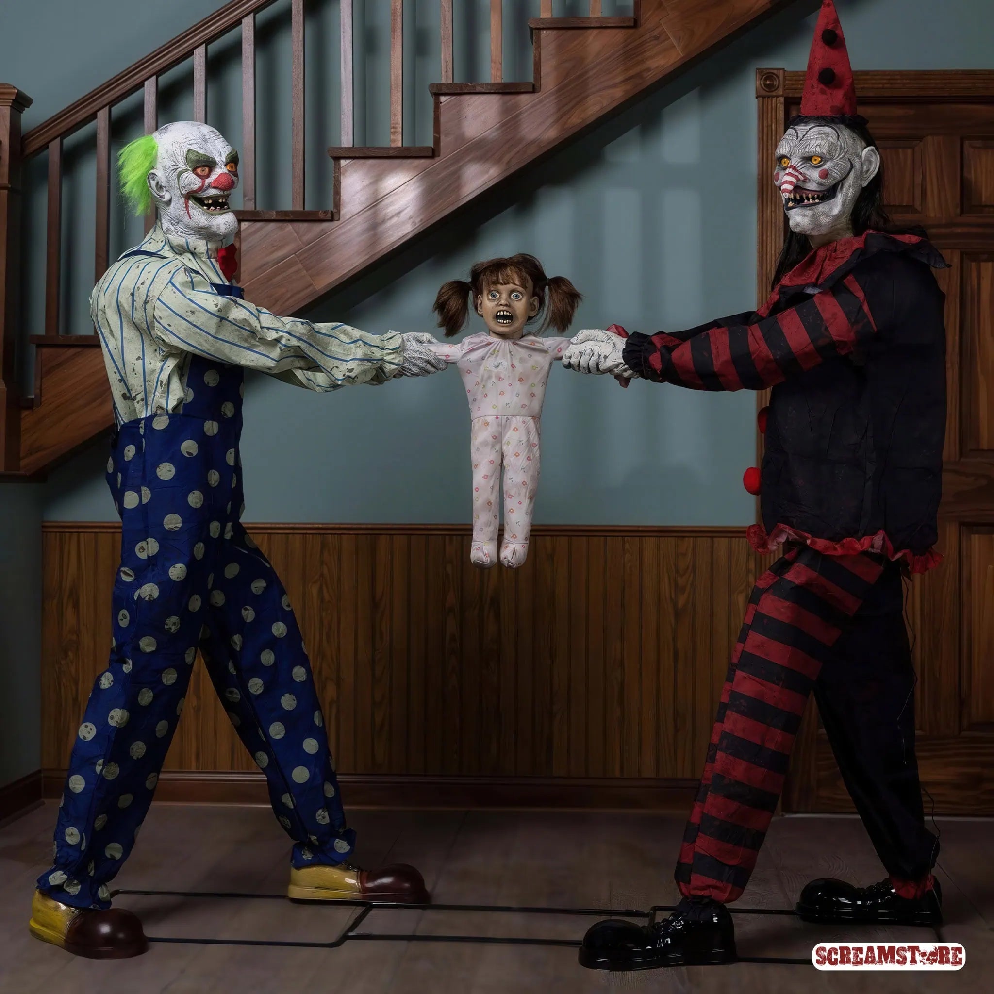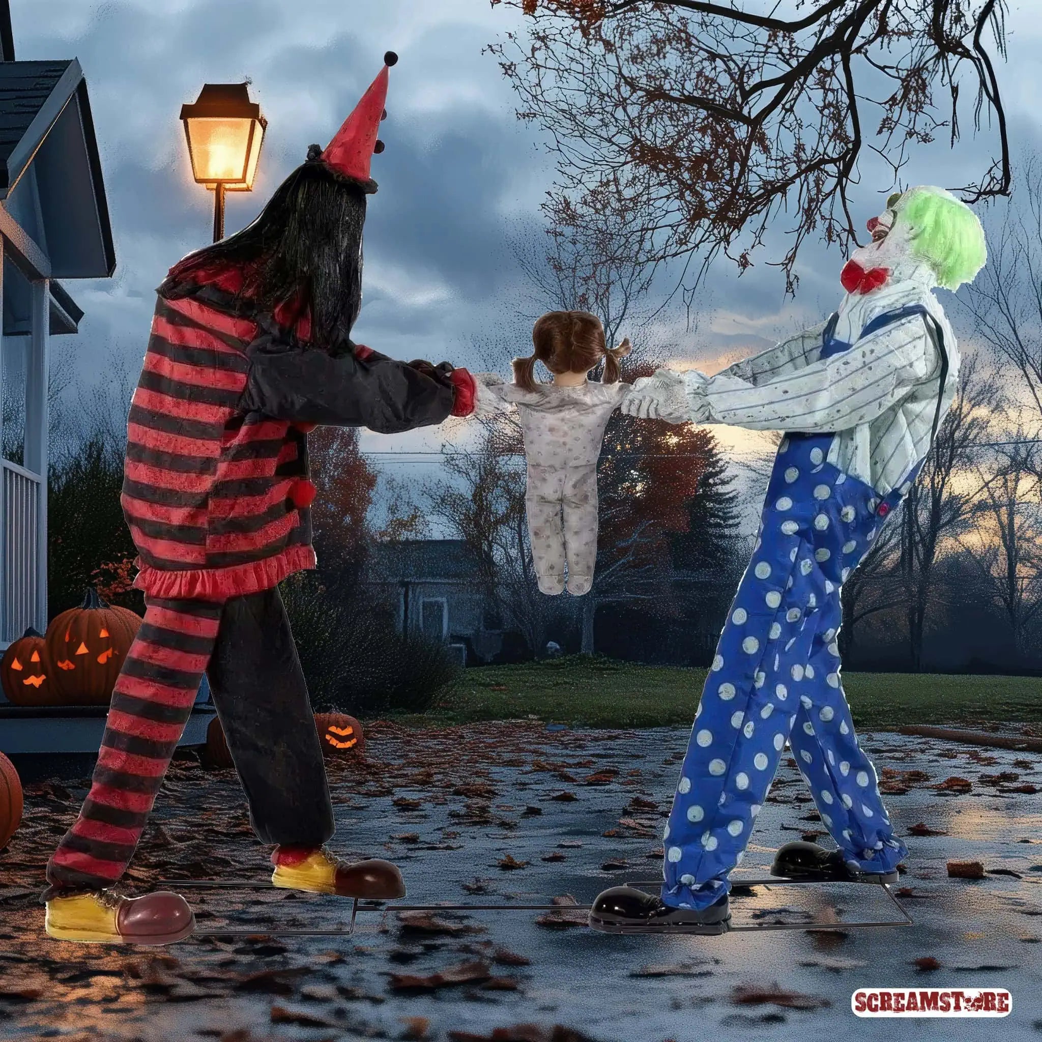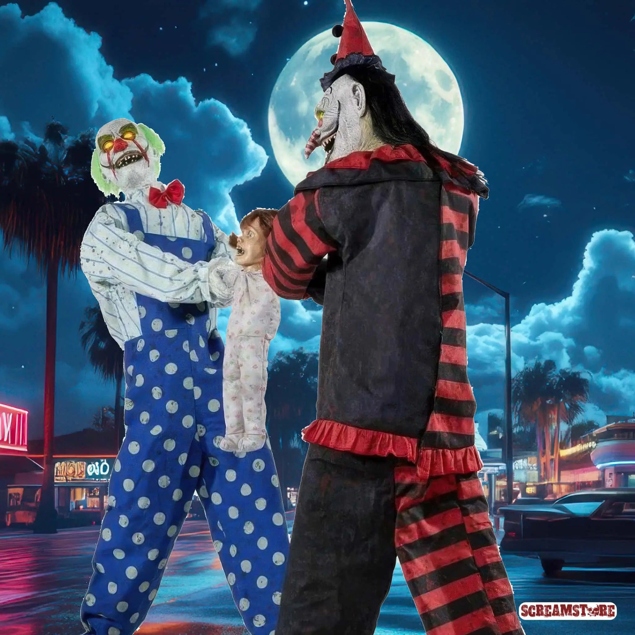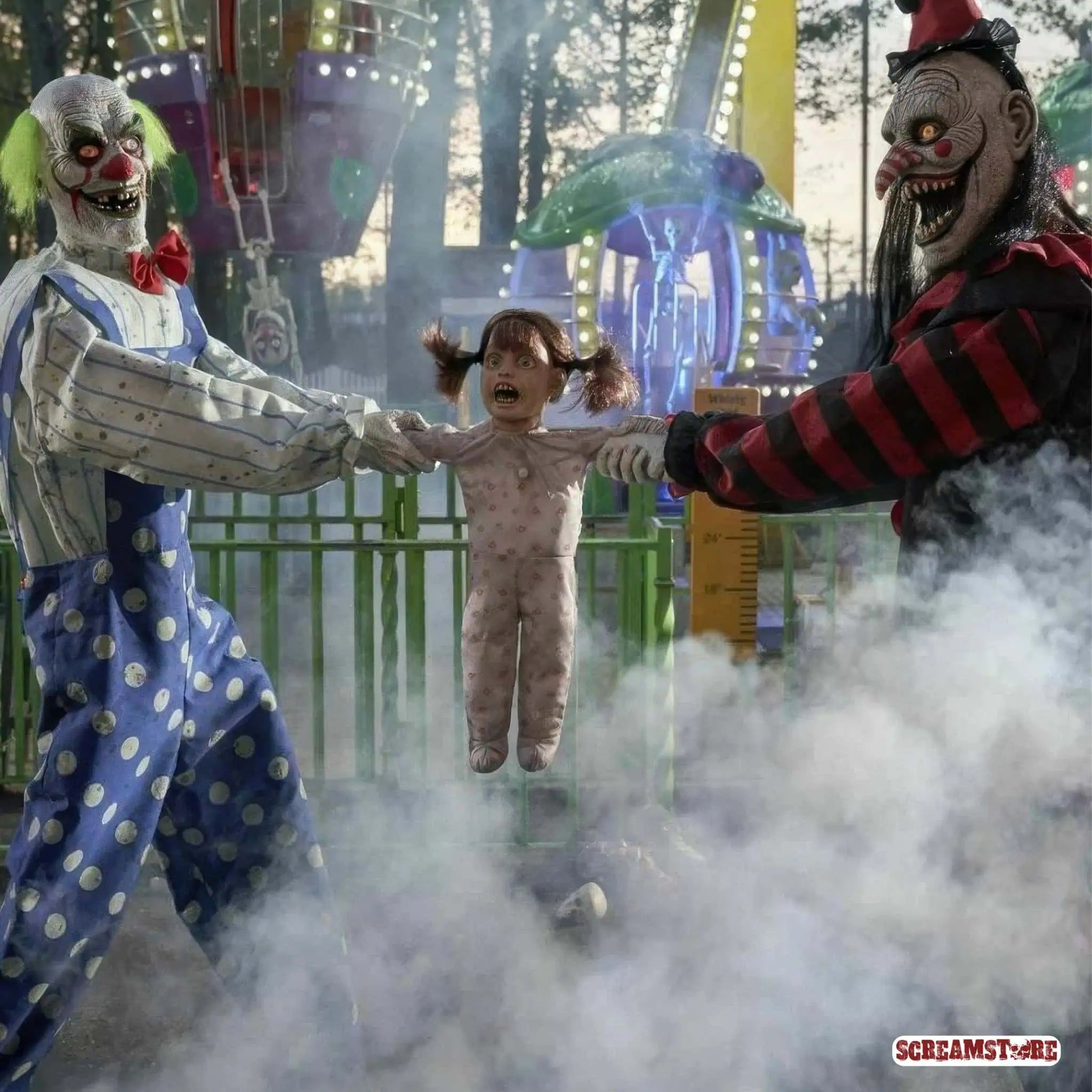 Wenn zwei sich streiten, freut sich der Dritte? Wohl kaum. Zumindest nicht dieses kreischende Balg, das im Beutemodus zwischen zwei Horrorclowns hin und her gerissen wird. Und wir? Wir stehen da wie ein Reh im Fernlicht, paralysiert – und begeistert vom hundsgemeinen Spektakel. Ein höllisch guter Cocktail aus Fratzen im Delirium, animiertem Fiebertraum und ohrenbetäubendem Gekreisch. Da wird aus der Kita ein Bootcamp und die Kleinen lernen schneller als gedacht: Das Leben ist kein Ponyhof, sondern eine Zombiefarm. Eine sensationelle Animatronic-Triade des Grauens – perfekt für echten Geisterbahn-Horror.