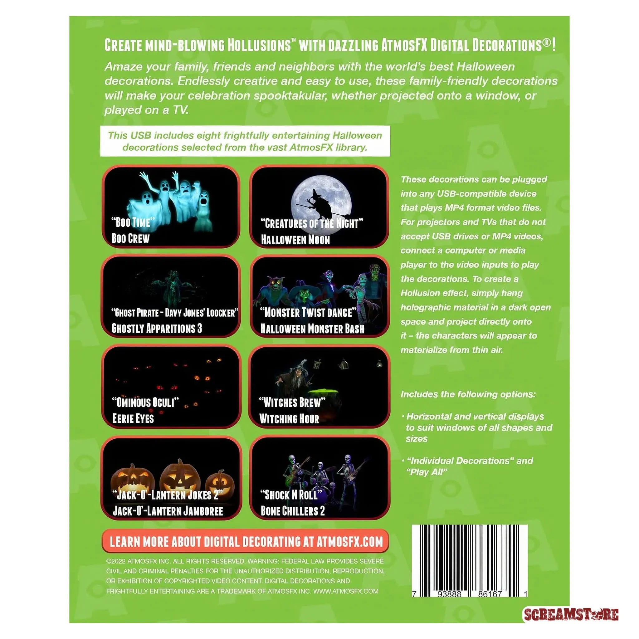 Nur die kultigsten Grusel-Videoclips schaffen es auf die legendäre USB AtmosFX Serie. Die Halloween Hollusion Decoration Sammlung ist ein absolutes Fest für Horror-Fans! Ob schaurige Gespenster, ein gruseliger Pirat, Dracula, Frankenstein und der tanzende Wolfman, die Hexe Hazel am Kessel oder die Skelettband – all das und mehr tummelt sich auf diesem Premium-Stick. AtmosFX hat die besten Videos aus verschiedenen Serien in HD-Qualität zusammengestellt.