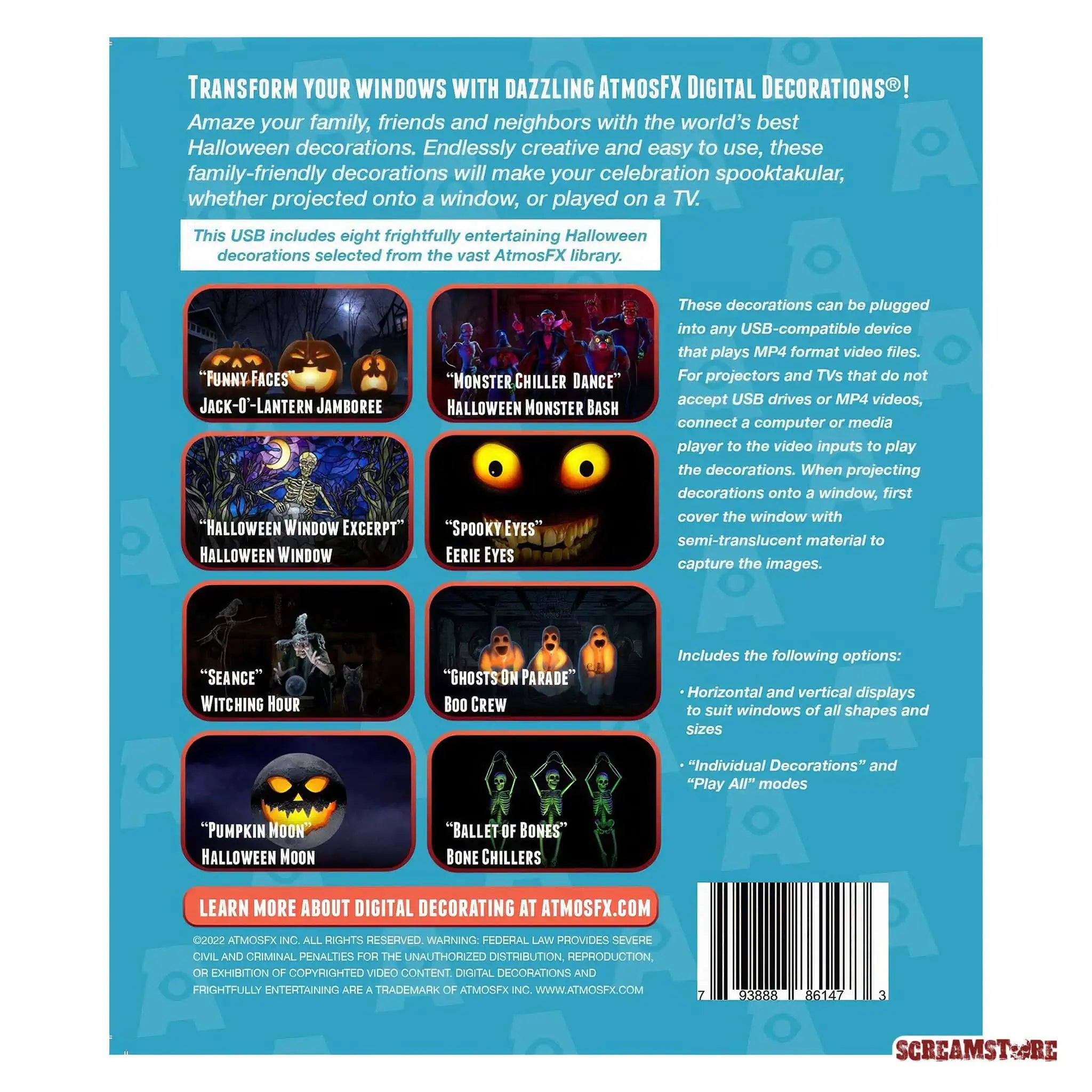 Dieser AtmosFX Halloween Special Effects Video USB Stick ist dein Ticket zu einer unvergesslich gruseligen Halloween-Party! Mit 8 verschiedenen Szenen verwandelt dieses magische AtmosFX Video dein Zuhause in ein Spukhaus der Extraklasse. Diese Videoeffekte machen aus jeder Umgebung ein atemberaubendes Spukhaus. Die Videos laufen in einer Endlosschleife für unendlich viel Spukspaß. Mit Highlights aus Jack-O’-Lantern Jamboree, Monster Bash, Eerie Eyes, Witching Hour, Boo Crew, Halloween Moon und Bone Chillers 2. Perfekt auch für kleinere Halloween Fans. Wer es noch gruseliger will kann zu den Spooky Versionen der USB Collections greifen. Bereite dich auf den ultimativen Gruselspaß vor und beeindrucke deine Gäste – der absolute Wahnsinn auf USB!