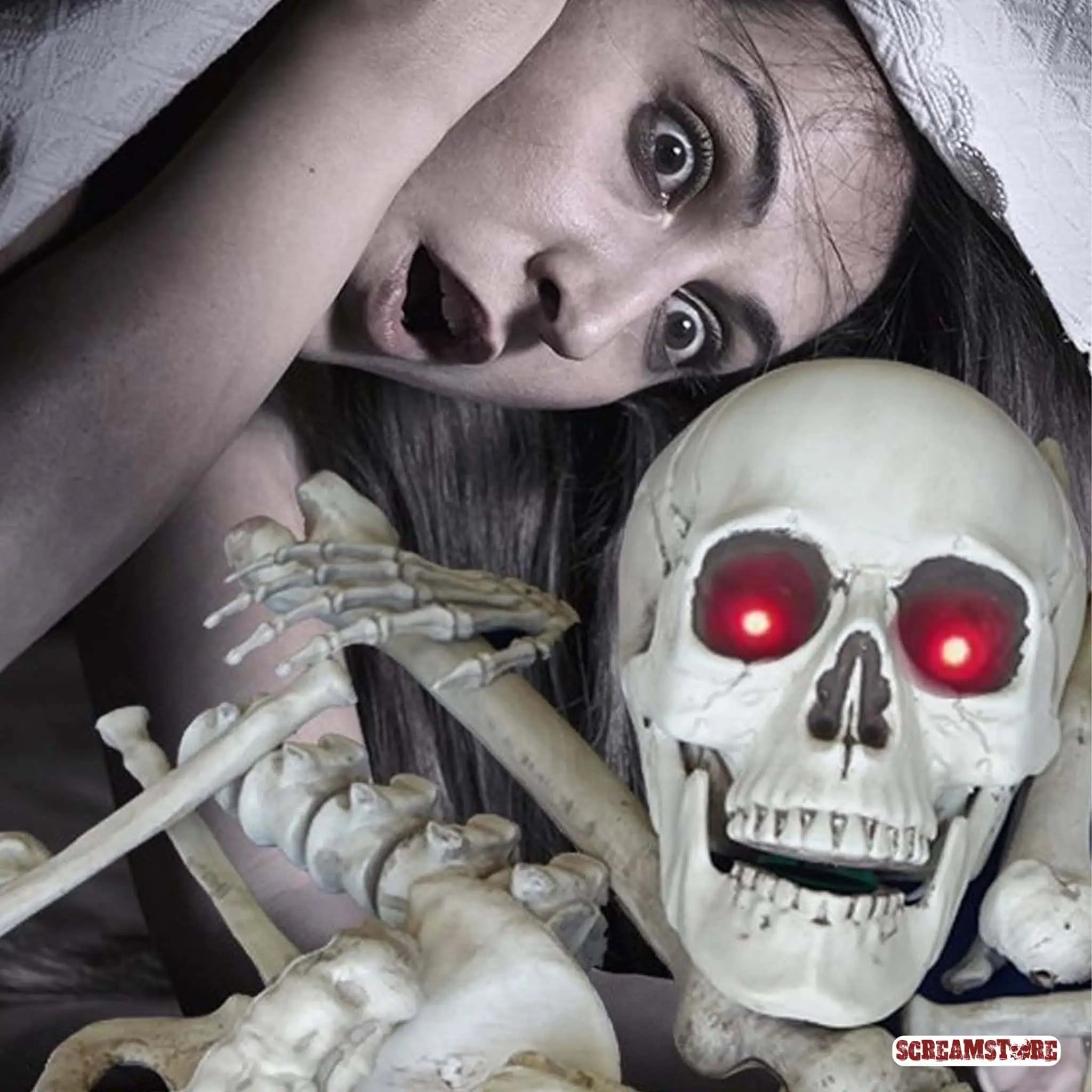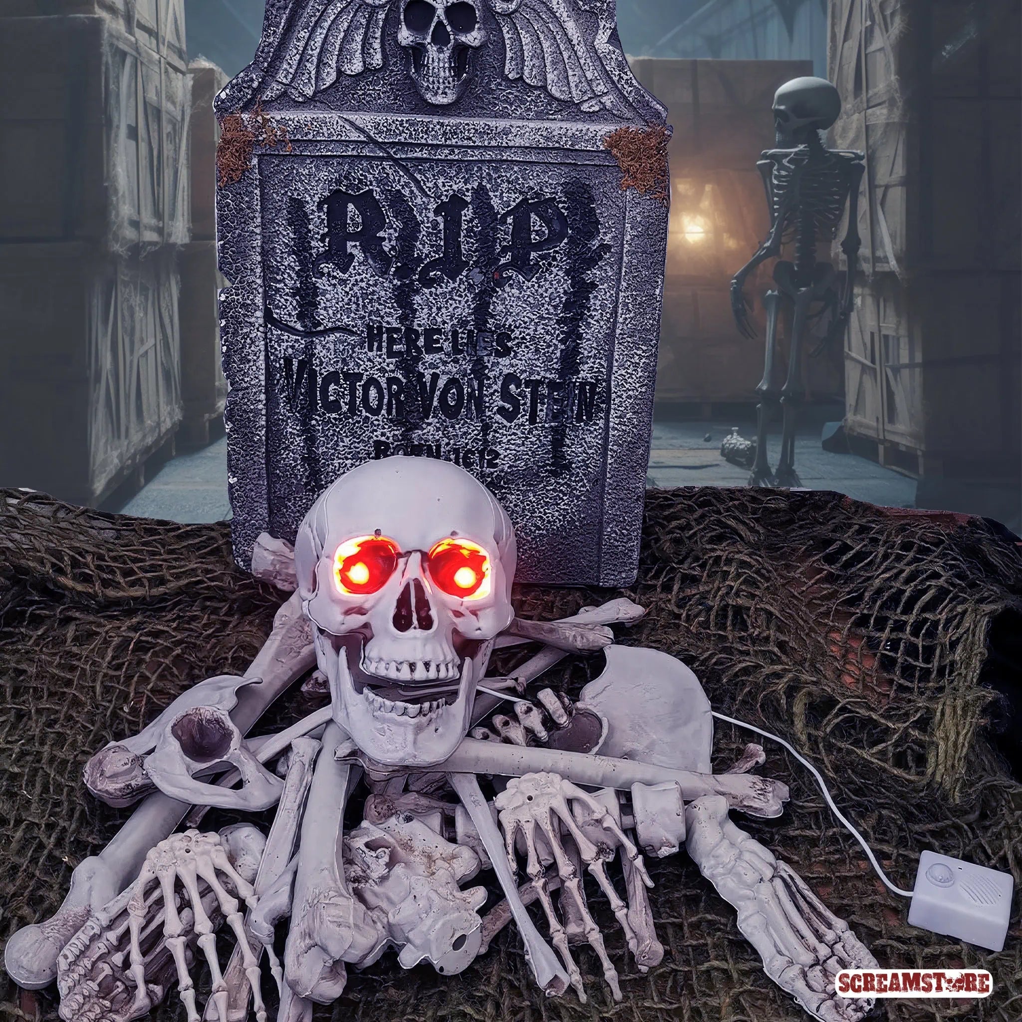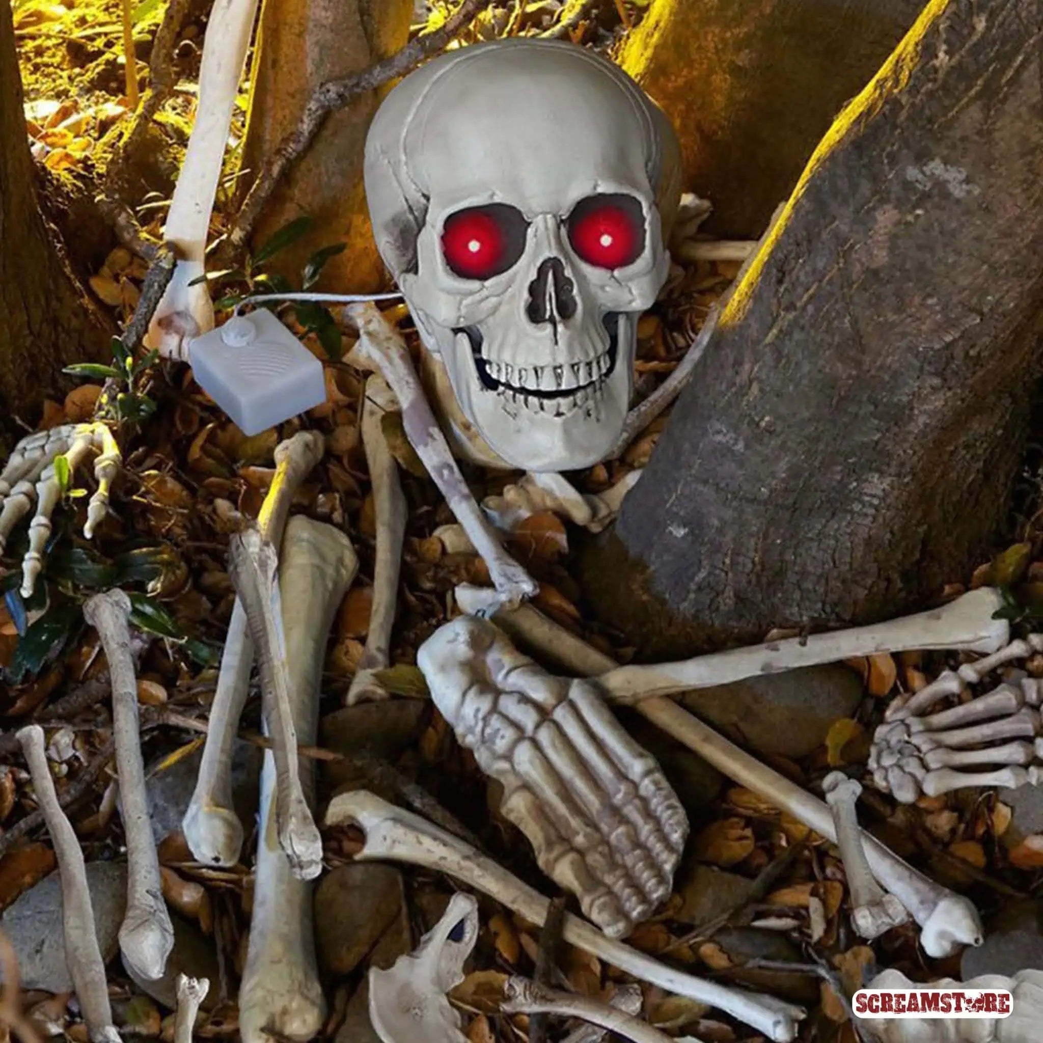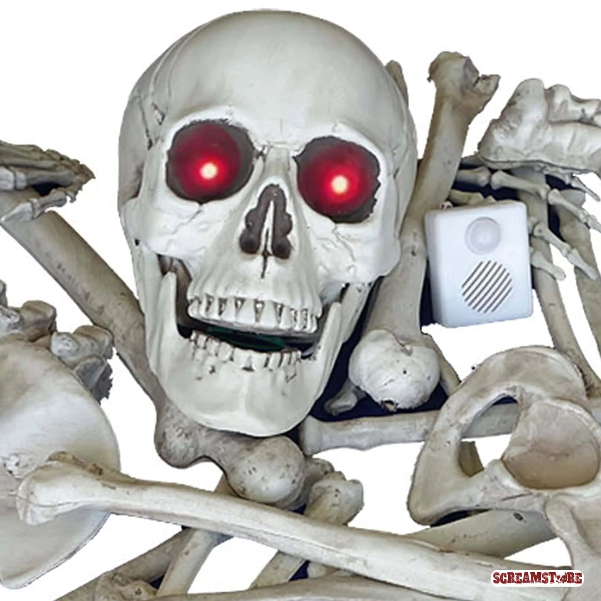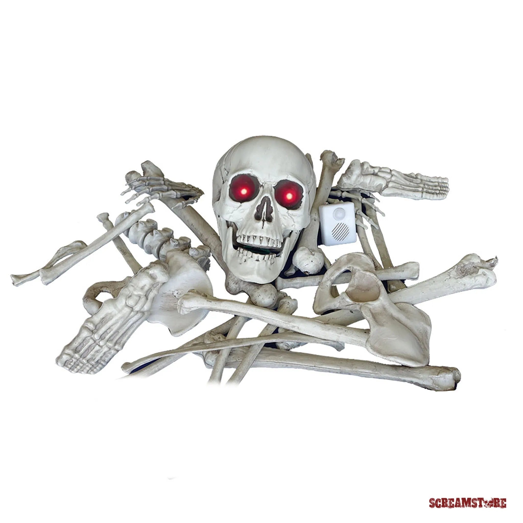 RIP – Rest in Pieces... 28 Teile purer Horror, die deine Gäste in Schockstarre versetzen werden. Einfach die Knochenteile ausstreuen, den Schädel aktivieren, und sobald sich jemand nähert, startet Bony seine Show. Ein düsteres Lachen aus einem bekannten Horrorfilm, das das Blut gefrieren lässt, und wild blinkende, blutrote Augenhöhlen sorgen für Gänsehaut pur. Irre cool, irre laut, und dank Spezialsensor entgeht Bony kein Opfer, selbst in tiefster Dunkelheit. Der absolute Knaller auf jeder Horror-Party! Die externe IR-Sensor-Box hat genug Kabel, um sie perfekt zu verstecken und den Schrecken noch effektiver zu machen.