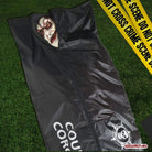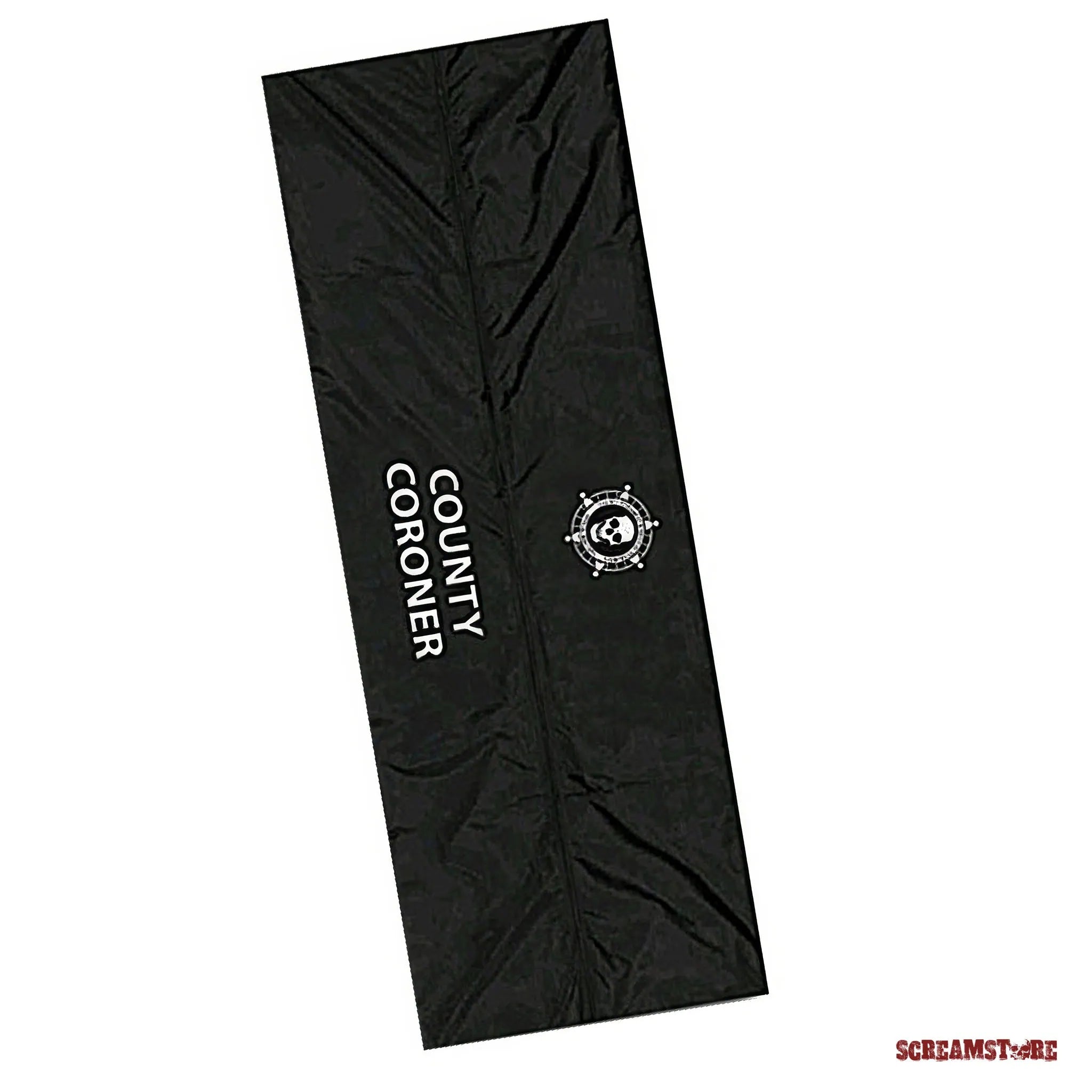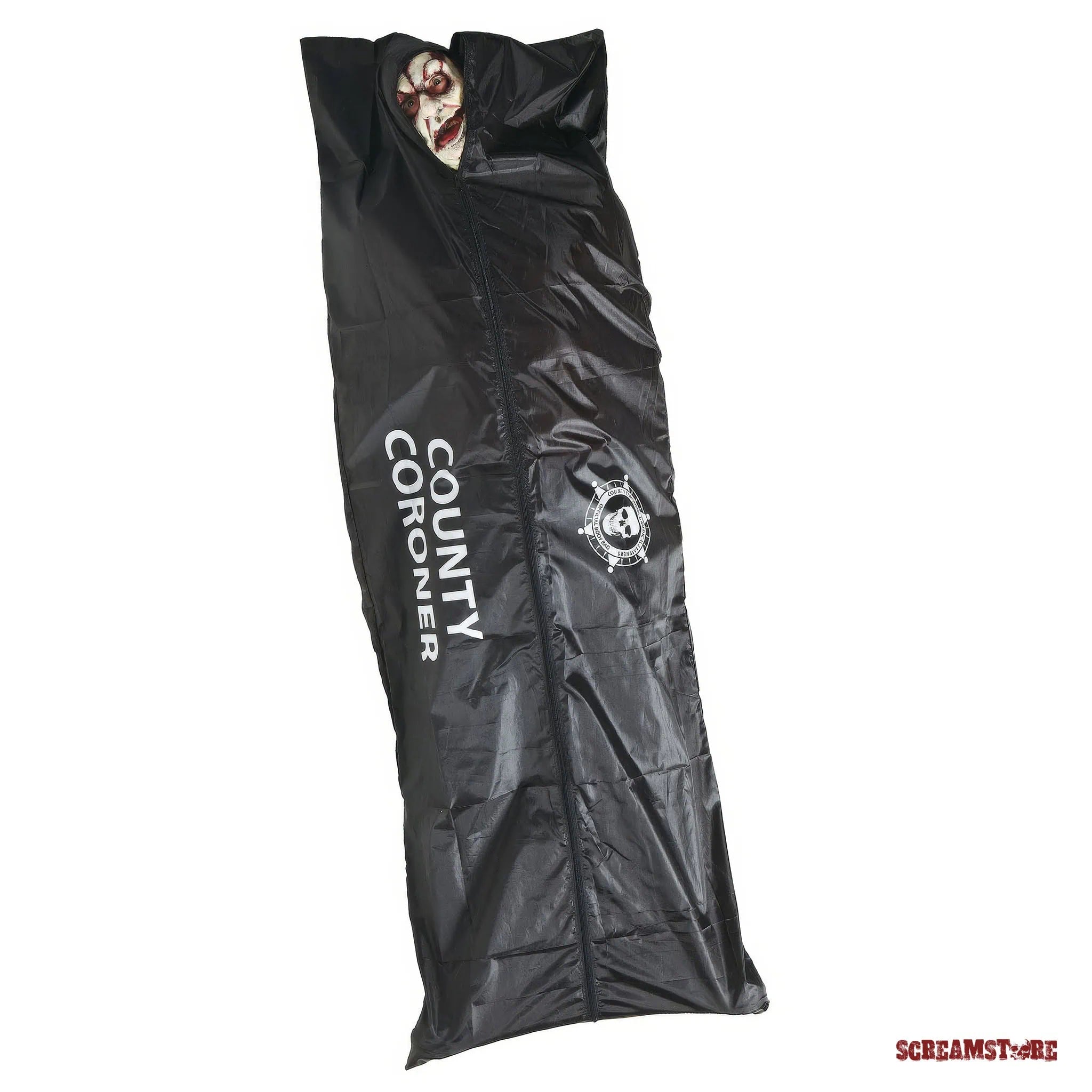 Wenn dieser Sack ausgepackt wird steht es schlecht um die Gesundheit. Denn dieses Behältnis ist ausschließlich Leichen vorbehalten. Praktisch, wenn man die Reste vom Schlachtfest dann hier nur reinwirft. Reißverschluss zu und ab damit. Wollen wir hoffen, dass unsereins nie in so einem fiesen Wegwerfbeutel landet. Dazu gibt es die Maske eines ausgemergelten Zausels obendrauf. Einfach in den ausgestopften Sack legen und schon ist die Leiche fertig. Instant Horror. Und wenn es noch echter sein soll, einfach einen unserer ultrarealistischen Köpfe dazu kaufen oder einen Fuß oder einen Arm rausbaumeln lassen.