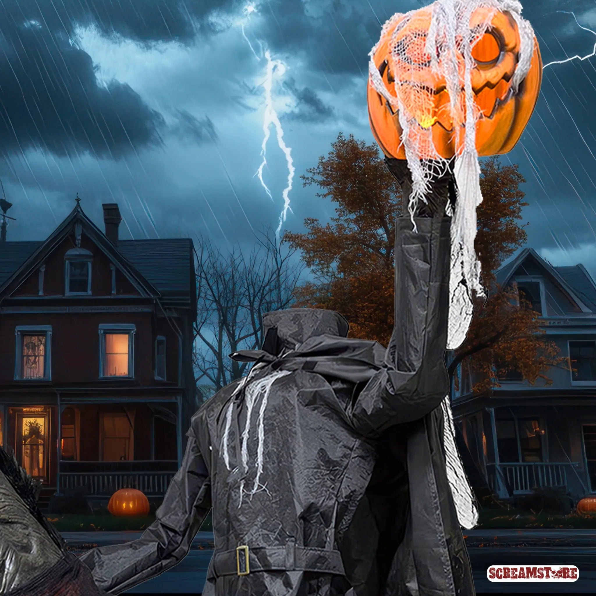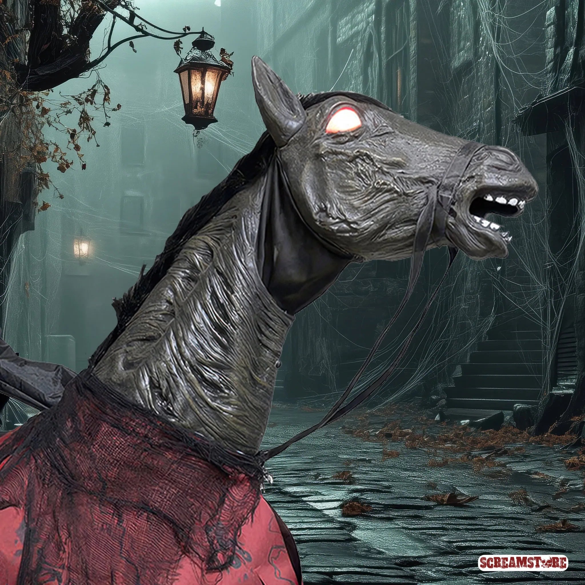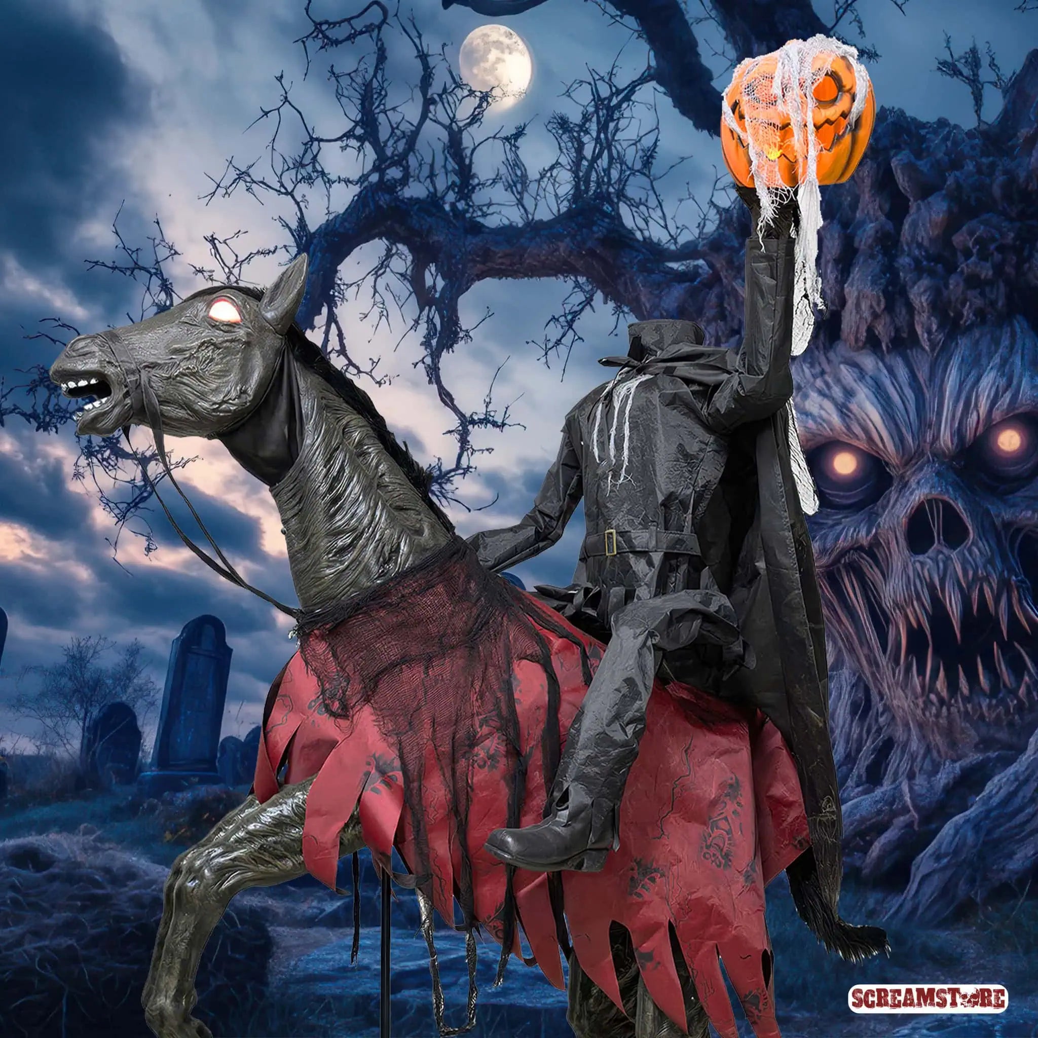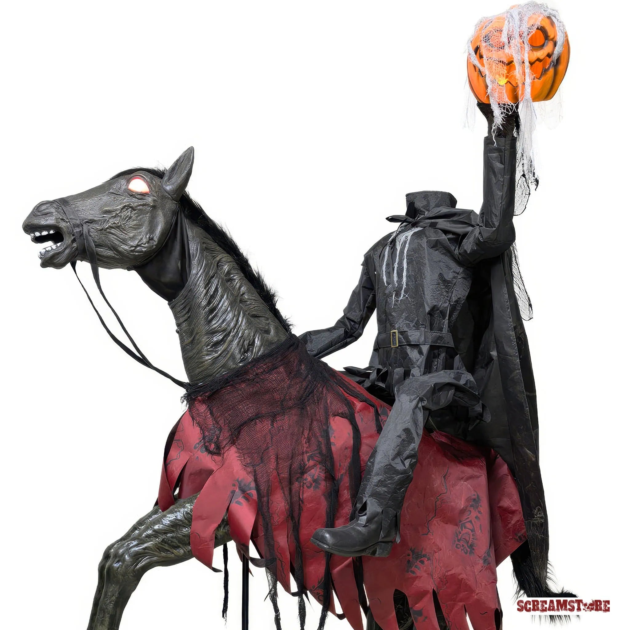 Horror hoch zu Ross – kopflos, gnadenlos und unaufhaltsam! Dieses finstere Duo galoppiert durch den Nebel und bringt die Apokalypse mit sich. Der kopflose Reiter hält einen grinsenden Jack O’Lantern – das unheilvolle Symbol des Todes – fest in seiner Hand. Sein dämonisches Ross mit glühenden Augen bäumt sich wild auf – bereit, jeden, der sich ihm in den Weg stellt, gnadenlos niederzutrampeln. Zusammen sind sie die lebendige Verkörperung des Bösen auf vier Hufen, eine gigantische Albtraum-Symphonie aus Licht, Sound und Bewegung, die deine Nerven zerreißt. Für alle, die das Dunkle lieben und Platz für echte Geisterbahn Schocker haben: Mach dich bereit für den unheilvollsten Ritt deines Lebens. Und ja, da steht ein Pferd auf dem Flur – und es wird dir den Atem rauben.