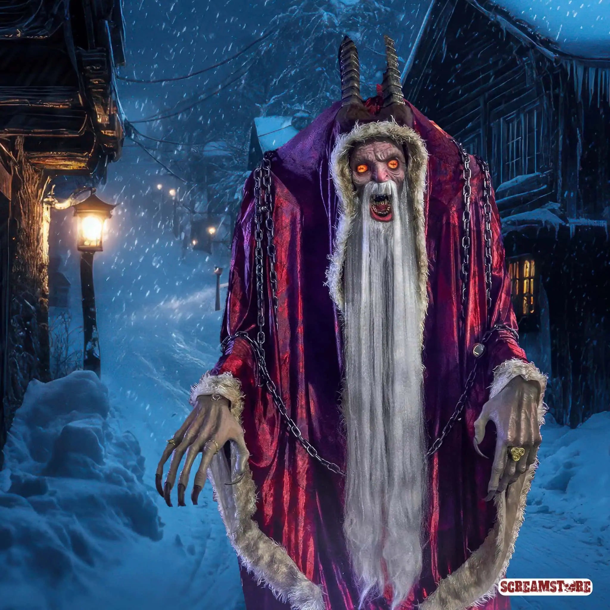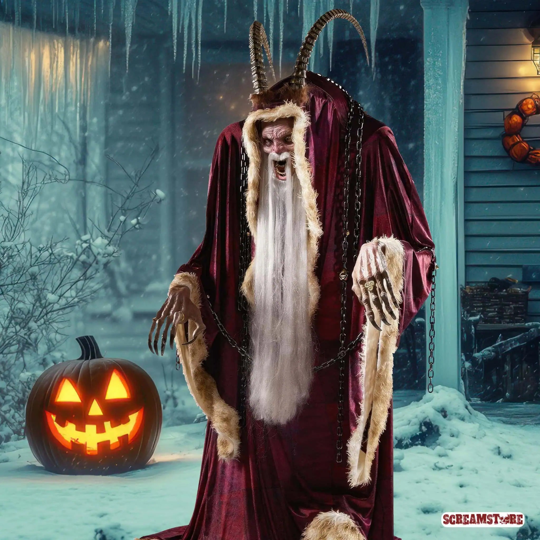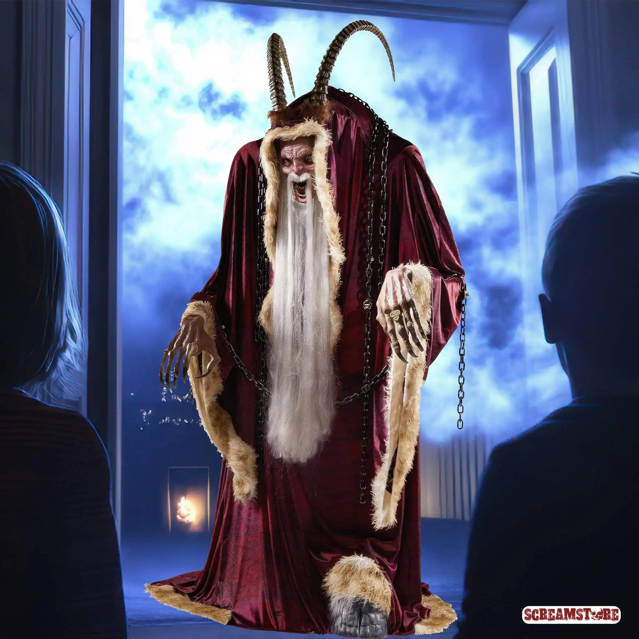 Halloween crashes X-Mas... mit über zwei Metern finsterer Erhabenheit tritt Krampus aus dem Schatten. Leuchtende Augen, ein Geweih wie ein Fluch und Ketten, die jedes gute Gewissen klirren hören: Dieser Dämon kennt keine Gnade – und keine Pause zwischen den Feiertagen. Er schwankt mit bedrohlicher Gelassenheit, sein Blick tastet das Publikum ab, während aus der Tiefe Lautsprecher dröhnen: Glockengeläut, dämonisches Röhren, der Soundtrack zum Ende aller Wunschzettel. Sein Kopf dreht sich langsam – als würde er Namen prüfen. Und keiner war brav. Krampus ist nicht bl0e Deko. Er ist ein Ritual. Ein Fest der Furcht. Ein teuflisches Kunstwerk, das dein Halloween aufwertet – und dein Weihnachten verflucht. Verfügbar nur jetzt in exklusiver Kleinmenge. Nur für Jene, die bereit sind, den wahren Geist der dunklen Jahreszeit einzuladen. Verdammt, das wird ein Fest! Hinweis: Kostenintensiver Spezialimport daher der Preis.