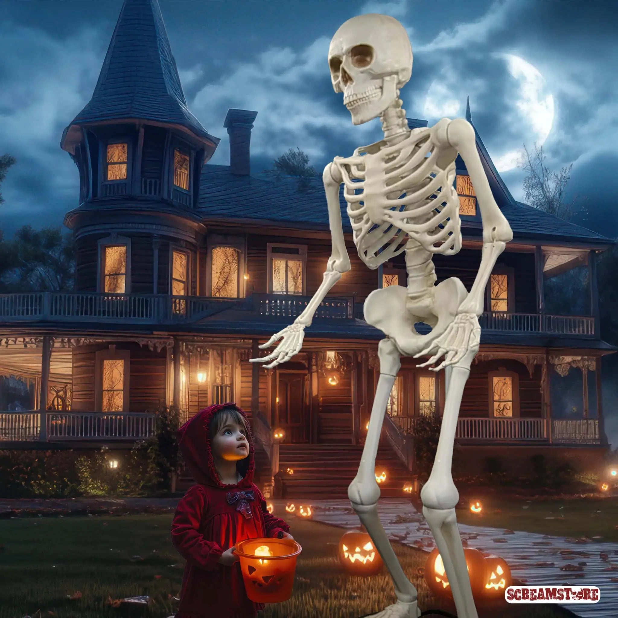 Bony war schon immer größenwahnsinnig – jetzt ist er endlich auch wahnsinnig groß! Dieses gigantische 3,4 Meter Skelett überragt einfach alles. Jeder Einzelknochen so monumental, dass selbst ein Saurier neidisch würde. Und das Beste: Der Aufbau geht schneller als Bony „Fleischreste“ sagen kann. Ein Schocker der Saison, der deinen Vorgarten, Kathedralen oder Treppenhäuser in knochige Albtraum-Bühnen verwandelt. Extrem stabil, alles überragend und garantiert nichts für zarte Gemüter. Beweglich und posierbar, ganz ohne Elektronik – hier übernimmt die schiere Größe den alles überragenden Effekt. Der Season-Hammer für alle, die meinen, „zu groß“ gäbe es nicht. It's a Bony!!!!