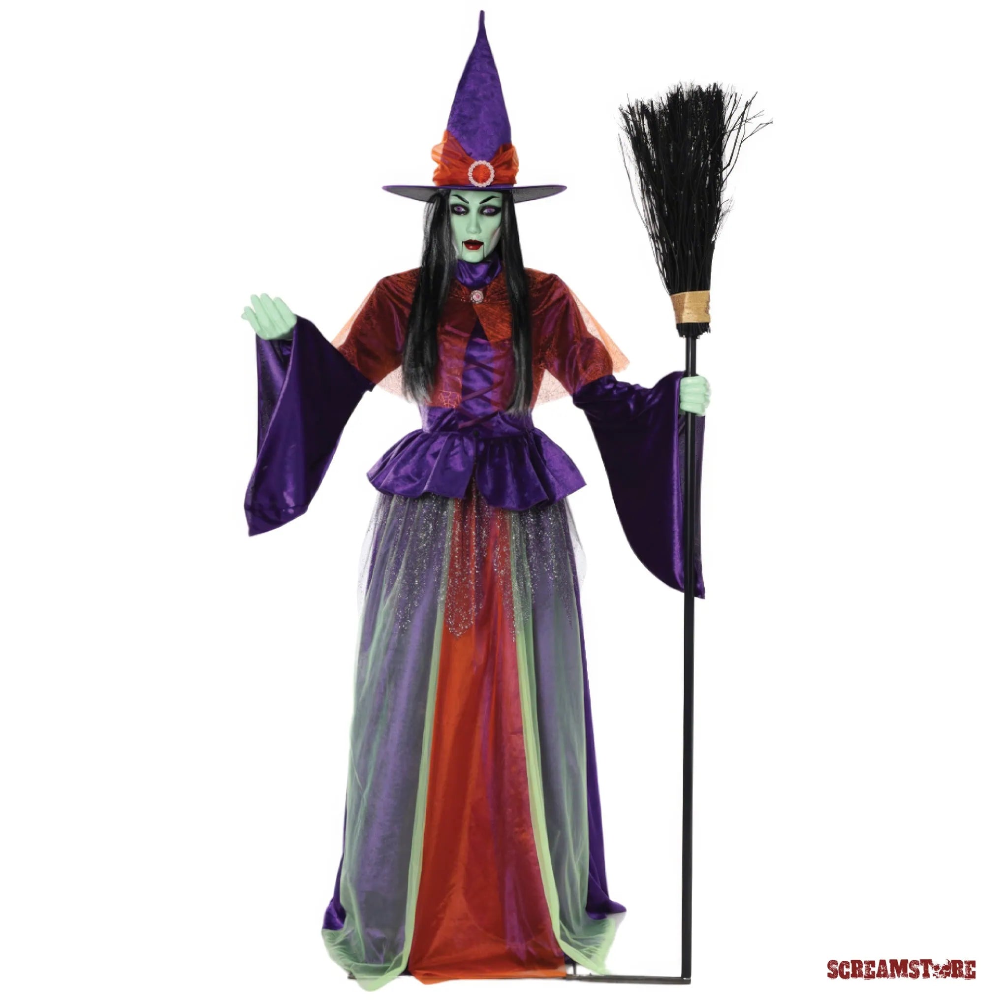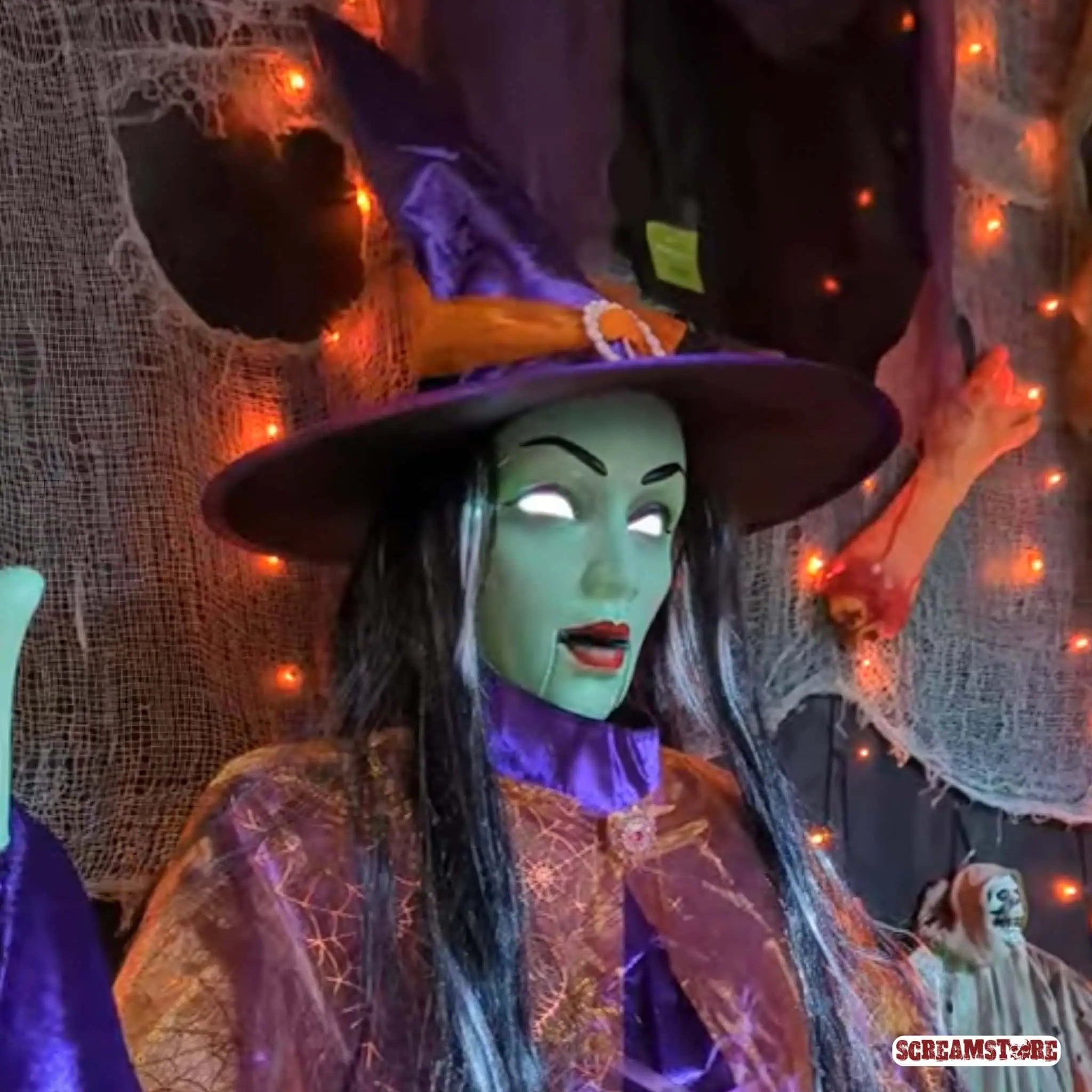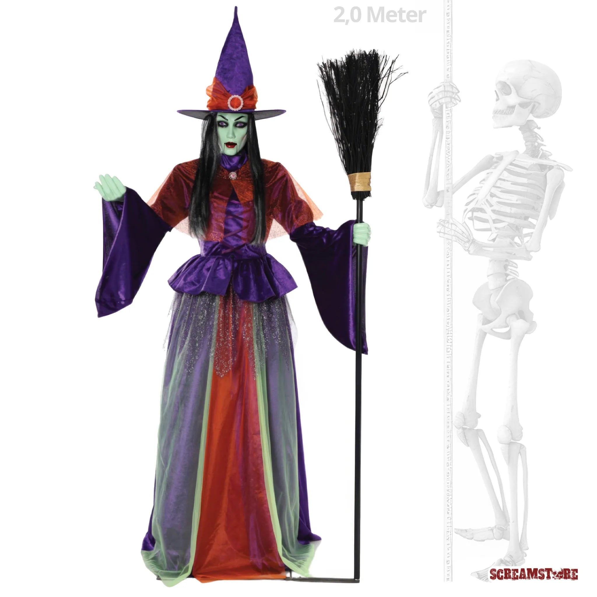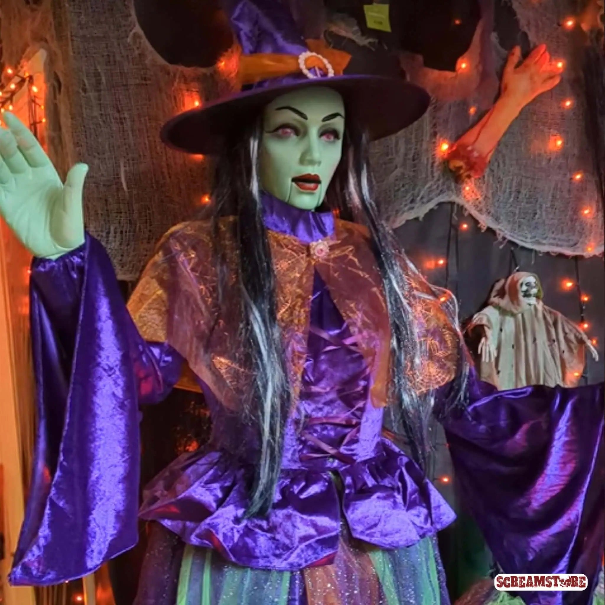 Hex Hex... diese Lady sieht neben unseren uralten Hexen eher betörend als verstörend aus. Aber lasst euch nicht um den langen Zauberstab wickeln. Die hübschen sind die Durchtriebensten. Und die Opfer dieser Lady kaum zählbar. Eine echt coole über 2 Meter große sündhaft schöne Figur. Der Mund bewegt sich zur Sprache und der Mix aus Mannequin und Hexe kommt verstörend gut auf jeder Party. Mal was ganz anderes und magisch mystisch eine zauberhafte Bereicherung jeder Halloween Horror Deko. It's magic!